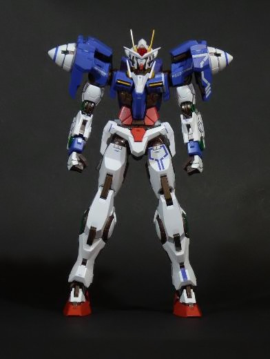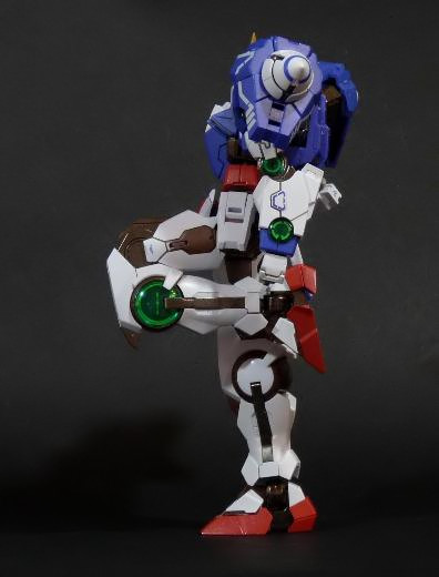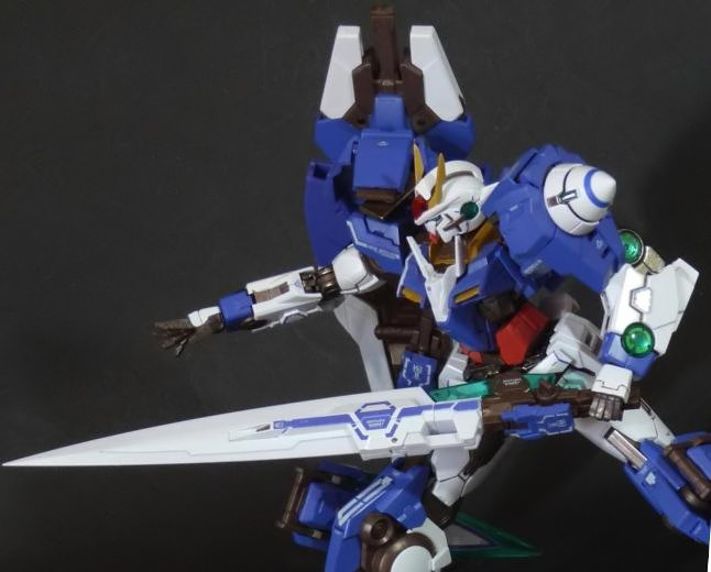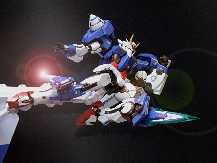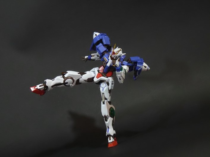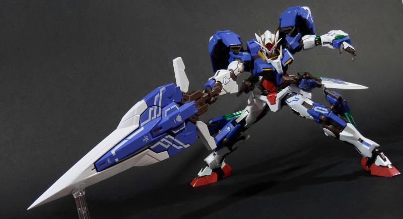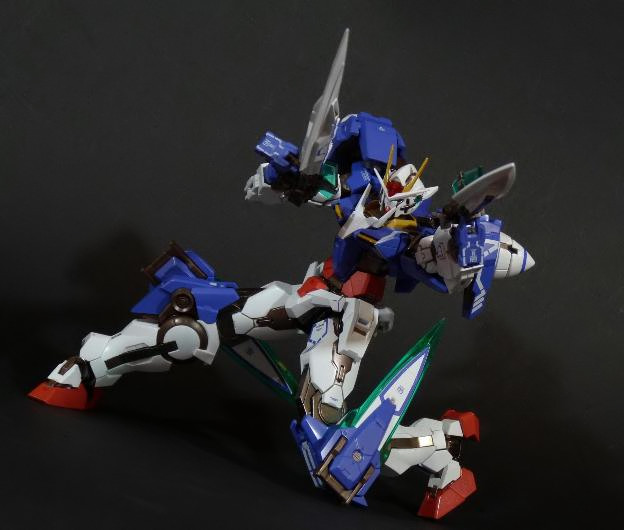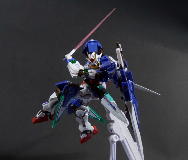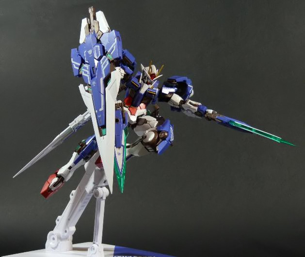 La funzionalità a cui facevo cenno poc’anzi è presto spiegata: concepito in questo modo, lo 00 Gundam “Seven Sword” è dotato di posabilità e stabilità eccellenti: le combinazioni possibili sfruttando la grandissima quantità di snodi (tutti ad attrito) sono impressionanti, e le pose anche più estreme e bellicose sono supportate dall’ottimale distribuzione dei pesi. Da questo punto di vista è un modello davvero riuscito, come è giusto che sia, vista l’enorme esperienza di Bandai in materia gundamica, che spazia dai noti model kit ad una enorme pletora di modelli come i già citati GFF Metal Composite, i Metal Material e così via.
