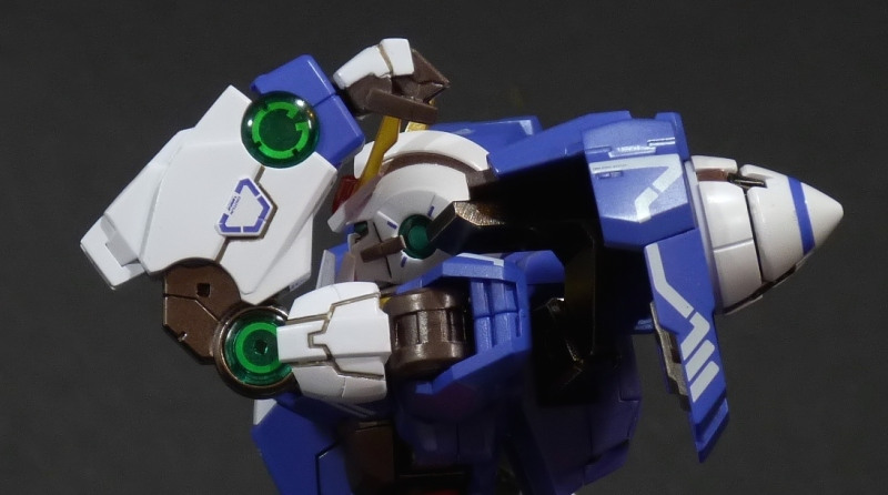 Andiamo nel dettaglio: per quanto riguarda la testa, essa può effettuare una rotazione completa di 360°, può essere inclinata più che discretamente verso l’alto, il basso e anche leggermente in senso laterale; tutto ciò è reso possibile dalla presenza di due micro-snodi che costituiscono la parte interna del collo. Vi consiglio di manipolare con cura questa parte, non perché sia particolarmente delicata, ma, viste le numerose “corna” e sporgenze appuntite che possono anche cozzare tra di loro, meglio evitarsi fastidiosi episodi. Discorso particolare meritano le spalle: permetterebbero alle braccia estensioni laterali e movimenti completi per avanti-alto-dietro, ma esse devono sobbarcarsi l’ingombrante presenza dei moduli GN-Drive posti proprio sopra di esse. Queste due vistose protuberanze coniche rappresentano dei potentissimi generatori perpetui d’energia, ed ostacolano la corsa delle braccia verso l’alto. Tuttavia, essi sono posti su un’impalcatura parzialmente metallica che ne permette lo spostamento all’indietro tramite una rotazione, così da liberare i movimenti degli arti superiori, senza sacrificare granchè l’estetica. Anzi, forse arricchendo ulteriormente il sapore hi-tech che pervade il mecha design e che personalmente adoro. Questa zona nasconde anche un altro paio di chicche, ma ve le lascio scoprire da soli: se siete appassionati della serie, o di Gundam in generale, apprezzerete certi dettagli.
