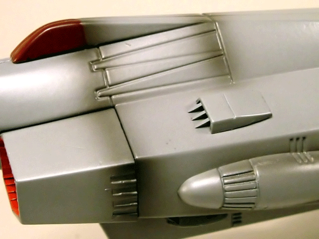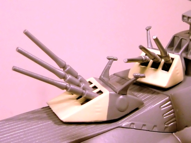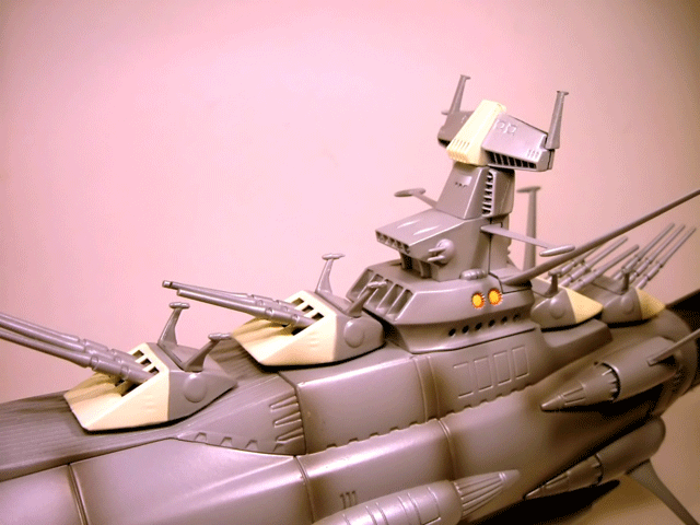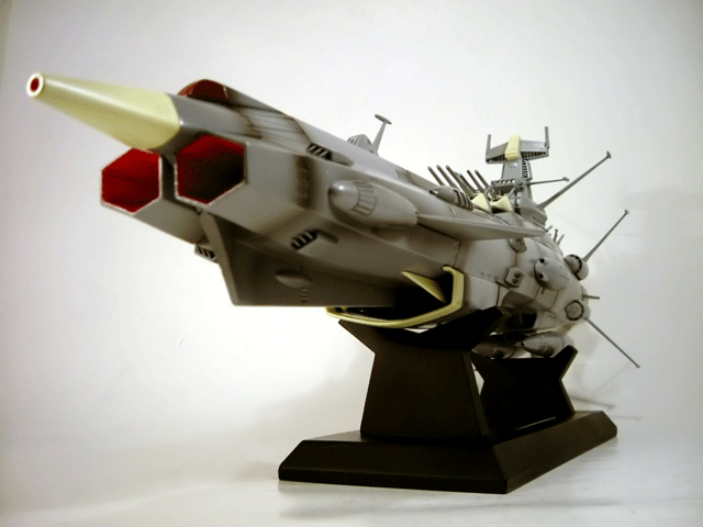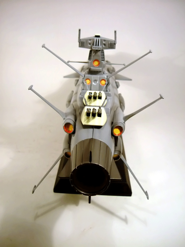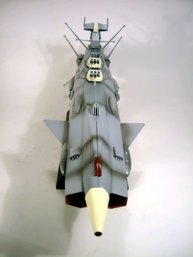 L'astronave è chiaramente molto pesante (è pur sempre un Daigokin) e indipendentemente da quanto riportato sulla scatola la mia personalissima bilancia indica 905 grammi. La lunghezza è invece confermata, 45 cm (in pratica scala 1:610 dato che l'astronave ha una lunghezza ufficiale di 275 metri), rappresentando tra le spaceships che possiedo quella dalle dimensioni certamente più cospicue. Ciò che meraviglia è invece il peso del display stand, questo, completamente nero, è realizzato con uno strano materiale sintetico simile alla pietra e pesantissimo, da solo sposta la lancetta della bilancia sui 540 grammi. Ha una base rettangolare di 20 x 9 cm e su di essa è applicata una targhetta metallica su cui è indicato in giapponese il nome del soggetto. Le antenne da applicare si attaccano con facilità e sono in plastica rigida, credo che sarebbe stato più intelligente se fossero state realizzate in plastica più morbida o in pvc, così da minimizzare i rischi di rotture accidentali. In plastica sono anche le batterie di cannoni, queste sono mobili, le torrette ruotano di 120 gradi circa e i cannoni sono indipendenti l'uno dall'altro potendo essere spostati singolarmente in alto e in basso. Occhio comunque a maneggiarli, soffrono di una certa delicatezza a livello delle antennine che li sormontano, quelle di una delle due torrette anteriori infatti si sono staccate mentre la spostavo. Poco male, basta una goccia di colla per plastica e tutto torna come nuovo ma ricordiamoci che stiamo pur sempre parlando di un oggetto che costa ben più di 300 euro e che quindi certe cose non si dovrebbero verificare. La verniciatura è ottima e distribuita in strato sufficientemente spesso ed uniforme, molto buona in ogni dettaglio, anche a livello delle invecchiature distribuite lungo le pannellature principali e non presenta particolari irregolarità, lo stesso dicasi per la verniciatura gialla in corrispondenza dei reattori. Accanto alla space battleship Yamato bpx-01 Bandai va a comporre un duo spettacolare, le invecchiature la rendono infatti meglio accostabile a quest'ultima, essendo anch'essa ricca di pannellature che le conferiscono un aspetto usurato dal tempo. Il corpo centrale è totalmente in metallo e comunque non è pieno ma presenta parti cave, in particolar modo nella porzione centrale del ponte. La torretta principale e tutte le appendici più esterne sono in materiale plastico. Complessivamente stiamo quindi parlando di un buon prodotto anche se c'è una cosa che non ho davvero digerito e che in un articolo "di elite" come vuole essere questo Daigokin non è francamente accettabile, sto parlando di quella evidente e bruttissima linea di giunzione tra le due metà dell'astronave che ne percorre il ponte longitudinalmente dal muso fino alla coda, cosa che in un'astronave Aoshima, tanto per fare un esempio, non si è mai vista essendo questi tipi di dettagli curati in modo più intelligente e meno vistoso. A questo punto un paragone con altri prodotti dello stesso livello diventa doveroso. Premesso che considero Aoshima la numero uno nella produzione delle astronavi (di gran lunga superiore anche a Bandai) c'è da chiedersi se valga la pena spendere per questa Andromeda solamente perchè appartenente alla serie Daigokin una cifra con cui potremmo tranquillamente acquistare 2-3 signore astronavi Aoshima. Badate, non sto dicendo che questa Andromeda mi ha deluso, sto affermando solamente che il prezzo è assolutamente eccessivo per ciò che questo modello è effettivamente. Se poi vogliamo infierire dicendo che le astronavi Aoshima sono spesso dotate anche di led luminosi (cosa di cui non vi è la men che minima traccia su questa spaceship) e di altre piccole chicche tipo miniature oltre ad avere probabilmente una percentuale di metallo più alta (il Super Atragon lungo 5 cm meno pesa appena 5 grammi in meno!), facciamolo pure.