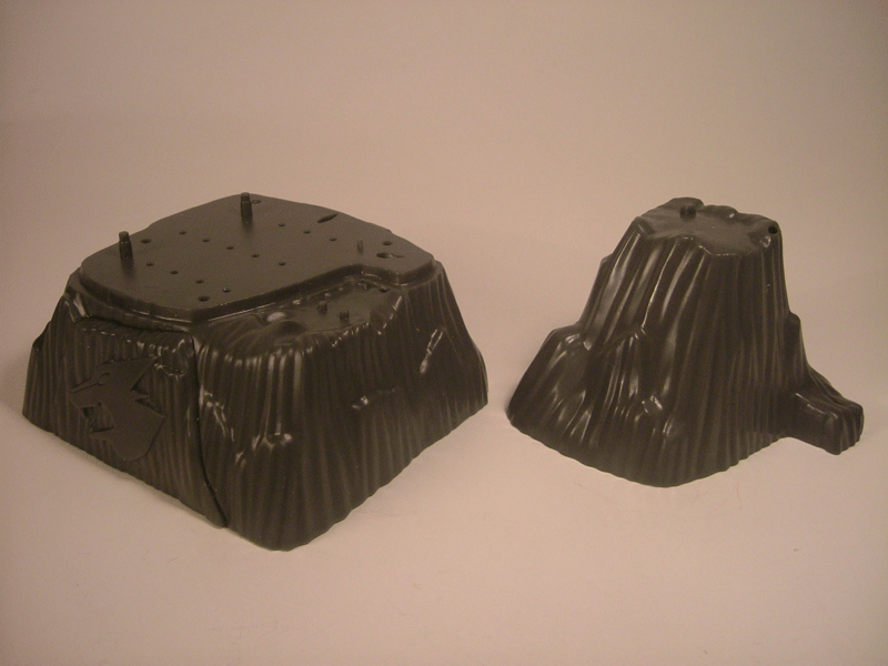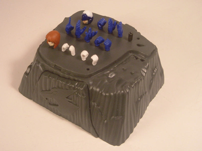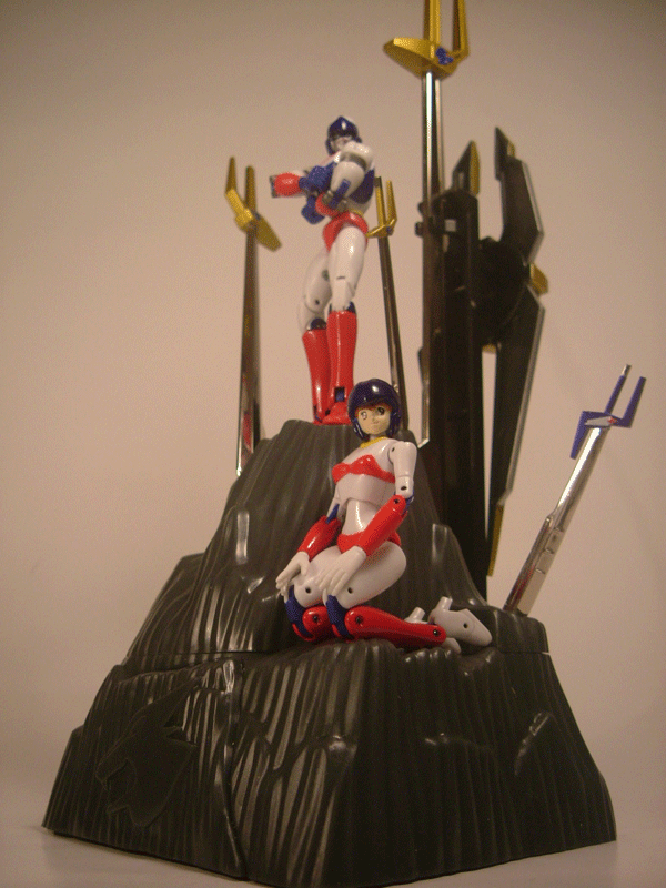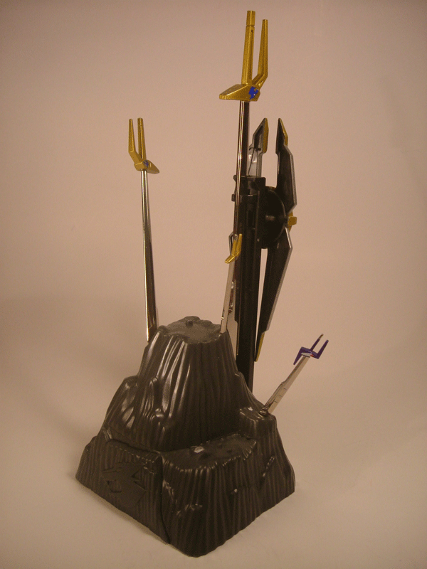 Lo stand si articola in 2 ripiani all'interno dei quali sono alloggiabili le varie coppie di mani e le 2 teste intercambiabili di Rom e Leina. Le 3 spade più piccole possono essere esposte piantandole sulla collinetta stessa negli appositi alloggiamenti. Volendo è possibile applicare allo stand un sostegno che permetta anche l'esposizione dello scudo del Kenryu e della spada del Baikanfu. In pratica questo porta-accessori si dimostra molto utile dal punto di vista pratico permettendo di alloggiare tutto l'equipaggiamento in dotazione e non costringendo a recuperare ogni volta la scatola qualora si desideri modificare posa al modello.