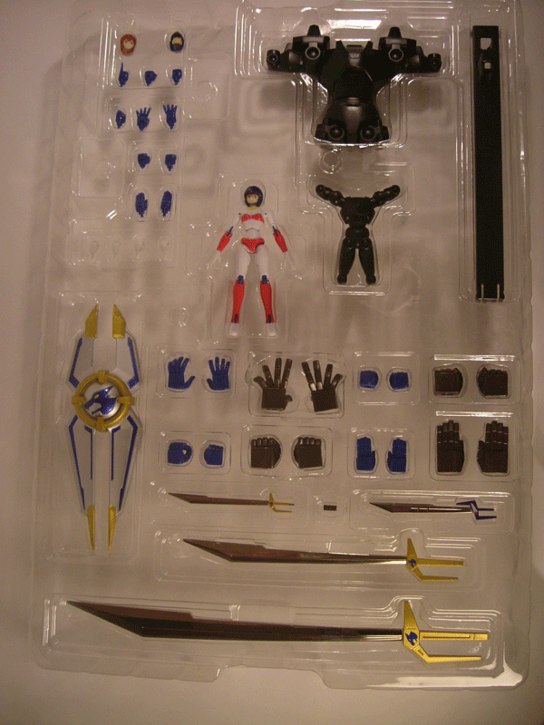 - Un grande blister in plastica trasparente contenente: la miniatura di Leina, 4 spade (una per ogni soggetto), 2 dummy parts di plastica nera, lo scudo per il Kenryu, il sostegno per l'esposizione dello scudo del Kenryu e della spada del Baikanfu sul display stand, 4 paia di mani intercambiabili per il Baikanfu, 4 paia di mani intercambiabili per il Kenryu, 2 paia di mani intercambiabili per Leina, 5 paia di mani intercambiabili per Rom, 2 teste intercambiabili, una per Rom e una per Leina.