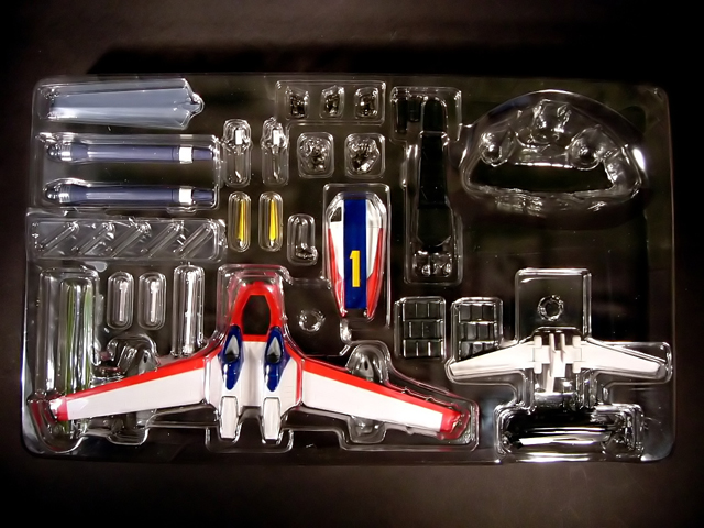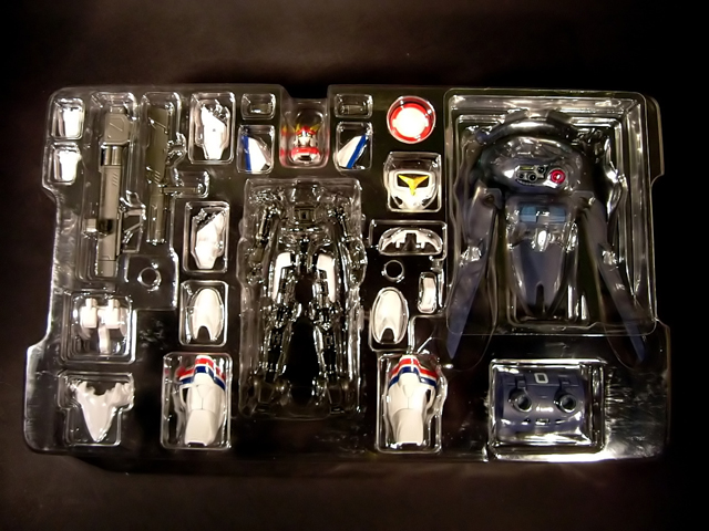 E' composto da due grandi blister in plastica trasparente impilati l'uno sull'altro che, accolti da un vassoio di cartoncino, occupano per intero la scatola. All'interno di quello superiore troviamo, nei relativi alloggiamenti, lo scheletro (posizionato centralmente e con pugni chiusi già applicati) e, localizzate tutte intorno a quest'ultimo, le varie parti dell'armatura da applicare costituite da gambe, cosce, bacino (suddiviso in 3 parti), torace (scomposto in 2 metà), spalle, avambracci e testa (con antenne in pvc morbido già montate). Tra gli accessori, molto abbondanti, abbiamo nell'ordine: una throwing bomb, l'hand rail gun (il fucile), il bazooka e il corpo principale del Cavalier 0 scomposto in due parti. Il resto della dotazione del modello alberga nel secondo blister, posizionato sotto a quello appena descritto, in esso trovano alloggiamento le mani accessorie (1 paio aperte, 1 paio per l'impugnatura di coltelli e spade, una mano destra per l'impugnatura del fucile), 2 beam saber ed i relativi manici, il manico del beam lancer, 5 caricatori di riserva per il fucile, un paio di assault knives (i coltelli), il lifter scomposto in due parti, lo scudo ed il relativo manico, il pannello posteriore ed i cannoni del Cavalier 0, un paio di antenne in plastica rigida di ricambio, 4 panneli ed un braccio in plastica nera. Queste ultime parti, una volta montate sulla basetta (posta sotto questo secondo blister in una bustina di plastica trasparente ad esso ancorata con del semplice scotch), forniscono un espositore pratico e funzionale che riproduce la rampa di lancio del robot e tale da consentire suggestive esposizioni in pose di volo. Anche in questo caso non poteva mancare il libretto illustrativo, molto semplice e schematico ma comunque esaustivo.