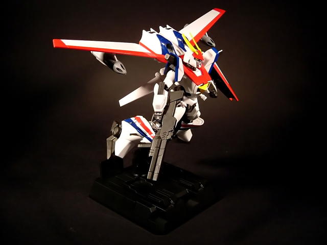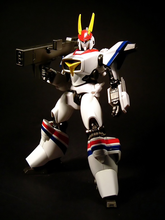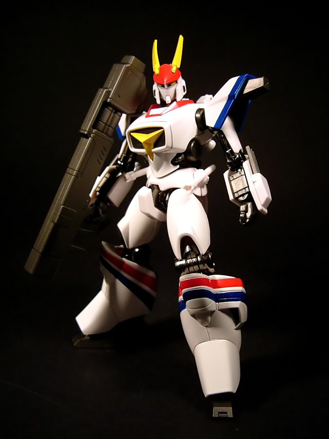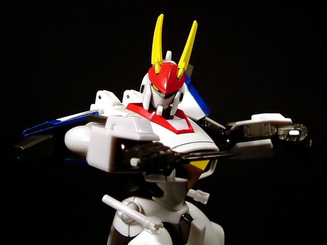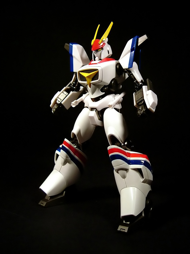 In linea con i precedenti Layzner e Dragonar sfornati per la medesima serie, questo XS-06 si caratterizza per altezza e composizione analoghi presentando dimensioni piuttosto contenute (14 cm, 16 cm circa alla punta delle antenne) e una concezione strutturale in cui le parti dell'armatura, in plastica, debbono essere montate su di uno scheletro prevalentemente anche se non esclusivamente in metallo esattamente uguale a quello dell'XS-05. E' proprio l'inner frame (in metallo a livello di gambe, cosce, bacino e braccia ma con piedi, torace e avambraccia in plastica) a fornire il grosso del peso al nostro modello spostando da solo l'ago della bilancia sui 112 grammi quando, ad armatura montata (senza ali ne' cavalier) si arriva a 148 grammi. In parole povere lo scheletro costituisce il 75% circa del peso globale. Il montaggio è relativamente semplice e rapido oltre ad essere ben indicato sul libretto di istruzioni. Se nel Dragonar opening silhouette (almeno nel mio esemplare) alcune parti soffrivano di una certa instabilità distaccandosi con sin troppa facilità (vedi uno dei due copripiedi) in questo caso non ho dovuto registrare problemi in tal senso, anche perchè i copripiedi a differenza dell'XS-05 non sono un elemento separato ma fanno parte integralmente del blocco della gamba per cui tutte le porzioni dell'armatura, una volta montate, rimangono ben solide nella loro posizione anche quando si cambia posa al modello. La verniciatura delle singole parti è ben curata salvo qualche sporadica e modesta imperfezione (leggi piccole sbavature nelle linee blu e rosse delle gambe). La posabilità, molto soddisfacente, è garantita esclusivamente da articolazioni ad attrito rigide quanto basta. Le caviglie hanno movimenti di lateralità molto validi e le ginocchia si flettono a più di 90 gradi. Le anche sono mobilissime in ogni direzione, anteriore, posteriore e laterale e le cosce ruotano sul loro asse longitudinale. Il tronco è snodato a livello del passaggio bacino-addome con notevoli escursioni in flessione e nelle torsioni laterali. La spalla ruota a 360 gradi e si abduce a 90 gradi. I gomiti si flettono oltre i 90 gradi ed i polsi, governati da piccoli perni con articolazione a sfera, lasciano una sufficiente libertà di movimento alle mani la cui applicazione è peraltro relativamente agevole. Anche l'aggancio della testa al torace è garantito da una articolazione a sfera che permette rotazioni a 360 gradi e buoni movimenti di flessione anteriore e laterale, con minima estesione. I manici delle beam saber sono applicabili ai relativi alloggiamenti ruotabili sulle anche del robot con aggancio ben solido, lo stesso dicasi per i caricatori dell'hand rail gun a livello degli avambracci mentre i foderi per gli assault knives sono sulla supeficie posteriore della gamba. L'applicazione del lifter e del cavalier fila liscia senza particolari intoppi. In questo caso, a differenza della opening silhouette, ho apprezzato la possibilità di attaccare le ali senza che il fregio sul petto del robot venga coperto come avveniva, per l'appunto, nell'XS-05. L'aggancio del lifter è molto valido e la sua applicazione non comporta significativi sbilanciamenti del modello ne' rischi di sfregamenti tra parti con conseguenti scrostature di vernice. Le ali sono ripiegabili così come i propulsori e la verniciatura non ha difetti evidenti. Anche il Cavalier 0 è facilmente assemblabile ed agganciabile, ha i cannoni direzionabili grazie a snodi a sfera e, come prevedibile, è interamente in plastica. Se con le ali il modello fa certamente una gran bella figura, lo stesso non si può però dire per la versione potenziata con il Cavalier 0 in cui in parole povere sembra che al nostro povero Dragonar sia stata calata in capo una pentola a pressione. Se quindi non esporrò mai il mio XS-06 in questo assetto, fa comunque piacere, per completezza, sapere di avere comunque a corredo del gokin anche questo accessorio. Più che soddisfacente il numero di mani, 3 paia più una mano destra per l'impugnatura del fucile è una dotazione di tutto rispetto per la quale metterei la firma in qualsiasi modello. Quanto alle antenne il mio personalissimo consiglio è sempre lo stesso, usate quelle più morbide perchè se è vero che quelle più rigide hanno minor tendenza ad incurvarsi, è altrettanto vero che in caso di cadute o contatti accidentali le prime a farne le spese proprio queste ultime essendo maggiormente esposte al rischio rottura. Un cenno a parte deve essere fatto per la basetta espositiva che, per come è stata concepita, aiuta certamente a valorizzare il nostro modello con la possibilità di pose di volo molto dinamiche. Grazie ad alcuni piccoli pannelli riproduce la rampa di lancio del robot ed il braccio che consente di tenere in sospensione il gokin è snodato sia nel punto di attacco alla base (così da regolare l'altezza a cui lo si voglia esporre) che all'estremità opposta, dove si àncora peraltro solidamente e affidabilmente al robot (a questo livello il perno di aggancio presenta escursioni sia in senso antero-posteriore che laterale).
