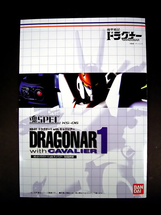 Molto carina e meno piccola di quanto credessi (37 x 21 x 9 cm). Caratteristica e già adottata per i precedenti SPEC la cover a strappo con velcro che, una volta aperta, scopre il contenuto, visibile attraverso finestrelle di plastica trasparente focalizzate sui singoli elementi presenti nella scatola. Sulla cover è ritratta, a destra, l'immagine del modello cui fanno da sfondo, spostandosi verso sinistra, altre due istantanee del robot, agganciato al cavalier e con le ali in posa di volo rispettivamente. In alto a sinistra sono stampati il logo della serie SPEC con il codice identificativo del modello stesso il cui nome è indicato, con caratteri più grandi, dallo stesso lato ma in basso. Nell'angolo in basso a destra, sopra al logo Bandai, fa invece mostra di se l'adesivo del trentennale Sunrise (che si celebrava per l'appunto, proprio nel 2007). La cover è peraltro illustrata anche sulla sua superficie posteriore, dove sostanzialmente viene evidenziata la struttura con inner frame metallico del modello e la presenza, tra i vari accessori, dei due principali mezzi di potenziamento, e cioè l'XC-00 Cavalier 0 e l'XDFU-01 Lifter 1 (in altre parole, le ali). Sul retro è invece raffigurato, in piccoli riquadri che contornano la grande immagine centrale del Dragonar che impugna la beam lancer, il ricco armamentario in dotazione.