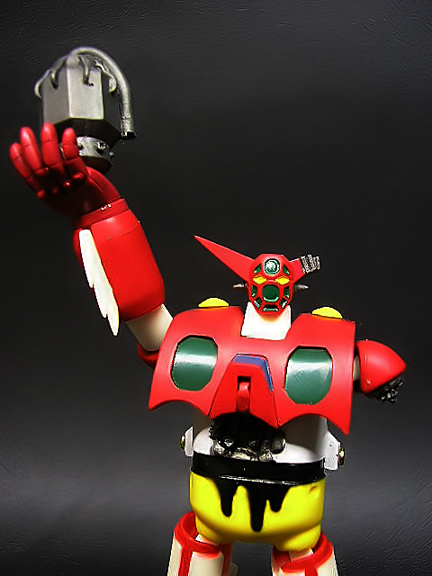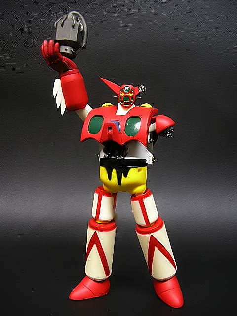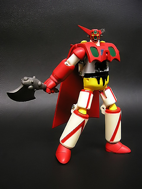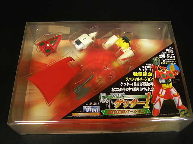 Nel 2003 Hajime Takashima pensò di allargare la base della sua clientela, includendovi coloro che desideravano un Getter trasformabile, ma non se la sentivano di investire un capitale nel Perfect Change Getter Robo.Nacque così la linea “Simple Change”, una serie di piccoli robot che dovevano replicare le trasformazioni viste negli anime, ma in maniera più… semplice, ricorrendo a parti aggiuntive, come pugni e piedi. Oltre alle dimensioni e ai gimmicks, anche i prezzi avrebbero dovuto essere più contenuti, benché modelli successivi come i Gravion difficilmente avrebbero potuto rientrare nella definizione di “economici”! Il primo robot della serie “Simple Change” fu l’SC-001 Getter One, nella versione tratta dai fumetti di Ken Ishikawa e dal restyle dell’OAV “The Last Day” e “Shin Getter vs. Neo Getter”. Si tratta di un piccolo e ingegnoso “toy” in grado di replicare la trasformazione delle tre Getter Machines nel solo Getter One. Dal medesimo stampo furono ricavate due edizioni limitate: “Mechanic” (300 pezzi) e “The Final Battle” (500 pezzi). Oggetto di questa recensione sarà proprio quest’ultimo, a ricordare la scena più epica del robot, il sacrificio del pilota Mushashi Tomoe che, strappando dal petto il generatore di raggi getter e sovraccaricandolo, si fa esplodere insieme ai Mechasaurus del Popolo Hachu!