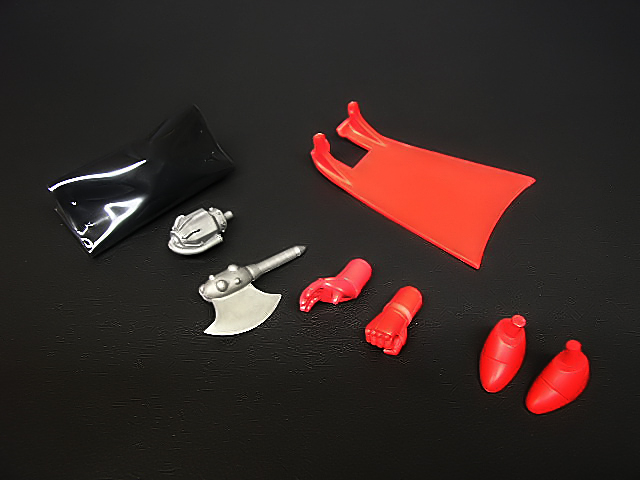 Una volta aperta la confezione, nella “vaschetta” del modello si rivela un compartimento, prima celato dall’adesivo nell’angolo inferiore destro. Questo contiene i piedi e le mani del modello (due, entrambe destre, una per impugnare il Tomahawk ed una a palmo aperto per il generatore) ed un sacchettino nero sigillato. Dentro quest’ultimo è celato il generatore che, in 1 esemplare su 50, è di resina gialla trasparente (a simulare il meltdown), mentre negli altri 450 esemplari (come il mio…) è semplicemente grigio.Come per tutti i modelli acquistati direttamente dal Mail Order dello Studio Halfeye, anche questa Limited Edition poteva essere dotata di un ulteriore oggetto: si tratta del Fluttering Mantle, il mantello svolazzante e strappato che il Getter esibisce negli OAV. Nella confezione sono comprese le istruzioni a colori del SC-001, ed un foglio specifico per questo SC-002, che funge da retro illustrativo della scatola. In questo, come in tutti i successivi SC, non è incluso il cacciavite necessario a stringere ed allentare le viti (peraltro poche).