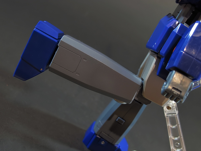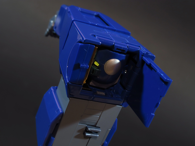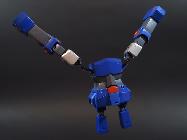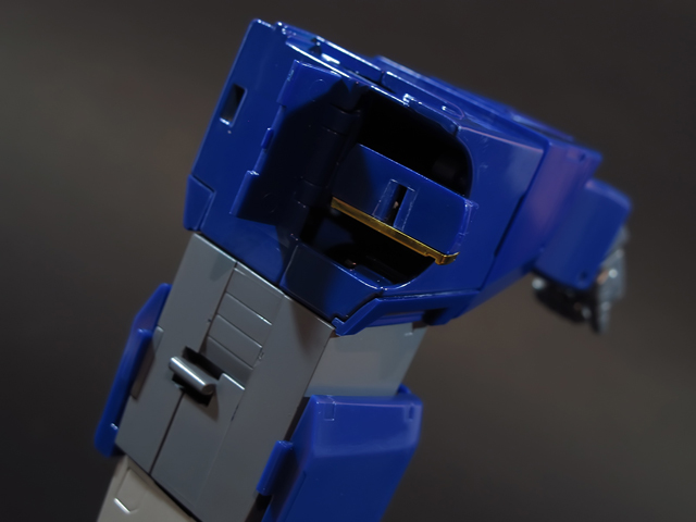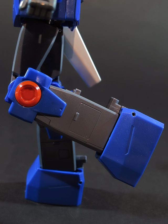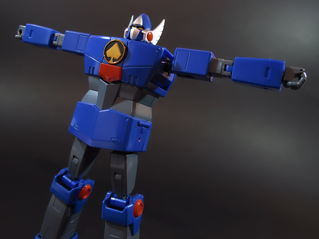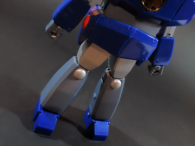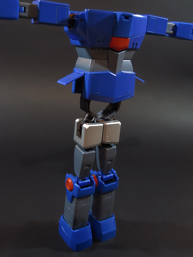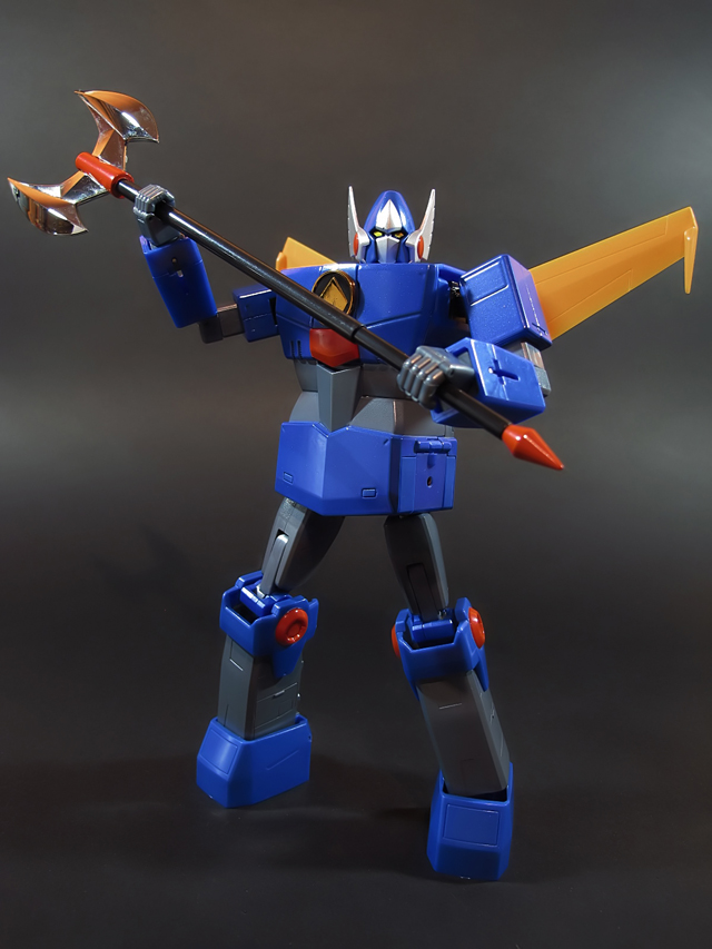 La fredda sensazione di metallo e di appagante consistenza ponderale che Aoider trasmette quando se ne afferra il tronco ci fa subito capire che a differenza del suo compare rosso, questo soggetto ha minori problematiche di familiarizzazione con il concetto di zama, e la bilancia non mente, i 282 grammi di peso per circa 20 cm di altezza ci fanno capire che finalmente la musica potrebbe cambiare. La quota di metallo, presente nell’intero blocco del tronco, in corrispondenza delle spalle ed a livello delle articolazioni di anche e spalle, rappresenta una percentuale nel complesso soddisfacente e comunque tale da rendere il modello degno del termine chogokin piuttosto che action figure. Ciò che balza però subito all’occhio è come il metallo, soprattutto se ripartito in modo squilibrato, finisca inesorabilmente per fare a cazzotti con la posabilità e ancor di più con la stabilità di un chogokin. L’Aoider, infatti, parrebbe avere in una estrema instabilità la sua principale pecca anche per il modo in cui, per necessità di trasfomazione, sono stati concepiti gli arti inferiori, apparentemente troppo esili ed instabili per dare un adeguato supporto al resto del corpo. Ma così non è, per fortuna. I tappi in dotazione con il modello per chiudere la pianta del piede ne migliorano, e di molto, il grado di stabilità, aiutati in questo da un piccolo perno in plastica che, applicato nel bacino del robot ne stabilizza le anche e ne ottimizza i movimenti. La verniciatura è buona, decisamente migliore di quella dell’Ace Redder, ed anche i distacchi dalle sprue, presenti solo sulla faccia posteriore e concentrati sulle parti blu, sono meno numerosi ed evidenti (principalmente piedi, ginocchia, margini inferiori degli avambracci), forse anche per il diverso colore delle plastiche in cui meno risaltano. Ancora una volta viene confermata la scarsa qualità dei materiali utilizzati, le venature che solcano la plastica blu colorata in pasta degli avambracci ma soprattutto dei pannelli ai lati della testa del robot sono, in una sola, semplice parola, brutte. Sulla posabilità abbiamo già detto qualcosa ma scendiamo nel dettaglio degli snodi. Le caviglie, per ragioni di trasformazione, sono cave e governate da uno snodo ad attrito localizzato sulla parte posteriore della gamba che permette movimenti di inclinazione discreti sull’esterno e modesti sull’interno anche se nutro qualche perplessità sulla eventuale tenuta nel tempo che con il passare degli anni potrebbe diventare scarsa per quelle che dovrebbero essere le necessità di carico dell’articolazione. Il ginocchio è a scatto e si flette fino a 90 gradi mentre l’anca, ad attrito, ruota sull’asse longitudinale a 360 gradi ma ha escursioni piuttosto limitate sia in flesso-estensione che in abduzione. Le spalle hanno uno snodo particolarmente rigido che funziona ad attrito in rotazione (movimento completo a 360 gradi) ed a scatto in abduzione (fino 90 gradi). Le braccia sono ruotabili longitudinalmente all’attacco con la spalla e le mani, come quelle dell’Ace Redder, non sono intercambiabili ma fisse e con snodo alle nocche ed alla base del pollice per permettere l’impugnatura delle armi. La testa ruota a 360 gradi presentando modesti movimenti sia in flessione ed estensione che di inclinazione laterale. Molto buona la fedeltà del soggetto all’anime, se infatti si escludono le cosce, forse un po’ tropo esili, è difficile eccepire qualcosa sulla rassomiglianza alla controparte animata. Le armi in dotazione, senza infamia e senza lode, sono l’alabarda ed il fucile con relativa fondina.