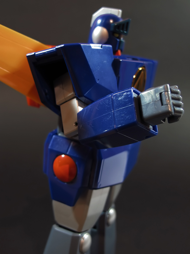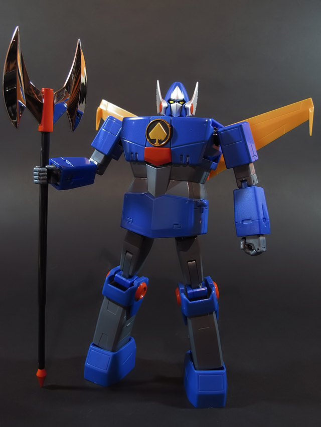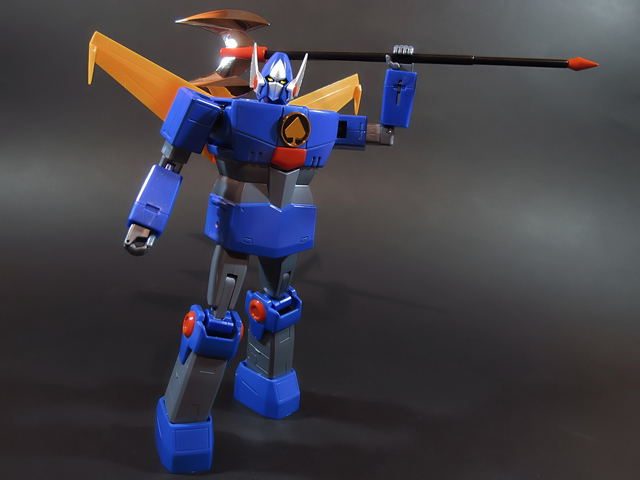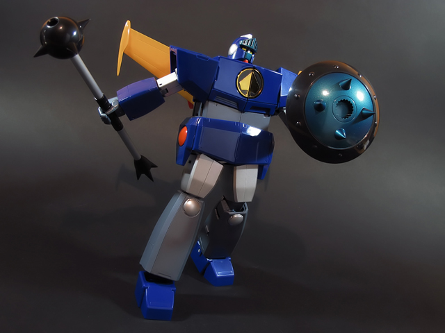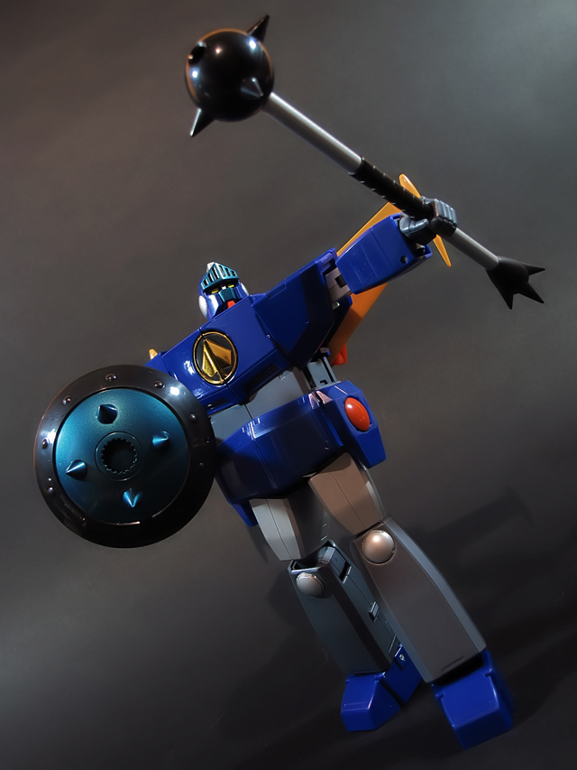 Toh?! Un chogokin! Perdonate l’ironia, ma il Cobalter, al terzo tentativo, riesce finalmente ad appagare in modo pienamente soddisfacente gli zama-dipendenti! 382 grammi per un’altezza di 19.5 cm evidenziano in modo chiaro la presenza in quantità adeguata di metallo, concentrato nelle gambe e nell’intero blocco del torace. La verniciatura è finalmente a livelli buoni anche se leggermente stona la differenza di tonalità del blu allo stacco torace-spalle per diversa composizione (torace in metallo, spalla in plastica). Pochi e ben celati i segni di distacco dalle sprue (superficie posteriore dei piedi e degli avambracci). Accettabile il grado di posabilità, buona la stabilità, ottima la fedeltà all’anime. Le caviglie sono cave ed il loro snodo a sfera, posizionato a metà del margine interno della gamba, assicura ampi movimenti di inclinazione interna e di rotazione a 360 gradi. Le ginocchia, ben solide, sono a scatto e si flettono ad angolo retto. L’anca, a frizione, ruota a 360 gradi ma ha minime escursioni sia in flesso-estensione che in abduzione vanificando in parte le buone prestazioni delle caviglie. Le spalle, ad attrito, ruotano liberamente e non si abducono oltre i 90 gradi in parte per effetto della loro conformazione anatomica che ne limita l’escursione sul piano frontale. Le braccia ruotano longitudinalmente a 360 gradi all’attacco con la spalla, i gomiti non si flettono oltre i 90 gradi ed i polsi sono parzialmente flessibili oltre che liberamente ruotabili. Anche in questo caso il robot è dotato di un paio di mani preapplicate con snodi alle nocche ed all’attacco del pollice alla mano. La testa ha movimenti minimi sia in flessione ed estensione che in inclinazione laterale mentre può ruotare senza problemi per l’intera circonferenza. Le armi in dotazione sono costituite da una mazza chiodata e da uno scudo. Una piccola nota a margine: una volta assemblato il vostro Daioja fate attenzione a come lo spostate e soprattutto evitate di strusciare i piedi sul piano d’appoggio. La pianta dei piedi del Daioja, infatti, altro non è che la superficie superiore delle spalle del Cobalter, graffiarla significherebbe danneggiare sensibilmente ed irrimediabilmente le spalle di quest’ultimo. Benissimo, chiusa con un sostanziale pareggio tra alti e bassi l’analisi dei 3 mecha separati, siamo pronti per passare al capitolo finale della nostra disamina, il Grande Sovrano, il Saikyo Robo Daioja. (