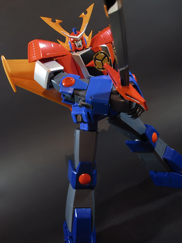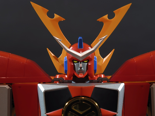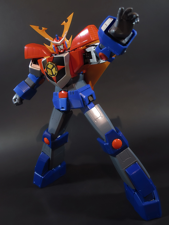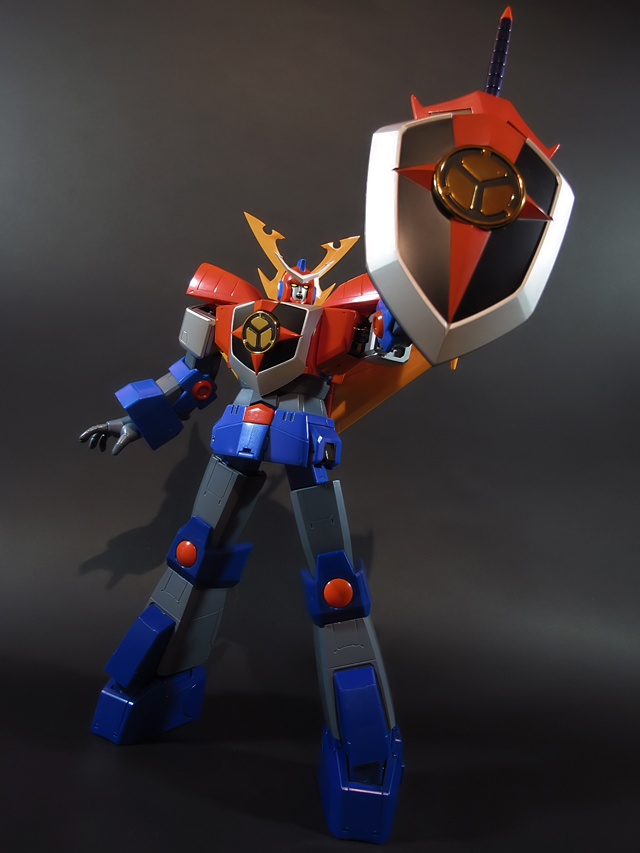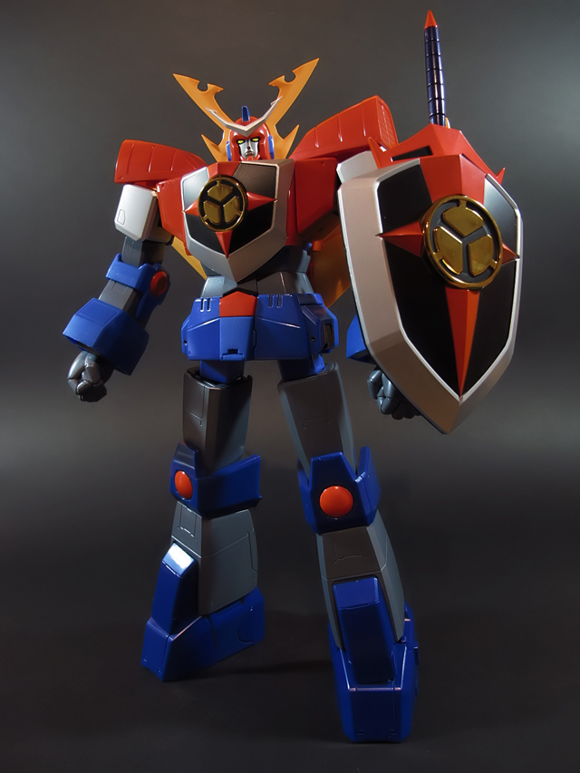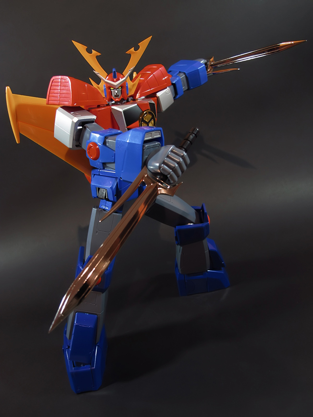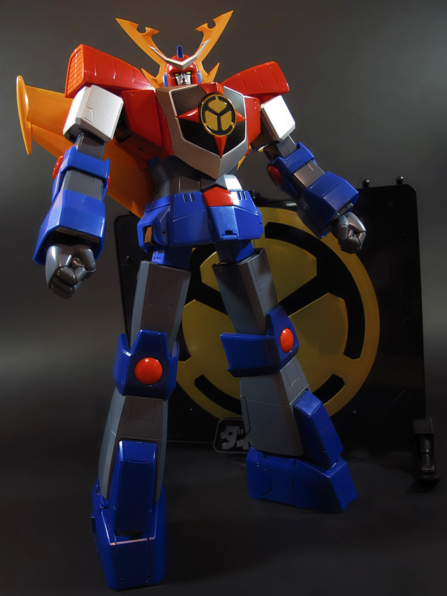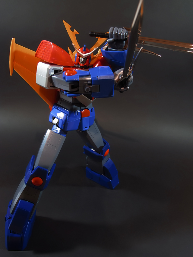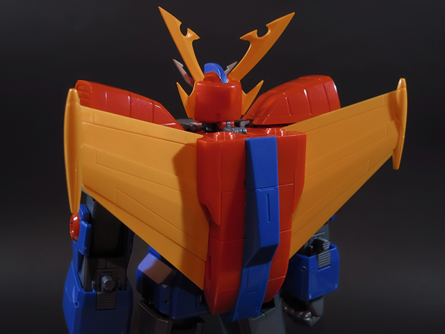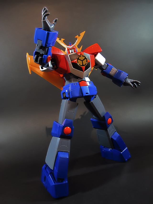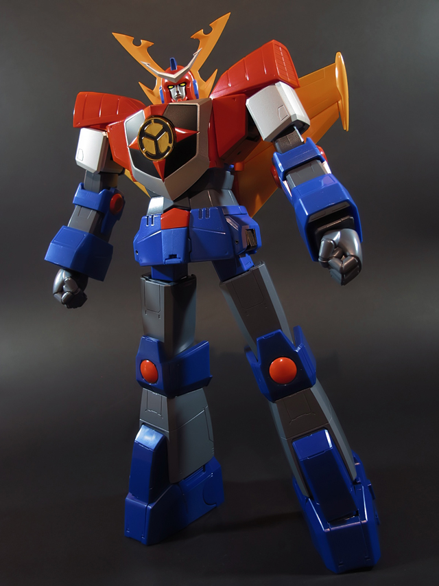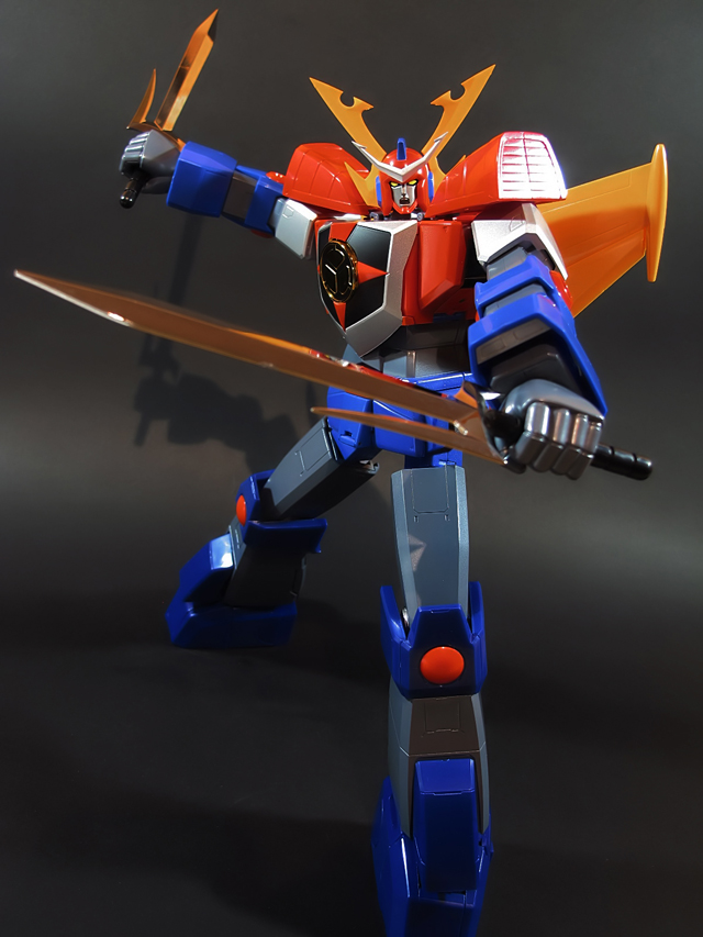 Bene, andiamo per gradi e cominciamo per ordine l’analisi dell’argomento principe di questa recensione: il gokin assemblato. Avviamo quindi la nostra disamina dal punto di partenza, e cioè la trasformazione del robot. Da questo punto di vista penso che stiamo parlando di quello che in assoluto è il vero, enorme punto di forza di questo chogokin. La conversione dei 3 mecha separati nelle varie parti del Daioja è qualcosa di sublime ed incredibilmente sorprendente, in particolar modo per la fedeltà all’anime, assolutamente ineccepibile al 1000% . Ed ecco che quasi per incantesimo, proprio come nel cartone, Ace Redder va a comporre torace e testa, Aoider diventa l’addome e le braccia e Cobalter si converte nelle gambe del grande Daioja. Se per soc trasformabili comunque assai validi una delle critiche più frequentemente ricorrenti era lo stravolgimento della reale sequenza di trasformazione (gruppo senza ombra di dubbio capeggiato dal controverso gx-43 Daimos) in questo caso penso che nessuno possa assolutamente eccepire niente. Davvero pazzesco il numero di comparti apribili, parti ribaltabili (carina l’idea del logo sul petto dell’Ace Redder, che riproduce una foglia come quelli sul petto di Aoider e Cobalter, ruotabile per riprodurre il logo del Daioja, che altro non è che il simbolo dell’unione delle 3 suddette foglie) e pannellini girevoli che in più punti arricchiscono il mecha senza il rischio di sfregamenti o graffi (purchè si abbia l’accortezza di seguire alla lettera il libretto di istruzioni) e che sottolineano uno studio più che minuzioso del connubio tra la fedeltà a quanto apprezzato in video ed un risultato estetico accettabile, sia per i 3 mecha scomposti che per il Daioja assemblato. Ovviamente sarebbe stato impossibile, per quest’ultimo, avere proporzioni assolutamente perfette, ecco che si è resa necessaria quindi la dotazione del modello in parti aggiuntive (come già avvenuto per il gx-46) indispensabili per renderne maggiormente proporzionate le fattezze. Tali parti sono costituite da spalle, coprispalle, gambe e superficie posteriore dei piedi. Fate però moltissima attenzione nell’applicazione delle coperture delle gambe, se non le si fanno combaciare perfettamente e si forza, il rischio è di sverniciare le gambe stesse (che non sono altro che le cosce del Cobalter). Bella anche l’unione delle ali dei 3 mecha in una sola grande ala per il Daioja. Disgraziatamente una delle due spalle rosse (le parti ai lati della pettorina per intenderci) mi si è letteralmente spappolata in mano dividendosi in due metà. Niente di grave ed istantaneamente riparabile con una semplice goccia di attack fortunatamente, ma nei vecchi SOC componibili queste cose non succedevano…. Ad ogni modo il risultato finale, di sicuro impatto estetico, è quello di un gigante dell’altezza di 29 cm per un peso, tutto sommato non così scarso, di 835 grammi. Uno dei principali dubbi che inizialmente attanagliava i collezionisti era relativo alla posabilità del modello una volta assemblato, non fosse altro che per l’estrema complessità della trasformazione. Bene, sotto questo punto di vista possiamo ammettere che il gx-61 ha passato la prova con una sufficienza abbondante. Le caviglie, ad attrito, sono estraibili e regolate da uno snodo praticamente analogo a quello già apprezzato nel gx-53 Daitarn 3, un piccolo cilindro localizzato nell’angolo posteriore interno del piede che permette, quando allungato, inclinazioni tutto sommato discrete (in questo caso minori di quelle della caviglia del gx-53 perché limitate dalle coperture delle gambe). Le ginocchia, a scatto, si flettono non oltre i 90 gradi. Per le anche (ad attrito) si deve fare invece un discorso a parte nel senso che presentano escursioni relativamente modeste (discreta abduzione, rotazione longitudinale nulla, estensione e flessione minime) se si lasciano applicati, al momento della trasformazione, i piedi del Cobalter. Se invece, come consigliato nel libretto di istruzioni, si ha l’accortezza di rimuovere questi ultimi, la musica cambia, e di molto, nel senso che l’articolazione finisce per guadagnare moltissimo in abduzione (in teoria il robot arriva a fare la spaccata), leggermente in flessione-estensione e minimamente in rotazione longitudinale anche se la sensazione (a onor del vero non confermata dai fatti) è che il modello possa pagare dazio a questa opzione almeno in termini di stabilità, apparentemente più precaria. La spalla è governata da una articolazione a scatto sia nei movimenti di rotazione (praticabili liberamente a 360 gradi) che in abduzione (estendibile poco oltre i 90 gradi). Le braccia ruotano longitudinalmente a 360 gradi all’attacco con la spalla ed i gomiti, a scatto, sono flessibili a 90 gradi. Le mani di base in dotazione ed alloggiate nei piedi dell’Aoider, sono articolate al polso con uno snodo a sfera ed hanno dita articolate separatamente alla base delle falangi. Sono sostituibili con 3 differenti paia di mani (chiuse a pugno, con palmo aperto e con foro centrale per l’impugnatura delle armi). La testa, articolata al torace con uno snodo a sfera, ha movimenti di rotazione dell’ampiezza di 120 gradi circa, si flette leggermente, non ha estensione ne’ flessione laterale. Nel complesso, concludendo, la posabilità del modello, considerata la complessità della sua trasformazione, non è neanche così male. Ciò che davvero in realtà è snervante (difetto confermato da molti ma non da tutti) è l’instabilità delle parti aggiuntive nei cambi di posa. Nel mio esemplare ogni tentativo di piegatura della caviglia o di abduzione della coscia si accompagna inevitabilmente alla caduta delle coperture delle gambe o a quella della parte posteriore del piede anche se devo sinceramente ammettere che ponendo particolare attenzione a far combaciare bene gli agganci tra la parte anteriore e quella posteriore delle coperture delle gambe la situazione un po’ è m