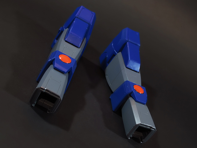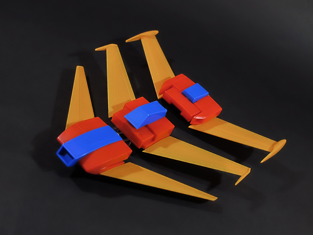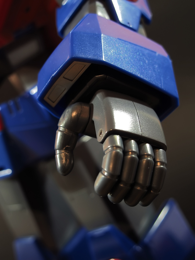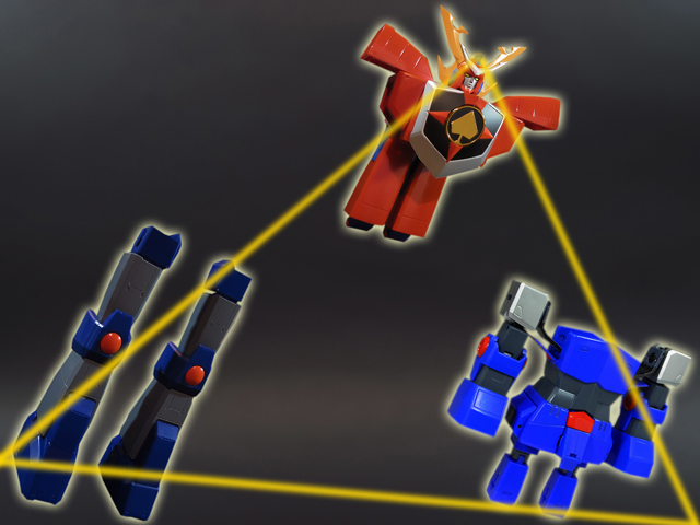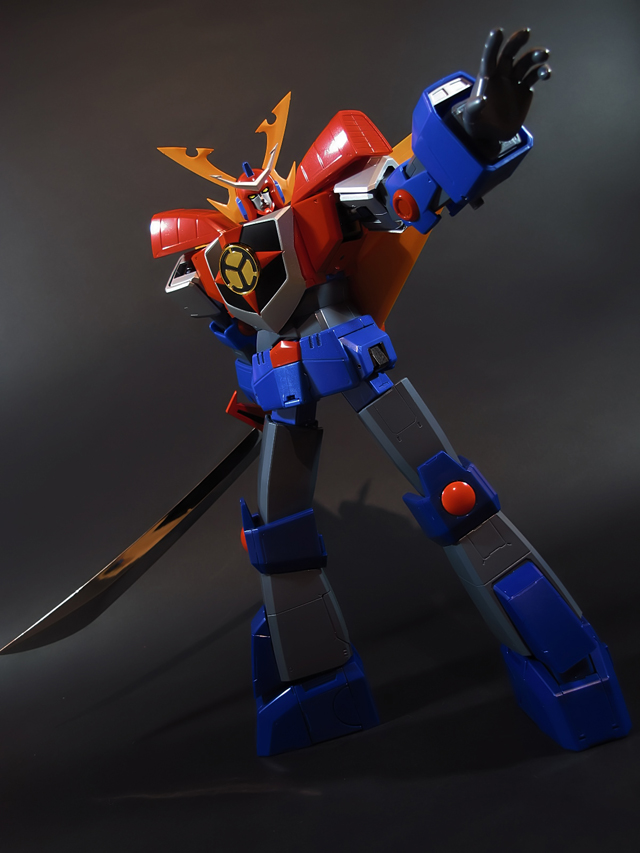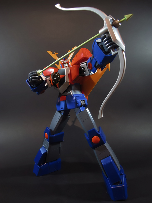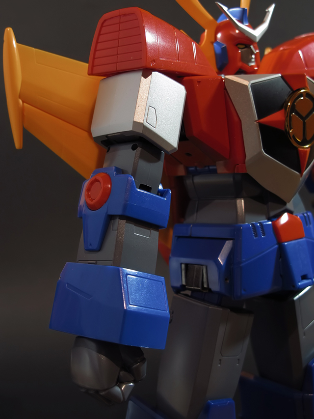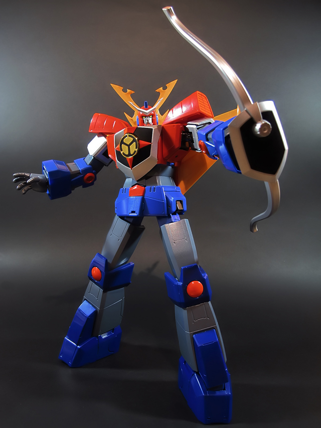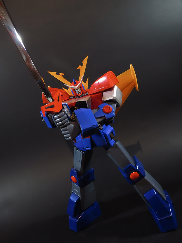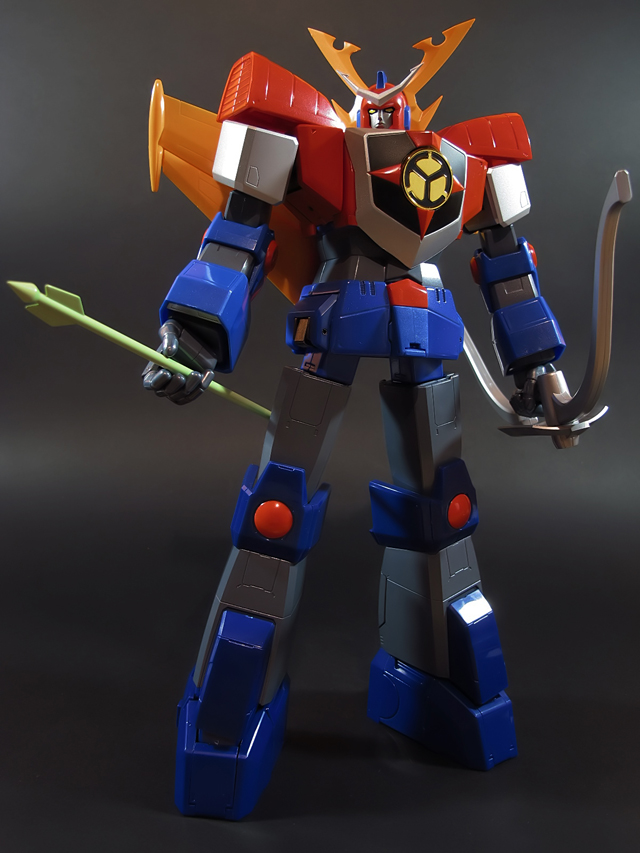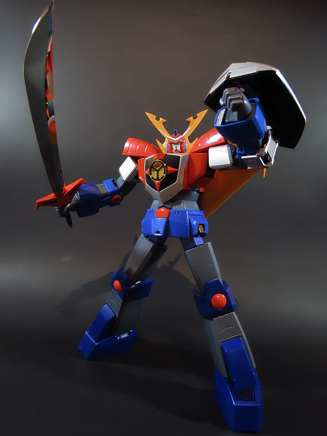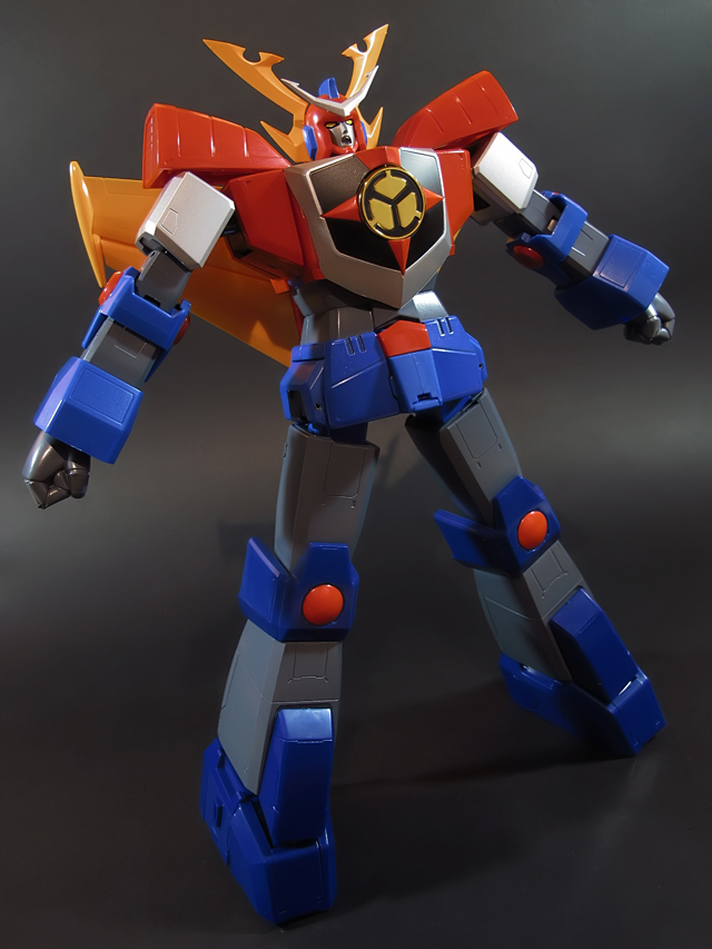 Bene, andiamo per gradi e cominciamo per ordine l’analisi dell’argomento principe di questa recensione: il gokin assemblato. Avviamo quindi la nostra disamina dal punto di partenza, e cioè la trasformazione del robot. Da questo punto di vista penso che stiamo parlando di quello che in assoluto è il vero, enorme punto di forza di questo chogokin. La conversione dei 3 mecha separati nelle varie parti del Daioja è qualcosa di sublime ed incredibilmente sorprendente, in particolar modo per la fedeltà all’anime, assolutamente ineccepibile al 1000% . Ed ecco che quasi per incantesimo, proprio come nel cartone, Ace Redder va a comporre torace e testa, Aoider diventa l’addome e le braccia e Cobalter si converte nelle gambe del grande Daioja. Se per soc trasformabili comunque assai validi una delle critiche più frequentemente ricorrenti era lo stravolgimento della reale sequenza di trasformazione (gruppo senza ombra di dubbio capeggiato dal controverso gx-43 Daimos) in questo caso penso che nessuno possa assolutamente eccepire niente. Davvero pazzesco il numero di comparti apribili, parti ribaltabili (carina l’idea del logo sul petto dell’Ace Redder, che riproduce una foglia come quelli sul petto di Aoider e Cobalter, ruotabile per riprodurre il logo del Daioja, che altro non è che il simbolo dell’unione delle 3 suddette foglie) e pannellini girevoli che in più punti arricchiscono il mecha senza il rischio di sfregamenti o graffi (purchè si abbia l’accortezza di seguire alla lettera il libretto di istruzioni) e che sottolineano uno studio più che minuzioso del connubio tra la fedeltà a quanto apprezzato in video ed un risultato estetico accettabile, sia per i 3 mecha scomposti che per il Daioja assemblato. Ovviamente sarebbe stato impossibile, per quest’ultimo, avere proporzioni assolutamente perfette, ecco che si è resa necessaria quindi la dotazione del modello in parti aggiuntive (come già avvenuto per il gx-46) indispensabili per renderne maggiormente proporzionate le fattezze. Tali parti sono costituite da spalle, coprispalle, gambe e superficie posteriore dei piedi. Fate però moltissima attenzione nell’applicazione delle coperture delle gambe, se non le si fanno combaciare perfettamente e si forza, il rischio è di sverniciare le gambe stesse (che non sono altro che le cosce del Cobalter). Bella anche l’unione delle ali dei 3 mecha in una sola grande ala per il Daioja. Disgraziatamente una delle due spalle rosse (le parti ai lati della pettorina per intenderci) mi si è letteralmente spappolata in mano dividendosi in due metà. Niente di grave ed istantaneamente riparabile con una semplice goccia di attack fortunatamente, ma nei vecchi SOC componibili queste cose non succedevano…. Ad ogni modo il risultato finale, di sicuro impatto estetico, è quello di un gigante dell’altezza di 29 cm per un peso, tutto sommato non così scarso, di 835 grammi. Uno dei principali dubbi che inizialmente attanagliava i collezionisti era relativo alla posabilità del modello una volta assemblato, non fosse altro che per l’estrema complessità della trasformazione. Bene, sotto questo punto di vista possiamo ammettere che il gx-61 ha passato la prova con una sufficienza abbondante. Le caviglie, ad attrito, sono estraibili e regolate da uno snodo praticamente analogo a quello già apprezzato nel gx-53 Daitarn 3, un piccolo cilindro localizzato nell’angolo posteriore interno del piede che permette, quando allungato, inclinazioni tutto sommato discrete (in questo caso minori di quelle della caviglia del gx-53 perché limitate dalle coperture delle gambe). Le ginocchia, a scatto, si flettono non oltre i 90 gradi. Per le anche (ad attrito) si deve fare invece un discorso a parte nel senso che presentano escursioni relativamente modeste (discreta abduzione, rotazione longitudinale nulla, estensione e flessione minime) se si lasciano applicati, al momento della trasformazione, i piedi del Cobalter. Se invece, come consigliato nel libretto di istruzioni, si ha l’accortezza di rimuovere questi ultimi, la musica cambia, e di molto, nel senso che l’articolazione finisce per guadagnare moltissimo in abduzione (in teoria il robot arriva a fare la spaccata), leggermente in flessione-estensione e minimamente in rotazione longitudinale anche se la sensazione (a onor del vero non confermata dai fatti) è che il modello possa pagare dazio a questa opzione almeno in termini di stabilità, apparentemente più precaria. La spalla è governata da una articolazione a scatto sia nei movimenti di rotazione (praticabili liberamente a 360 gradi) che in abduzione (estendibile poco oltre i 90 gradi). Le braccia ruotano longitudinalmente a 360 gradi all’attacco con la spalla ed i gomiti, a scatto, sono flessibili a 90 gradi. Le mani di base in dotazione ed alloggiate nei piedi dell’Aoider, sono articolate al polso con uno snodo a sfera ed hanno dita articolate separatamente alla base delle falangi. Sono sostituibili con 3 differenti paia di mani (chiuse a pugno, con palmo aperto e con foro centrale per l’impugnatura delle armi). La testa, articolata al torace con uno snodo a sfera, ha movimenti di rotazione dell’ampiezza di 120 gradi circa, si flette leggermente, non ha estensione ne’ flessione laterale. Nel complesso, concludendo, la posabilità del modello, considerata la complessità della sua trasformazione, non è neanche così male. Ciò che davvero in realtà è snervante (difetto confermato da molti ma non da tutti) è l’instabilità delle parti aggiuntive nei cambi di posa. Nel mio esemplare ogni tentativo di piegatura della caviglia o di abduzione della coscia si accompagna inevitabilmente alla caduta delle coperture delle gambe o a quella della parte posteriore del piede anche se devo sinceramente ammettere che ponendo particolare attenzione a far combaciare bene gli agganci tra la parte anteriore e quella posteriore delle coperture delle gambe la situazione un po’ è m