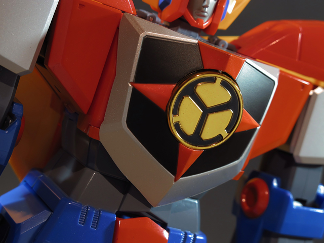 In questo caso penso sia giusto fare un piccolo cenno a parte relativamente allo stand espositivo di questo gx-61. Se infatti gli espositori dei precedenti SOC componibili/trasformabili con la verosimile unica eccezione del gx-34 non hanno mai brillato per fantasia e complessità, bisogna ammettere che stavolta Bandai ha fatto le cose per bene. In questo caso l’espositore infatti può essere adoperato in due modalità differenti dal momento che è costituito da due metà incernierate tra loro e quindi alternativamente apribili ad esporre il grande logo del robot per fare da sfondo allo stesso Daioja o richiudibili a libro l’una sull’altra per dare alloggiamento, come vero stand portaccessori, a tutte le mani, le parti aggiuntive e le armi (sia dei mecha scomposti che del Daioja) del modello.