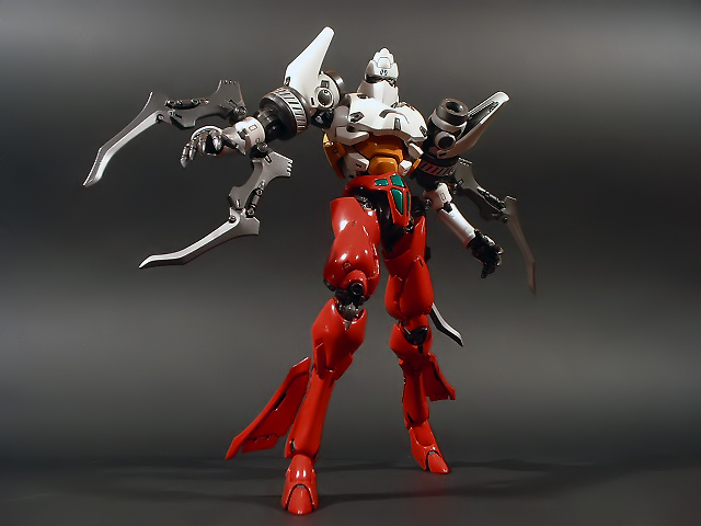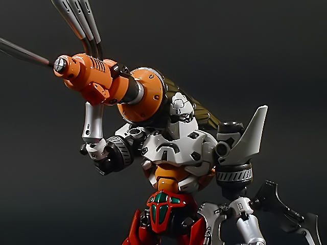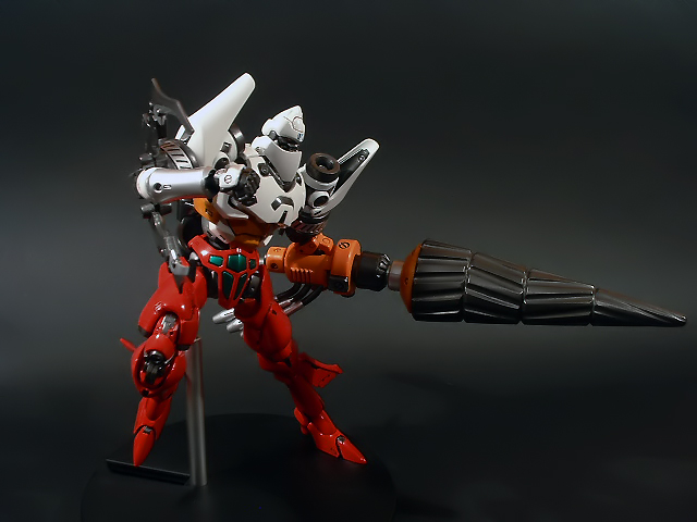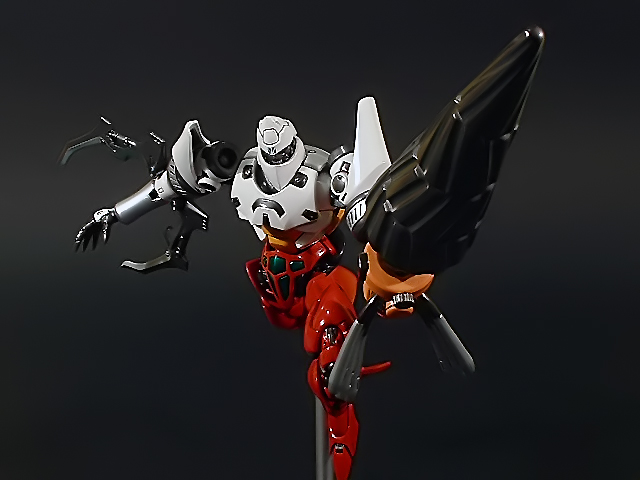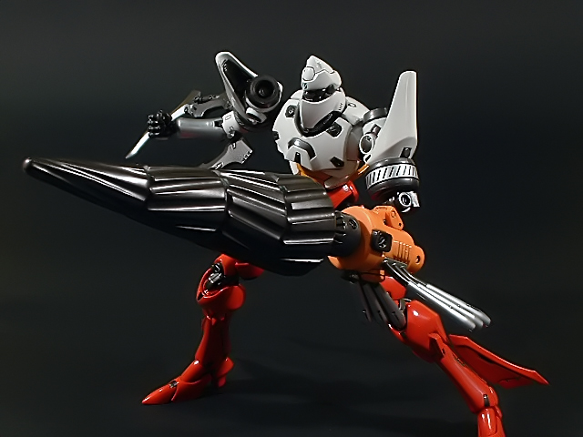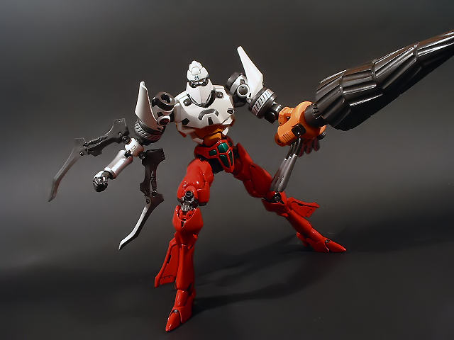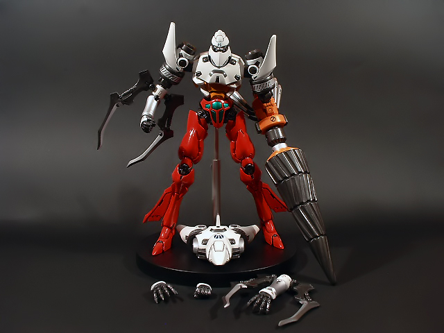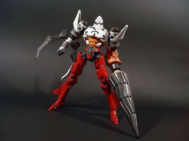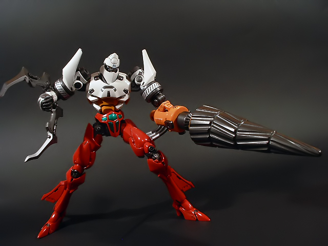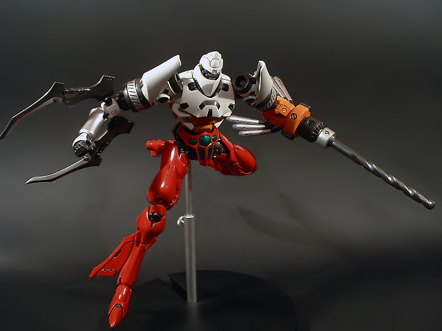 Altezza 25 centimetri per 625 grammi di peso, per testa, busto, spalle e dal ginocchio in giù abbiamo metallo, mentre braccia, trivelle, lame, alettoni e femori sono costruiti in plastica con alcuni particolari in gomma dura. Il livello di dettaglio è ottimo, anche le parti più piccole sono ben stilizzate, la verniciatura è di tonalità omogenea su tutto il modello e, cosa positiva, non si nota lo stacco di colore fra la plastica del femore e il metallo del resto della gamba. Nessuna sbavatura di colore sulla copia in mio possesso, però devo rilevare qualche piccolissimo grumo di vernice sulla Getmachine e dietro alla testa del Getter, nulla di eclatante comunque. La mobilità di questo Getter 2 Ex Gokin si attesta su buoni livelli, le gambe divaricano moltissimo grazie ad articolazioni a scatto molto potenti dando,teoricamente, al modello la possibilità di assumere pose molto dinamiche, peccato che le caviglie non godano di molta inclinazione. I piedi sono stretti quindi anche la superficie di appoggio non aiuta moltissimo nell’assicurare molta stabilità quando le gambe sono molto aperte. Abbiamo la possibilità di ruotare il femore sia internamente che esternamente, il ginocchio è dotato di doppio snodo, quando lo abbiamo piegato completamente entra in funzione la seconda articolazione che si trova proprio sopra di esso, questa fa si che la parte della gamba possa compiere una escursione all’indietro davvero notevole. Altra bella mossa è l’applicazione di un’articolazione separata per il movimento del bacino, mi spiego meglio, oltre alla normale possibilità di rotazione della gamba, possiamo inclinare avanti o indietro il solo bacino andando quindi a cercare il giusto equilibrio per la posa che abbiamo adottato in quel momento, questa soluzione è davvero molto gradita e non fa altro che donare sicurezza la dove i piedi non garantiscono una grande stabilità, diciamo che hanno compensato in parte il problema con questa soluzione. Le punte dei piedi sono snodate e si rendo molto utili quando il modello viene posizionato con un ginocchio a terra o viene messo in particolari posizioni mediante l’uso del Display Stand. Il busto del Getter 2 ha la possibilità di ruotare a destra e sinistra, anche qui doppio movimento grazie alla separazione in due parti distinte, possiamo ruotare molto la parte addominale, ma un po’ meno quella del torace, attenzione qui allo sfregamento con la parte rossa del bacino, ruotando troppo le parti vanno a sfregare una contro l’altra e di conseguenza si potrebbe incorrere in graffiature sulla vernice. Le braccia ruotano completamente, posso essere orientate in qualsiasi posizione si voglia grazie allo snodo a disco posto sotto alla spalla. Oltre alla rotazione è presente anche l’articolazione che permette la piega dell’avambraccio, ma anche per questa parte del corpo la Fewture ha concepito un doppio movimento disassando il gomito del Getter 2. Dove dovrebbe esserci di fatto il gomito c’è una parte rotonda che ospita l’aggancio delle lame laterali, quindi le due articolazioni che consentono il movimento sono poste sopra e sotto questa parte, in pratica piegando completamente l’avambraccio si ottiene quasi un’innaturale chiusura ad U. Anche le spalle godono di buona mobilità, possono avanzare in avanti ed arretrare oltre ad essere allargate notevolmente, essendo costruite in metallo lo snodo che permette i movimenti è a scatto, questo per garantirne la resistenza nel corso del tempo. Indovinate un po’, anche la testa ha doppio movimento, la parte superiore con la faccia del Getter s’inclina in alto ed in basso, mentre la copertura del collo compie anche il movimento d’inclinazione laterale. Il discorso della posabilità va obbligatoriamente scisso in due parti diverse, come ho scritto poche righe sopra le pose a terra non garantiscono molta sicurezza al modello, anche perché il peso del busto tende a schiacciare a terra il Getter 2 provocando un’ulteriore apertura delle gambe che qualche volta scivolano lasciando cadere il modello…..a me è capitato diverse volte purtroppo. Ben più sicura quindi diventa l’esposizione e la stabilità usando l’apposito Display Stand che troviamo nella confezione, qui ci si può davvero sbizzarrire nel replicare pose dinamiche veramente belle, il Getter è praticamente ancorato al supporto grazie al bloccaggio con incastro al bacino e chiusura a vite, quindi non c’è il mino pericolo di caduta del modellino, addirittura lo si può lasciare sospeso da terra senza alcun problema! Certamente l’ingombro aumenta parecchio dato che lo Stand non è piccolo avendo un diametro di 18 centimetri, ma io ne consiglio vivamente l’uso per evitare brutte sorprese! Gli accessori, come citato prima, sono in plastica e gomma dura, le lame che si agganciano alle braccia hanno un piccolo perno maschio che si aggancia alla sede posta ai lati dell’avambraccio, una volta montate possono essere anche allargate. Due trivelle per il nostro Getter 2, il fissaggio dell’accessorio avviane ad incastro, si smonta l’avambraccio desiderato e si applica l’estensione a trivella. Esteticamente molto bella con all’esterno 6 tubi di scarico come a voler sottolineare che all’interno ci sia un potente motore…diavolo di un Sato………Le punte in dotazione sono due, la più piccola ricorda praticamente una punta da trapano ed è parte integrante dell’accessorio, la seconda è molto più grande ed ha la classica forma a cono e va ad incastrarsi sopra a quella più piccola, in questo modo si ottiene un’enorme trivella dall’aspetto davvero devastante lunga ben 25 centimetri! Bisogna sottolineare però un aspetto negativo, montando la trivella più grande il peso aumenta e il braccio del Getter cede miseramente facendo cascare l’enorme accessorio, qui sarebbe stato molto utile un’articolazione a scatto che avrebbe certamente evitato il problema del peso. I pugni in dotazione sono interamente 