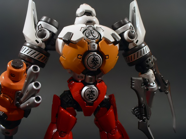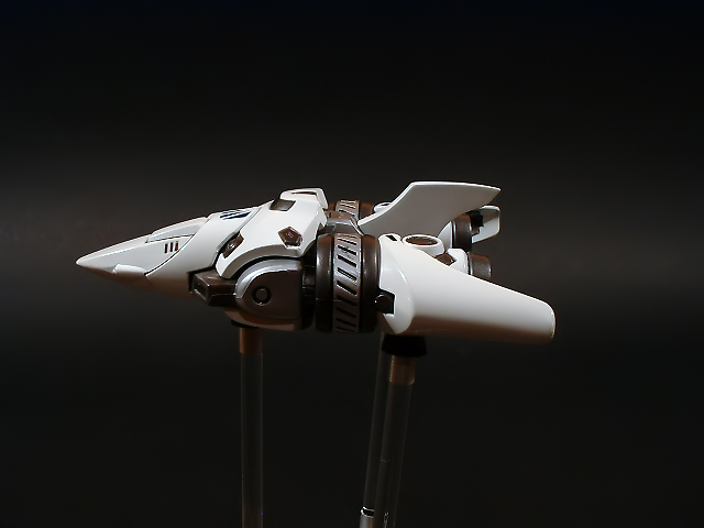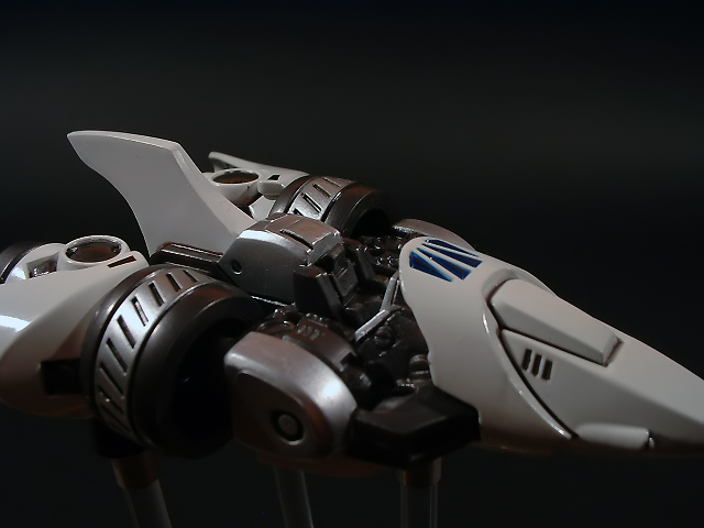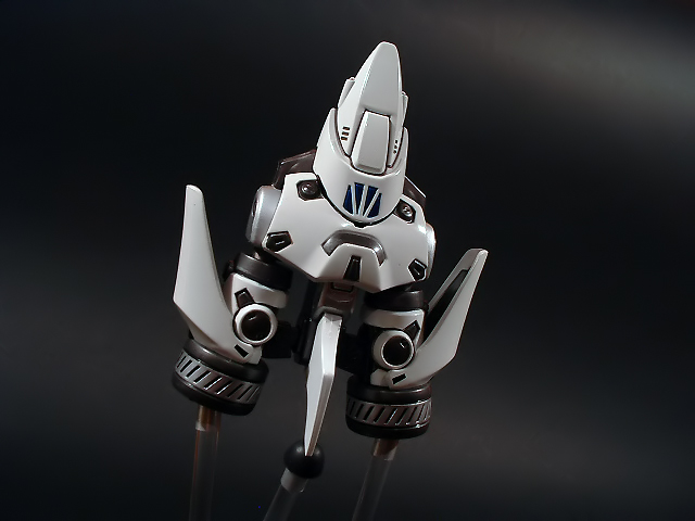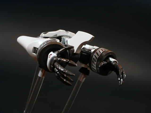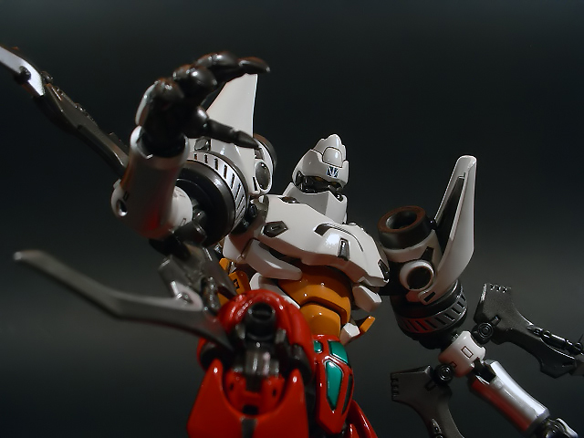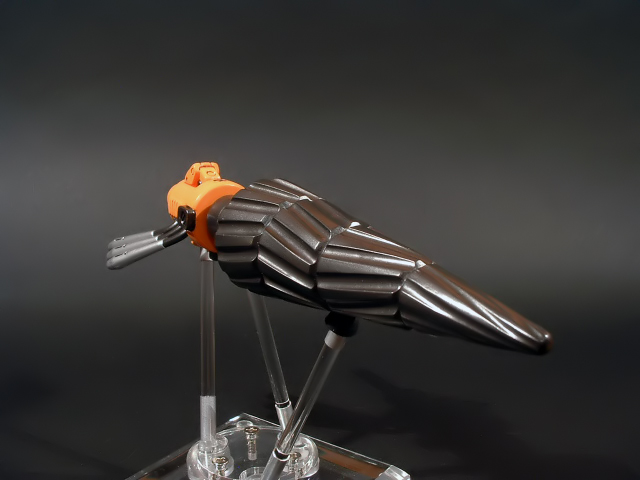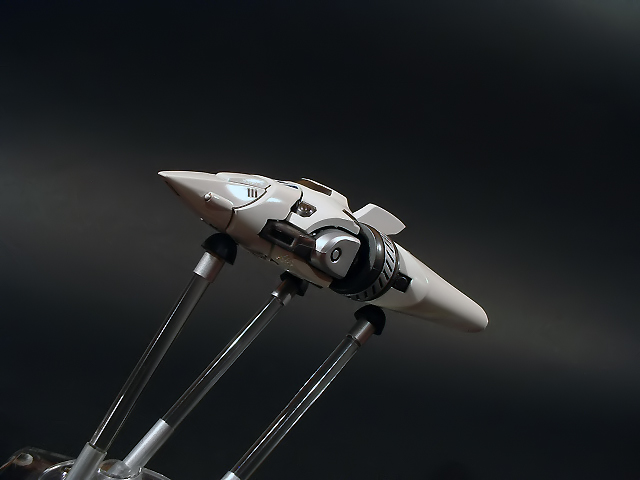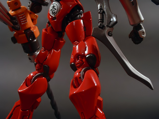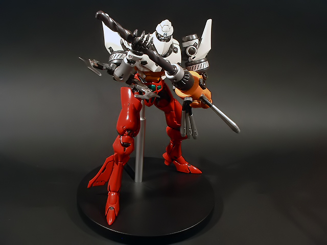 Altezza 25 centimetri per 625 grammi di peso, per testa, busto, spalle e dal ginocchio in giù abbiamo metallo, mentre braccia, trivelle, lame, alettoni e femori sono costruiti in plastica con alcuni particolari in gomma dura. Il livello di dettaglio è ottimo, anche le parti più piccole sono ben stilizzate, la verniciatura è di tonalità omogenea su tutto il modello e, cosa positiva, non si nota lo stacco di colore fra la plastica del femore e il metallo del resto della gamba. Nessuna sbavatura di colore sulla copia in mio possesso, però devo rilevare qualche piccolissimo grumo di vernice sulla Getmachine e dietro alla testa del Getter, nulla di eclatante comunque. La mobilità di questo Getter 2 Ex Gokin si attesta su buoni livelli, le gambe divaricano moltissimo grazie ad articolazioni a scatto molto potenti dando,teoricamente, al modello la possibilità di assumere pose molto dinamiche, peccato che le caviglie non godano di molta inclinazione. I piedi sono stretti quindi anche la superficie di appoggio non aiuta moltissimo nell’assicurare molta stabilità quando le gambe sono molto aperte. Abbiamo la possibilità di ruotare il femore sia internamente che esternamente, il ginocchio è dotato di doppio snodo, quando lo abbiamo piegato completamente entra in funzione la seconda articolazione che si trova proprio sopra di esso, questa fa si che la parte della gamba possa compiere una escursione all’indietro davvero notevole. Altra bella mossa è l’applicazione di un’articolazione separata per il movimento del bacino, mi spiego meglio, oltre alla normale possibilità di rotazione della gamba, possiamo inclinare avanti o indietro il solo bacino andando quindi a cercare il giusto equilibrio per la posa che abbiamo adottato in quel momento, questa soluzione è davvero molto gradita e non fa altro che donare sicurezza la dove i piedi non garantiscono una grande stabilità, diciamo che hanno compensato in parte il problema con questa soluzione. Le punte dei piedi sono snodate e si rendo molto utili quando il modello viene posizionato con un ginocchio a terra o viene messo in particolari posizioni mediante l’uso del Display Stand. Il busto del Getter 2 ha la possibilità di ruotare a destra e sinistra, anche qui doppio movimento grazie alla separazione in due parti distinte, possiamo ruotare molto la parte addominale, ma un po’ meno quella del torace, attenzione qui allo sfregamento con la parte rossa del bacino, ruotando troppo le parti vanno a sfregare una contro l’altra e di conseguenza si potrebbe incorrere in graffiature sulla vernice. Le braccia ruotano completamente, posso essere orientate in qualsiasi posizione si voglia grazie allo snodo a disco posto sotto alla spalla. Oltre alla rotazione è presente anche l’articolazione che permette la piega dell’avambraccio, ma anche per questa parte del corpo la Fewture ha concepito un doppio movimento disassando il gomito del Getter 2. Dove dovrebbe esserci di fatto il gomito c’è una parte rotonda che ospita l’aggancio delle lame laterali, quindi le due articolazioni che consentono il movimento sono poste sopra e sotto questa parte, in pratica piegando completamente l’avambraccio si ottiene quasi un’innaturale chiusura ad U. Anche le spalle godono di buona mobilità, possono avanzare in avanti ed arretrare oltre ad essere allargate notevolmente, essendo costruite in metallo lo snodo che permette i movimenti è a scatto, questo per garantirne la resistenza nel corso del tempo. Indovinate un po’, anche la testa ha doppio movimento, la parte superiore con la faccia del Getter s’inclina in alto ed in basso, mentre la copertura del collo compie anche il movimento d’inclinazione laterale. Il discorso della posabilità va obbligatoriamente scisso in due parti diverse, come ho scritto poche righe sopra le pose a terra non garantiscono molta sicurezza al modello, anche perché il peso del busto tende a schiacciare a terra il Getter 2 provocando un’ulteriore apertura delle gambe che qualche volta scivolano lasciando cadere il modello…..a me è capitato diverse volte purtroppo. Ben più sicura quindi diventa l’esposizione e la stabilità usando l’apposito Display Stand che troviamo nella confezione, qui ci si può davvero sbizzarrire nel replicare pose dinamiche veramente belle, il Getter è praticamente ancorato al supporto grazie al bloccaggio con incastro al bacino e chiusura a vite, quindi non c’è il mino pericolo di caduta del modellino, addirittura lo si può lasciare sospeso da terra senza alcun problema! Certamente l’ingombro aumenta parecchio dato che lo Stand non è piccolo avendo un diametro di 18 centimetri, ma io ne consiglio vivamente l’uso per evitare brutte sorprese! Gli accessori, come citato prima, sono in plastica e gomma dura, le lame che si agganciano alle braccia hanno un piccolo perno maschio che si aggancia alla sede posta ai lati dell’avambraccio, una volta montate possono essere anche allargate. Due trivelle per il nostro Getter 2, il fissaggio dell’accessorio avviane ad incastro, si smonta l’avambraccio desiderato e si applica l’estensione a trivella. Esteticamente molto bella con all’esterno 6 tubi di scarico come a voler sottolineare che all’interno ci sia un potente motore…diavolo di un Sato………Le punte in dotazione sono due, la più piccola ricorda praticamente una punta da trapano ed è parte integrante dell’accessorio, la seconda è molto più grande ed ha la classica forma a cono e va ad incastrarsi sopra a quella più piccola, in questo modo si ottiene un’enorme trivella dall’aspetto davvero devastante lunga ben 25 centimetri! Bisogna sottolineare però un aspetto negativo, montando la trivella più grande il peso aumenta e il braccio del Getter cede miseramente facendo cascare l’enorme accessorio, qui sarebbe stato molto utile un’articolazione a scatto che avrebbe certamente evitato il problema del peso. I pugni in dotazione sono interamente 
