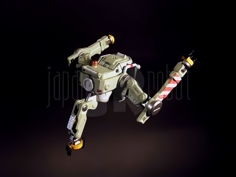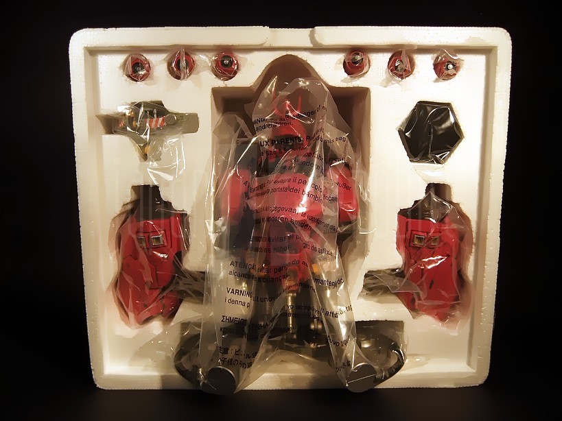 Il coperchio, molto spesso, presenta un alloggiamento centrale in cui, nella classica bustina di plastica trasparente sono accolti un cartoncino plastificato a colori con le specifiche tecniche già riassunte sull’esterno della confezione ed un foglio in bianco e nero piegato in 2 con le istruzioni relative a movimenti e compartimenti apribili. Tolto il coperchio dopo la rimozione delle larghe strisce di scotch che lo assicurano al resto del contenitore lungo i suoi 2 lati più lunghi, si accede al vano principale il cui alloggiamento centrale è occupato dal busto senza spalle, sistemate ai lati di questo. In alto i 6 funnels agganciabili al backpack sono accolti in vani separati. Al di sopra delle spalle si trovano rispettivamente a sinistra ed a destra il mezzo di riparazione a corredo e la relativa basetta di appoggio. Sotto al busto l’asticella per mantenere in sospensione il suddetto mezzo. Ogni singolo elemento è protetto dalla relativa bustina di plastica trasparente.