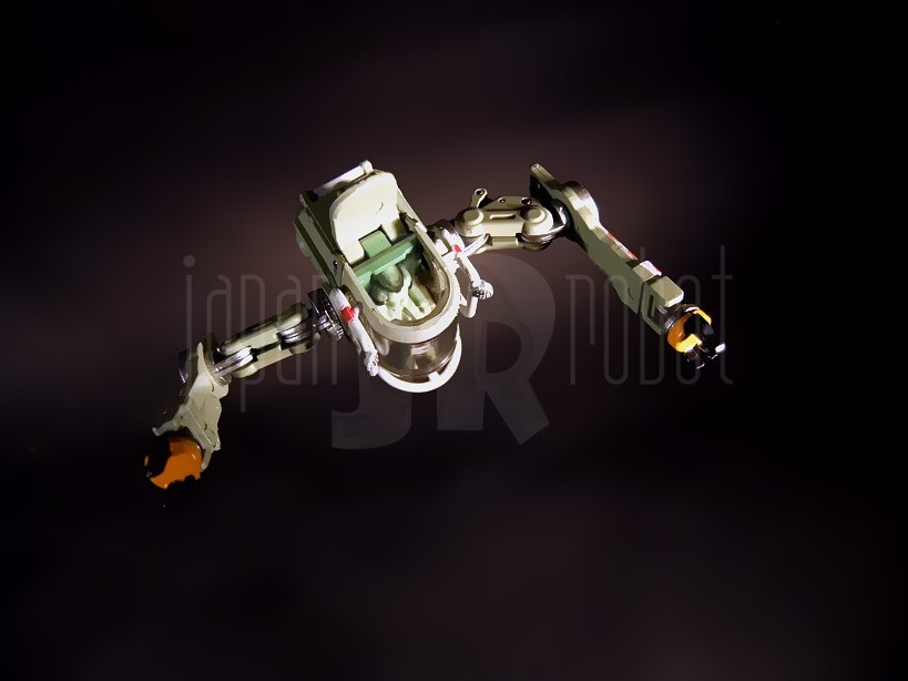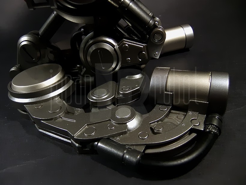 Più voluminoso rispetto a quello del Nu Gundam, questo busto si caratterizza per un’altezza oscillante tra 18.5 e 23 cm all’apice dell’antenna centrale (variabile in rapporto al grado di estensione del collo e del tronco) ed una larghezza di 26 cm (dall’estremo di una spalla a quello opposto) per un peso di 637 grammi. La composizione è quasi interamente in plastica, le uniche parti metalliche si localizzano infatti esclusivamente a livello del piedistallo (in pratica sono in metallo le parti grigie più chiare ed i cilindri dei 3 pistoncini (2 anteriori ed 1 posteriore) scorrevoli). La cura dei dettagli è veramente notevole, nelle pannellature, nella riproduzione del cockpit, dei fasci di cavi e tubature e degli ingranaggi nonché nelle markerizzazioni sul backpack. La verniciatura è altrettanto ben curata e senza sbavature di rilievo, certamente migliore di quella già buona ma con qualche piccolo-medio neo del Nu Gundam. Le spalle si agganciano a pressione e sono ruotabili ad attrito a 360 gradi, ciascuna è scomponibile in 3 pannelli l’anteriore dei quali soffre di una certa instabilità per cui non è infrequente che maneggiando la parte tenda a sganciarsi spontaneamente. Nessun problema di questo tipo invece per il pannello superiore e quello posteriore, anch’essi rimovibili. Anche il rivestimento della parte superiore del petto è staccabile, questo permette di scoprire tutta una serie di tubature, pistoni e circuiti variamente intrecciati tra loro e davvero ben riprodotti. La parte superiore della testa è ribaltabile, così come la visiera con il relativo cursore in modo da lasciare scoperto il cockpit ed il sedile del pilota. La testa ha escursioni solo sul piano sagittale con movimenti di flesso-estensione e senza rotazione laterale (a differenza del Nu Gundam), bella la possibilità di spostare il cursore da destra a sinistra e viceversa. Il tronco è a sua volta flessibile (articolazione ad attrito) all’attacco con il piedistallo dove intelligente è l’utilizzo di tubature di pvc morbido e quindi adattabili alle escursioni articolari senza rischio di rottura. Il backpack è mobile all’aggancio con la schiena del robot dove può essere regolato in inclinazione con una articolazione a scatto (2 scatti e 3 possibili posizioni). Il suo corpo centrale è dotato di un paio di sportellini apribili. I due elementi laterali sono ruotabili sul piano sagittale e parzialmente ripiegabili medialmente ed abducibili lateralmente. Sulla loro superficie superiore, con pannellature scorrevoli, sono applicabili i sei funnels (si appoggiano e sono 3 per lato), una delle armi più potenti e temibili del Mobile Suit. Questi ultimi sono a loro volta molto dettagliati e dotati di 4 pannelli apribili proprio come nell’anime. Qualche segno di distacco dalle sprue di troppo è stato furbescamente celato localizzandolo sulle parti grigie più interne o che rimangono nascoste sotto i rivestimenti rimovibili. Il mezzo di supporto è ben verniciato, ha il tettuccio apribile, ha le 3 braccia snodate ed è interamente in pvc. Intelligente l’idea di mettere a corredo la basetta con relativa asta d’appoggio per permetterne l’eposizione in volo così da simulare le operazioni di riparazione del Mobile Suit.