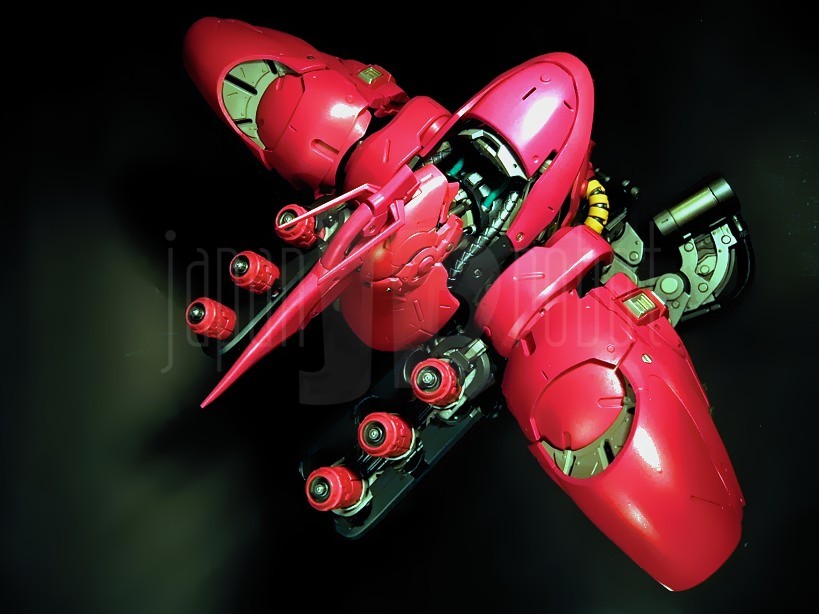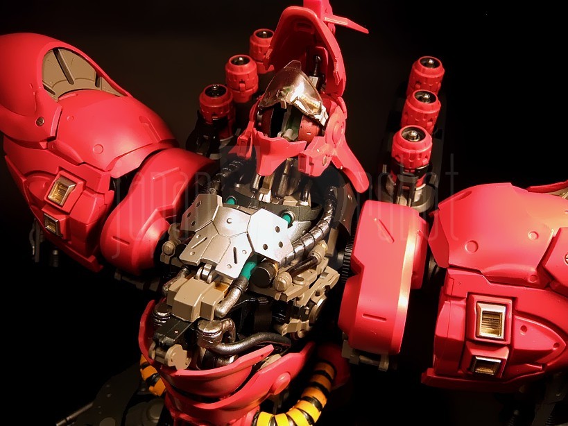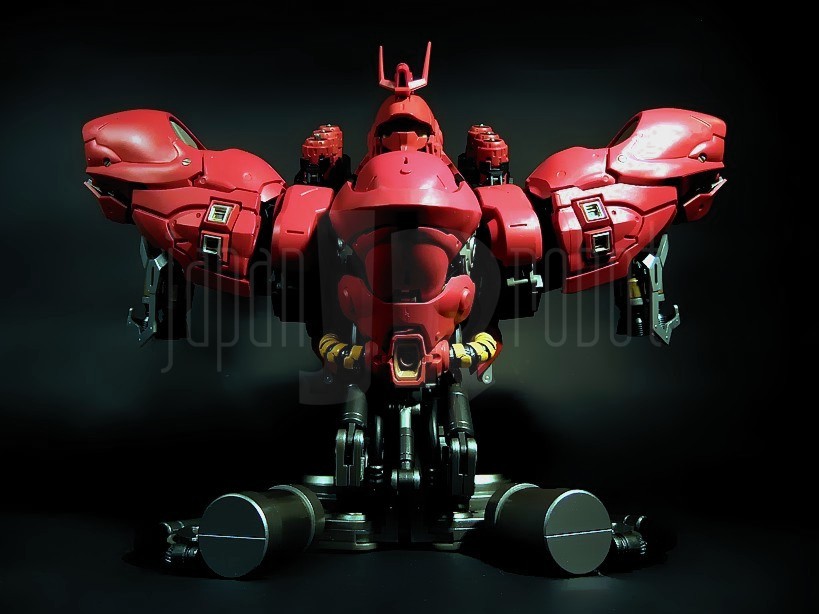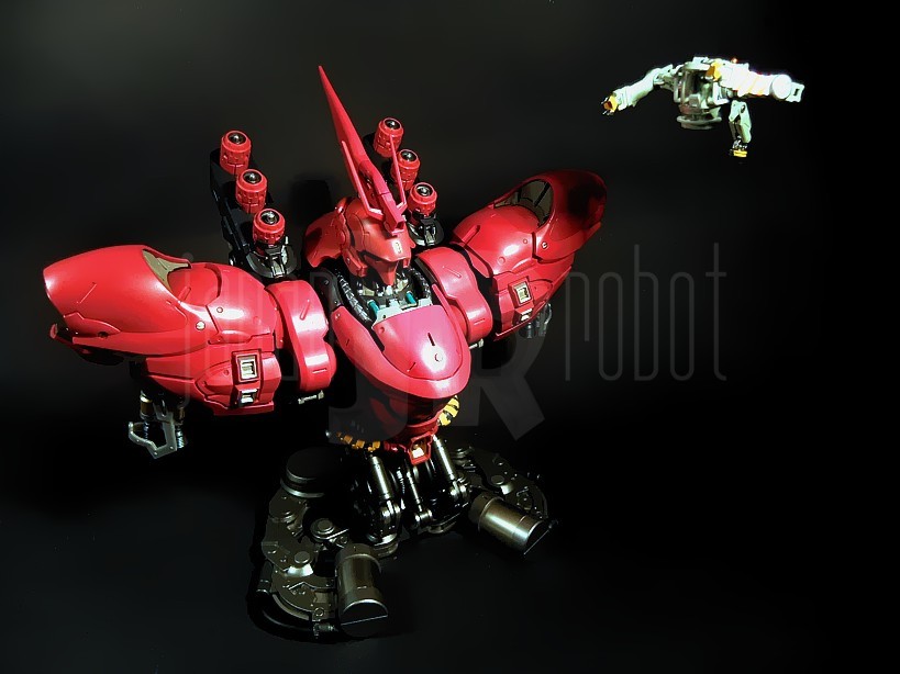 Il successore dell’ RX-93 Nu Gundam nella serie Formania è, abbastanza intuibilmente, quello che in “Mobile Suit Gundam: Il contrattacco di Char” (Kidō sensi Gundam: Gyakushū no Char), lungometraggio Sunrise del 1988, ne rappresenta l’avversario per antonomasia, e cioè l’MSN-04 Sazabi. Il Mobile Suit, costruito espressamente secondo le direttive di Char Aznable, nemico storico di Amuro Ray, allo scopo di ottimizzarne le capacità di eccellente pilota anche grazie ad un sistema in grado di minimizzare i tempi di reazione e le velocità di risposta del manovratore grazie alla tecnologia dello psycommu e dello psyco frame, si caratterizza per un colore rosso vivo più acceso del rosa carico tipico dello Zaku di Char e rappresenta di fatto il predecessore dello stupendo MSN-06 Sinanju, presente nella serie Mobile Suit Gundam Unicorn. Premessa la buona qualità del Nu Gundam già prodotto per questa serie, bisogna ammettere che in questo caso, complice un’estetica per me più accattivante, il giudizio sulla qualità di questi prodotti è ulteriormente migliorato anche per una maggiore cura di alcuni dettagli rispetto alla prima uscita.