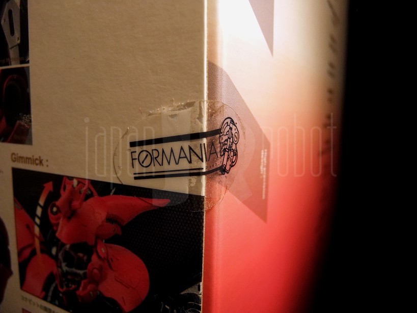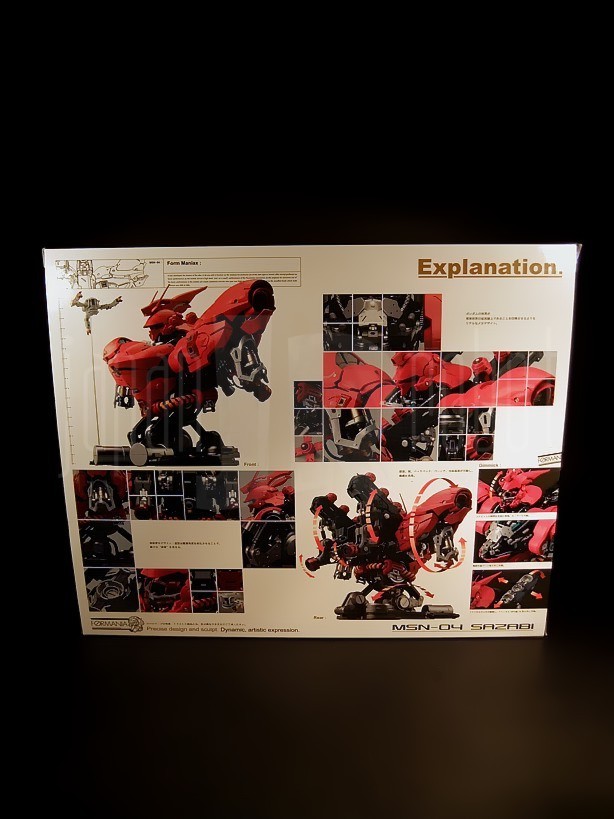 La scatola è abbastanza voluminosa per un oggetto non poi così grande (29 x 25 x 20 cm) ed ha un peso abbastanza contenuto, pari a 1160 grammi. Il design è davvero elegante. Sull’anteriore è ritratto il Sazabi stesso, una metà assemblata, l’altra scomposta nelle singole piastre e componenti che lo costituiscono. A destra sono presenti nell’angolo in alto il logo Formania ed in basso quello Bandai. Sul versante posteriore l’artwork ricalca quello del precedente Nu Gundam con due immagini, frontale e posteriore, del busto illustranti i possibili movimenti di spalle, backpack, tronco e reattori e costellate da una miriade di piccoli riquadri focalizzati sui dettagli più fini (cockpit, vani apribili, mezzo di riparazione, reattori, pannelli apribili dei funnels) principalmente tesi ad illustrarne l’estrema cura dei piccoli particolari. Sul laterale sinistro, come da tradizione, sono riassunte le caratteristiche tecniche relative a codice identificativo, altezza, peso, potenza, armamentario, anno di produzione, casa produttrice, esercito di assegnazione e pilota. Eleganti i piccoli adesivi con logo Formania che bloccano i lati apribili della scatola.