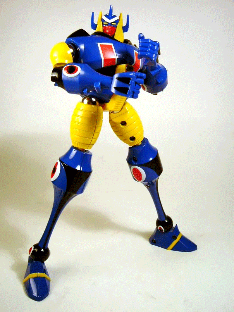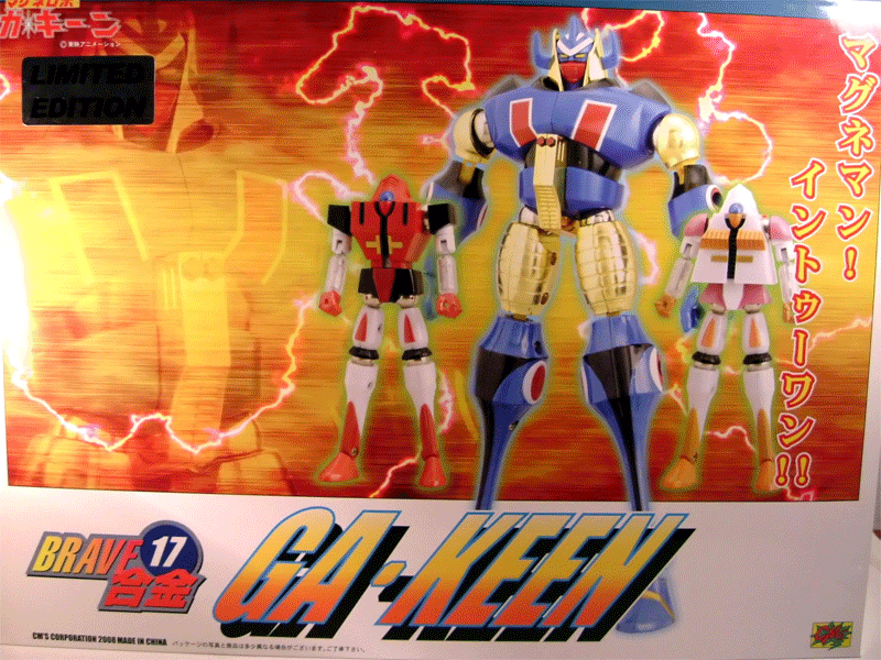 Tra il 5 Settembre 1976 ed il 26 Giugno 1977 TV Asahi trasmetteva in Giappone la serie anime in 39 epidosi, edita da Toei Animation, Magne-Robot Ga-Kin, che nel 1980 raggiungerà l'Italia facendo innamorare un gran numero di quelli che, allora bambini, sono oggi uomini e padri di famiglia e con impazienza hanno atteso da circa un anno, dopo l'annuncio da parte della CM'S Corporation, la produzione del diciassettesimo modello della serie Brave Gohkin, il robot magnetico Ga-keen a cui la casa produttrice ha riservato un trattamento particolare immettendo sul mercato non una, non due, ma bensì tre differenti versioni, diverse tra loro per colorazioni e tirature. Le prime due, la normal e la Asia limited sono uscite praticamente in contemporanea nel corso del mese di ottobre 2008, la terza, Japan limited, è uscita solamente a inizio novembre. Le differenze principali oltre che alla tiratura (la Asia e la Japan sono state prodotte in numero ridotto, soprattutto quest'ultima, stampata, a detta della casa produttrice, in un numero di 300 copie al mondo), sono legate al tipo di colorazione. La versione normal presenta cosce, parte centrale del bacino, spalle e guance dorate, la Asia limited (che è invece ispirata alla versione vintage del modello) ha le stesse parti in giallo, fatta eccezione per le guance e la porzione centrale del bacino, dorate. La versione Japan limited infine presenta le suddette parti interamente di colore giallo. Altra differenza di verniciatura è quella che caratterizza il colore blu della versione normal (parzialmente metallizzato) rispetto a quello delle altre due versioni (che è invece uniforme). Le 3 varianti son diverse infine anche per i colori che caratterizzano i due piccoli robot in dotazione, il Plyzer e il Mighty in cui l'uso del cromato tipico della versione Asia limited è sostituito dal bianco perlato nella normal e dal bianco semplice nella Japan limited. Personalmente, nei miei ricordi di bambino ho sempre considerato il giallo come colore tipico del Gakeen, e questo è stato il motivo per cui, seppur a fronte di una spesa più cospicua, ho deciso di acquistare la versione Japan limited, che è il modello di cui andremo a parlare in questa recensione.
