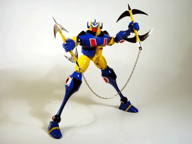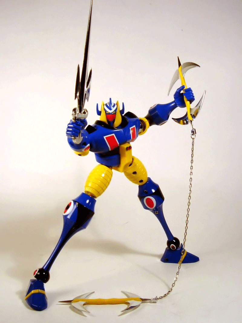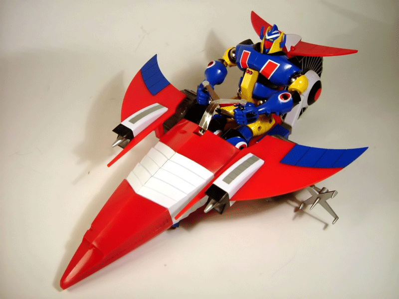 Partiamo subito con i dati tecnici. Il modello è alto 18 cm per un peso, senza accessori, di 206 grammi.Le parti in metallo sono gli arti inferiori (per intero, piedi compresi) e le spalle. Tronco avambracci e testa sono invece in plastica. La stragrande maggioranza del peso del modello è in pratica concentrata dalla vita in giù. Le proporzioni sono assolutamente perfette, il modello è Gakeen, in tutto e per tutto e i dettagli sono curati in modo assai minuzioso sin nei minimi particolari con una verniciatura assolutamente impeccabile, perfetta in tutto e apparentemente resistente. Considerato che avevo aperto il Baldios prima del Gakeen sono rimasto sorpresissimo della assoluta discrepanza tra il curatissimo dettaglio di questo modello e la scarsissima cura impiegata in tal senso nel Baldios tanto da lasciar pensare, se uno non lo sapesse, che si tratta di toys prodotti da case diverse e non dalla stessa ditta (tra l'altro quasi in contemporanea). E veniamo adesso all'inevitabile confronto con un altro modello a magneti recentemente prodotto, il gx-42 Kotetsu Shin Jeeg di Bandai. Certamente il Gakeen ha una tenuta delle calamite ben più potente di quella del gx-42, si fa una certa fatica a staccare le gambe e le braccia dal tronco, indicando come la potenza delle calamite sia più rassicurante di quella modello Bandai. Purtroppo però anche in questo caso esiste la magagna: le cosce si allargano molto e le caviglie si piegano moltissimo per cui la posabilità sembrerebbe ottima ma così purtroppo non è per il semplice motivo che i piedi del modello sono interamente in metallo tendendo quindi a scivolare su qualsiasi superficie vengano poggiati facendo esibire il nostro eroe in spaccate degne della migliore Carla Fracci, aiutato in tal senso dal fatto che nonostante la potenza delle calamite alle anche la superficie liscia delle sfere tende comunque a scivolare nel suo alloggiamento. Un paio di feltri sotto la pianta del piede avrebbero risolto in questo caso qualsiasi problema a differenza dello Shin Jeeg in cui rappresentavano una toppa insufficiente a nascondere le ben più complesse falle del gokin. Tra i due modelli quindi vince certamente il Gakeen, ma anch'esso non è esente da pecche ed è un peccato soprattutto considerato il prezzo del modello. E' comunque possibile porre rimedio (anche se sembra assurdo dover mettere mano a un modello da più di 200 euro) con un paio di striscioline di scotch di carta così da aumentare l'attrito delle piante dei piedi sulle superfici di appoggio, in questo modo avrete in pochi minuti un Gakeen iperposabile e stabilissimo. Per aumentare la tenuta delle anche può essere invece sufficiente un doppio strato del normale cellophane da cucina a rivestire le sfere, visivamente non lo si nota e rende il modello solido come la roccia. A proposito dei piedi dobbiamo ricordare la piccola chicca del piede tagliente, la tipica lama che fuoriesce dalla pianta e che nel modello è estraibile. L'articolazione del ginocchio è a scatto ed è costituita da un perno in plastica incastrato in un alloggiamento di gomma all'interno della gamba. Inizialmente ho avuto difficoltà a piegare il ginocchio anche se i rischi di rottura del perno son praticamente nulli perchè se l'alloggiamento resta bloccatonella gamba il perno stesso fuoriesce (essendo l'alloggiamento in gomma) senza spezzarsi. Ho potuto mobilizzare l'articolazione semplicemente usando come leva il cappuccio di una bic e flettendo con forza il ginocchio. Fatta questa manovra per 2-3 volte l'articolazione si allenta e diventa libera di flettersi a 90 gradi. Brutto il particolare della linea di giunzione tra le due metà proprio sulla superficie anteriore della coscia evidentemente dettata da necessità tecniche. L'articolazione calamitata dell'anca è stata progettata in modo intelligente dal momento che la sfera di metallo non è fissa ma parzialmente estraibile così da permettere maggiori escursioni e soprattutto la possibilità di una flessione a 90 gradi, necessaria per mettere il modello in posizione seduta alla guida del Variant. Le spalle ruotano liberamente a 360 gradi ma i movimenti di abduzione sono limitati proprio per la conformazione dell'articolazione dal momento che spostando lateralmente la spalla il suo movimento viene a essere bloccato dal contatto col tronco. I pugni sono sparanti e maneggiando il modello per modificarne posa saltano che è una bellezza, hanno dita snodate fatta eccezione per il pollice che è fisso. Carino il dettaglio degli artigli d'acciaio estraibili dal dorso ma anche in questo caso, come nel Baldios, l'eccessiva parsimonia di CM'S nella dotazioni in mani si è fatta sentire: un solo paio!!! La testa essendo calamitata ruota completamente ed ha anche una buona capacità di estensione consentendo la riproduzione delle pose di volo. I due piccoli robot Plyzer e Mighty sono quasi totalmente in plastica, sono anch'essi calamitati (a livello di ginocchia, anche e spalle), sono curatissimi e riprodotti con precisione assai encomiabile. Bello il dettaglio del tronco apribile (nella serie anime questo si chiude quando i robot si trasformano nei razzi di supporto del Gakeen). Peccato che la loro posa sia difficoltosissima dal momento che alle anche, ma soprattutto alle ginocchia, la potenza delle calamite è così esigua da vincolare in modo del tutto insufficiente le suddette articolazioni. Questo problema, nel mio esemplare, è più accentuato nel Plyzer. Gli accessori sono completamente in metallo e in parte calamitati (le ali supersoniche sono agganciabili alle parti aggiuntive delle gambe e al Variant con attacco calamitato), hanno una verniciatura nel complesso buona. Tra di essi i miei preferiti rimangono le alabarde, la spada, le ali supersoniche e la lama atomica. Il Variant è enorme e detta sinceramente l'ho estratto dalla scatola solo per scattare le foto, subito dopo è ritornato nel suo alloggiamento dal quale non credo che lo farò più uscire dal mo