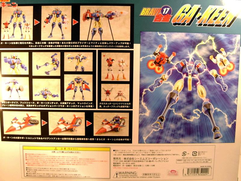 Nella serie anime, Gakeen era dotato di una quantità innumerevole di accessori e CM'S non ha mancato di corredare il modello di tutte quelle armi di cui il robot si serviva nel cartone. Tutto ciò ha condizionato in modo assai significativo le dimensioni della scatola, assolutamente enorme. Per essere più chiari le misure sono di 44 x 33 x 12 cm. Il design della scatola è analogo per tutte e tre le versioni e davanti è ritratto il modello nella sua versione normal, con i due caratteristici robot di supporto, Plyzer e Mighty. In alto a sinistra, direttamente sotto il logo della serie anime, a differenziare la versione Japan dalle altre varianti, troviamo un semplice adesivo con la dicitura Limited Edition. Sulla superficie posteriore abbiamo nella parte destra una suggestiva immagine del magnetico robot in fase di agganciamento e, sulla sinistra, una serie di piccole foto che riassumono brevemente il contenuto della scatola illustrando l'ampia gamma di accessori in dotazione al modello, compresi i due piccoli robot Plyzer e Mighty.