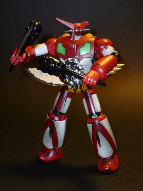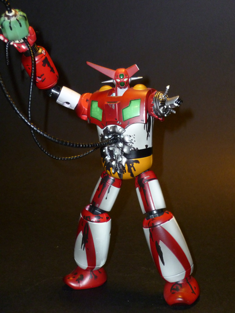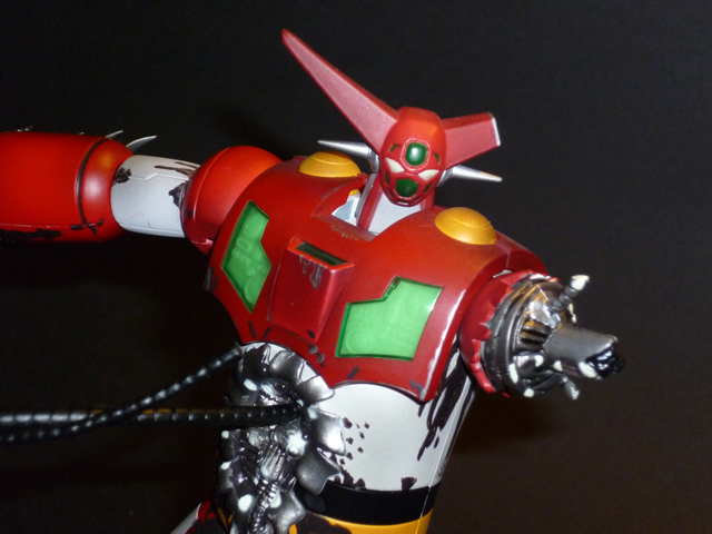 Purtroppo le linee che tendono a marcarne l’utilizzo in battaglia e della rottura del robot son fin troppo nette in alcuni punti e sembrano disegnate a pennarello. Molto meglio invece la rottura nel petto che sia come colore che come forma dà la sensazione di “estrazione”. Una delle “corna” del getter è spezzata ed anche li però l’effetto non è egregio, meglio invece l’effetto sporco sulle “antenne” laterali e sulla testa. L’effetto sporco generale invece rende meglio e si nota che la ditta in questione ha già dato prova della sua bravura in questo senso, tano è vero che l’effetto sporco/usato ricercato è abbastanza riuscito.