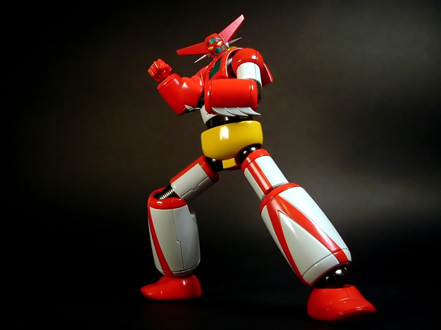 Come per i soc di recente uscita anche in questo caso la sensazione che il modello trasmette non appena lo estraiamo dalla confezione è quella di una pesantezza e di una solidità assolutamente abnormi a fronte di dimensioni molto, sin troppo contenute. Se infatti il nostro getter 1 è ricchissimo di metallo non si può non storcere il naso di fronte all'ennesimo caso di downscale praticato da Bandai nei confronti dei soc di più recente produzione. Precisamente ci aggiriamo intorno ai 16 cm di altezza per un peso di 381 grammi. Le parti in metallo, in accordo con gli standard degli ultimi tempi sono: gambe, cosce, bacino, addome, spalle e braccia. Sono invece in plastica: piedi, pettorina, testa e avambracci. La verniciatura nel mio esemplare è molto ben curata, sia sul modello (dove non ho rilevato grandi anomalie) che sugli accessori. Unico difetto un micoscopico punto di vernice bianca saltata nella parte posteriore del fianco sinistro immediatamente al di sopra della cintura. Bella l'idea di sfruttare le linee di giunzione tra le metà anteriore e posteriore di gambe, cosce, tronco, spalle e braccia come pannellature. Come detto, il gokin presenta soluzioni tecniche a noi già note in grado di fornirgli massima posabilità per cui sia le articolazioni della caviglia che quelle del bacino sono estraibili. Le ginocchia, a scatto, si flettono ben oltre i 90 gradi consentendo agevolmente eventuali pose in ginocchio grazie al sistema a sportellino rientrante sul retro della gamba. Il tronco ha due snodi: uno all'altezza del passaggio bacino-addome a livello del margine inferiore della cintura nera e l'altro allo stacco addome-torace in corrispondenza della pettorina. Il primo, molto rigido, permette movimenti di torsione, il secondo garantisce la possibilità di una modesta flessione in avanti del torace, il tutto a beneficio della posabilità e del dinamismo delle pose imprimibili al nostro getter. Entrambi sono ad attrito. Le spalle, a scatto in rotazione e ad attrito in abduzione, ruotano liberamene a 360 gradi e si abducono con un'escursione complessiva di 90 gradi. Sono parzialmente estraibili così da renderle piùlibere nei movimenti dall'ingombro costituito dalla pettorina. I gomiti, ad attrito, ruotano e si flettono a 90 gradi grazie agli sportellini sugli avambracci, inizialmente sono molto rigidi ma con l'uso si allentano gradualmente. I polsi hanno i perni per le mani fissi