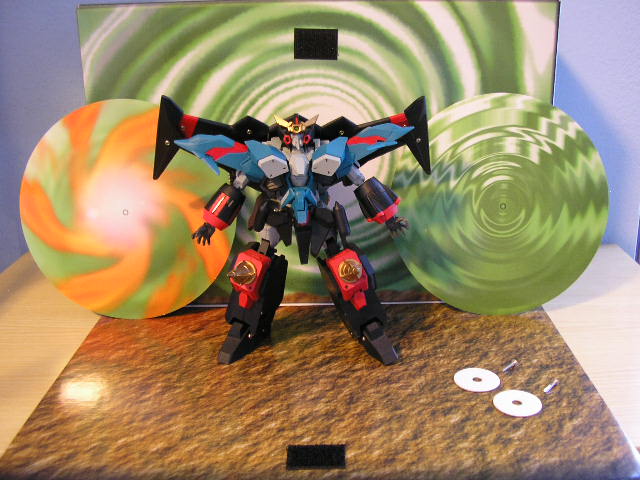 La scatola si presenta nella solita elegante veste nera, (dimensioni cm. 34 x 23 x 15 h.) con le immagini del modello stampate sulla sommità e sui flap laterali. Come già visto per il Perfect Change Getter del 1999, anch’essa si trasforma! In pratica è dotata di un falso coperchio, chiuso con una striscia di velcro, che simula un piccolo diorama in cui inserire il GFG trasformato ed intento a preparare il suo devastante attacco Hell and Heaven. Per completare la scenetta occorre togliere le parti pre-fustellate e fissare con due clip (fornite) i cerchi d’energia in cartoncino. I quali possono così ruotare e muoversi orizzontalmente. Se guardate la foto li vedrete solo appoggiati: perdonate se non l’ho fatto, ma non mi andava di trasformare anche la scatola…Il modello è contenuto in un vassoio di cartone che si estrae aprendo i flap laterali. Qui siamo nel territorio della più pura artigianalità: i singoli veicoli sono alloggiati in buste di millebolle, a loro avvolte in altri fogli di millebolle. Personalmente non ho mai avuto problemi di rotture all’interno delle scatole, ma capisco che una simile sistemazione può far tremare i polsi di un collezionista. Vi garantisco però che i pezzi sono saldi e protetti come un pisello nel proprio baccello…