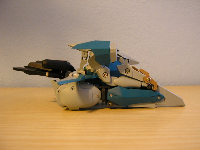 Il Phantom Gao da jet si trasforma nel robot GaoFar (h. 11 cm), il quale funge da corpo principale del GFG e da supporto per tutti gli altri veicoli. Alla fine la trasformazione è relativamente semplice (almeno per chi ha già visto quella del Perfect Change Getter): il Drill Gao II, separandosi, diventa le gambe, il Liner Gao II le braccia (non senza aver prima tolto i reattori, i quali però vanno persi anche nell’anime, in perfetto stile “Moto di Hiroshi Shiba”) e lo Stealth Gao III le ali. Per restare fedele alla parola “Perfect”, gli avambracci (che nascondono i pugni) non si staccano ed attaccano alle braccia: una volta collegate le ali al corpo, ruotano sul posto finché non si posizionano nella loro sede, spingendo in avanti i pugni. Una volta attaccati, i supporti saranno liberi di ritornare in posizione chiusa e voi, premendo un piccolo perno, fisserete gli avambracci nella loro sede definitiva. Altra menzione per l’elmetto/testa del GFG: fuoriesce da un vano dello Stealth Gao, pur rimanendovi sempre attaccato con uno snodo, e si “avviluppa” attorno alla testa del GaoFar: quando è in posizione, schiacciando una piccola piastra posta sulla nuca, apparirà la “gemma” verde di attivazione (G-Crystal) al centro del fregio posto sulla fronte.Una volta assemblato, dai piedi alla punta del fregio, il modello è alto 15 cm. Le piccole dimensioni non aiutano nelle trasformazioni: meglio che abbiate sempre sotto mano delle pinzette o un piccolo cacciavite da usare come leva, oltre al piccolo cacciavite a stella in dotazione per stringere le viti e permettergli di mantenere le posizioni che desiderate.La posabilità è buona, in parte limitata dal design stesso del robot che è parecchio massiccio. Alcuni perni, come gli snodi del “gonnellino” e le ali del Phantom Gao sono sferici: con l’andare del tempo l’attrito resina contro resina tende a renderli molli e necessitano di un intervento di restauro.La supposta fragilità dei pezzi HalfEye è del tutto relativa: trasformati con attenzione, senza forzare i giunti ed aiutandosi con il cacciavite per allentare e stringere le viti, non vi daranno mai problemi (perlomeno a me non ne hanno mai dati). Ricordate che NIENTE in questi modelli è lasciato al caso, c’è un incastro per ogni pezzo ed ogni pezzo deve andare al suo posto. Inoltre niente problemi di verniciature imperfette, graffi superficiali o ruggine: la resina è refrattaria a tutto questo… semmai alcune parti bianche possono ingiallire, ma fortunatamente il GFG non ne ha!