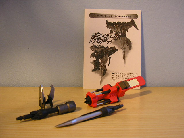 oltre alle mani per l’H&H, la mano sinistra aperta a palmo per il “Protect Wall” (e l’alloggiamento nel petto ruota per simulare l’energia sprigionata…), l’indispensabile cacciavite e l’ancor più indispensabile libretto delle istruzioni.Se vi capita la fortuna di trovare una Limited Edition come la mia (un tempo disponibile solo tramite il mail order dello Studio Halfeye), vi verrà fornito anche il Dividing Driver, corredato da un foglietto di istruzioni per collegarlo al braccio del robot.Per chi invece si chiedesse cosa sia quello scarabocchio sul coperchio, è l’autografo di Takashima!!!