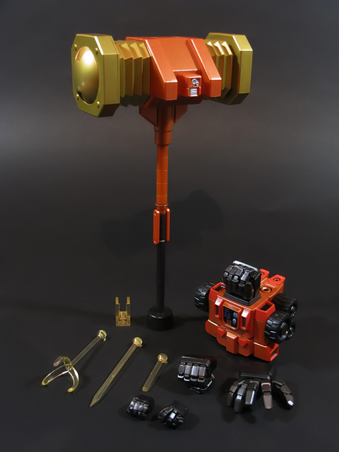 Nell'anime ci sono molti personaggi che sono indispendabili per la buona riuscita delle missioni alle quali prendono parte i membri della squadra GGG, uno di questi è GoldyMarg, un robot dall'intelligenza artificiale ispirata al Consulente Tattico della squadra che oltre a trasformarsi in veicolo tipo camion si trasforma, la parte inferiore del robot nell'avambraccio che si inserirà sul Gaogaigar e la parte superiore del robot nel potentissimo "Goldion Hammer", martellone gigante che devasta i nemici e che permette di estrarre il nucleo zoacrystal, del quale Mamoru si prenderà cura purificandolo.Ovviamente non essendo un trasformabile la scatola conterrà il martellone diviso in due parti, una la parte che "batte" l'altra il manico da inserire + un piccolo cerchio per posizionarlo saldamente a terra visto il peso. La scatola contiene anche i "perni" che simulano l'estrazione dello "zoacrystal" e l'avambraccio con 3 mani singole, 1 per l'impugnatura del goldion Hammer, 1 aperta ed 1 chiusa. Nella scatola sono contenute anche 2 mani di grandezza "normale" per l'altro braccio 1 per impugnare i suddetti perni l'altra aperta.Anche questi accessori son molto ben rifiniti e non presentano segni di distacco dai telai a parte il manico del martellone.Per dover di cronaca informo che ci sono altri due set di accessori uno con lo "stealth Gao II" (seconda Versione) e l'altro con i pliers, intelligenza artificiale sempre vista nella serie di 49 episodi, venduti separatamente ed usciti proprio in tempi diversi rispetto al modello ed al primo set accessori. Secondo me sono un di più ma dipende dalla propria esigenza/voglia di completezza che si ha verso il soggetto.