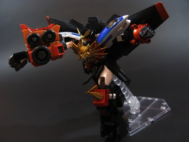 Gaigar (versione robot del leone Galeon), Stealth Gao (Aereo jet che diventa le ali del robot + avambracci), DrillGao, macchina scavatrice con due trivelle anteriori che diventa la parte inferiore delle gambe del Gaogaigar (un pò come il Gumper diventa le gambe del Daltanious), treno LinerGao, che si insersice nelle spalle di gaigar, oggetto inutile e puramente di "pubblicità" per i famosi treni giapponesi (forse la cosa più fastidiosa di tutta la trasformazione a mio avviso).Bene il risultato della Fusione di questi moduli (chiamata Final Fution nell'anime) è il Gaogaigar che questo modello rappresenta.