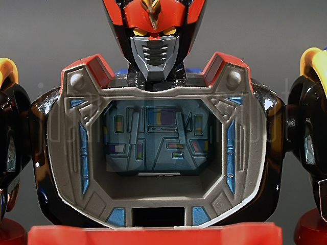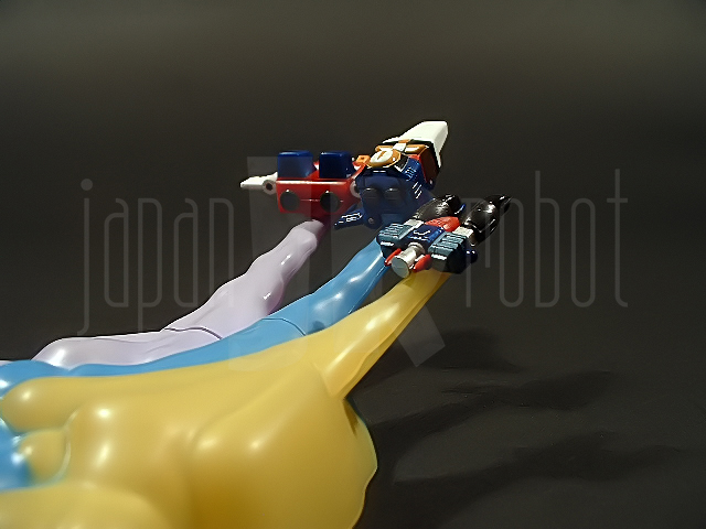 Passiamo ora ad occuparci del piccolo TRY 3, robot formato dall'unione dei tre Jet King Arrow, Jet Knight e Queen Rose. CM'S Corporation ha reso possibile la trasformazione dei tre Jet per dare forma al piccolo robot, ovviamente molto limitato nei suoi movimenti. 4 centimetri di altezza, rotazione delle braccia a 360 gradi e minimo movimento alle ginocchia, queste le possibilità del Try 3 riprodotto nella confezione, ma ovviamente lo scopo principale è quello di riprodurre l'agganciamento dei tre mezzi al Goshogun. I vani di aggancio sono ovviamente 3, petto per il King Arrow, tibia destra per il Jet Knight e tibia sinistra per il Queen Rose. I panelli si aprono mettendo in risalto bellissimi dettagli stile hangar all'interno, ogni piccolo Jet ha la propria sede con apposito aggancio che lo terrà saldamente ancorato dentro al nostro Goshogun. Come citato all'inizio, CM'S ha dotato di un particolarissimo stand espositivo i 3 piccoli Jet, gli appoggi dei mezzi riproducono la scia di fumo colorata lasciata alla partenza, idea che io ho trovato molto originale e carina da esporre.