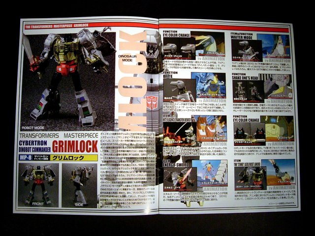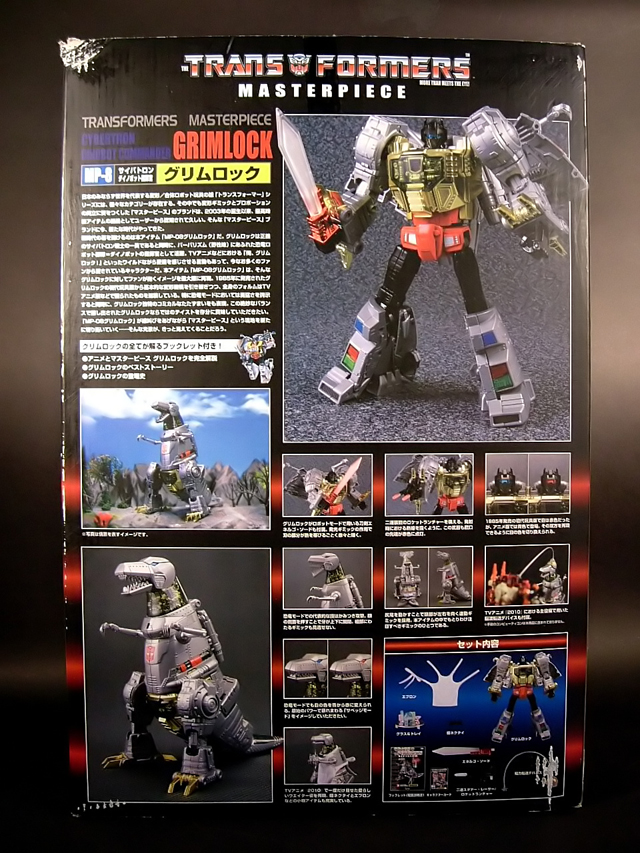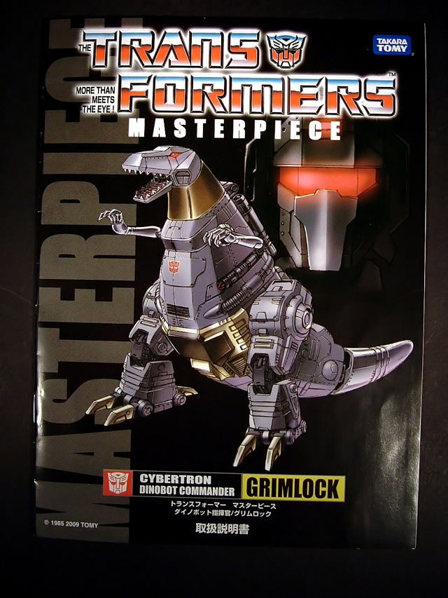 - Il libretto di istruzioni contenuto all'interno di una bustina di plastica trasparente insieme alla card identificativa del modello come da tradizione Masterpiece Takara. Come negli altri Masterpiece all'interno del libretto sono illustrate le precedenti versioni giocattolo di Grimlock, i gimmicks e gli accessori in dotazione con tanto di frames tratti dalla serie, una breve cronistoria del personaggio e, chiaramente riportate, tutte le istruzioni necessarie per effettuare la trasformazione del nostro modello in modo agevole.