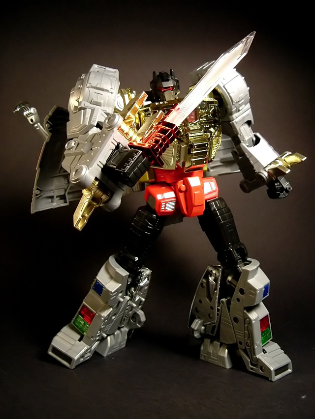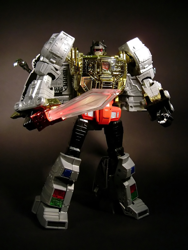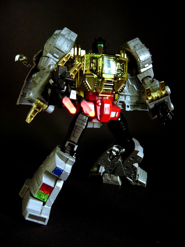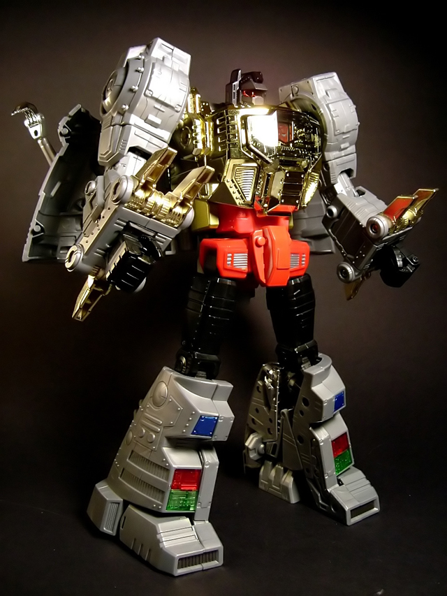 Relativamente leggero a fronte di una altezza di tutto rispetto (22 cm), il nostro Grimlock si caratterizza come tutti i Masterpiece (MP-1 e suoi recolor a parte) per una prevalente composizione in plastica. Nonostante ciò il peso di 544 grammi indica una seppur modesta percentuale in metallo che inizialmente ho avuto difficoltà ad identificare. Principalmente è localizzata a livello dell'articolazione della spalla del robot/anca del tirannosauro, delle dita delle zampe posteriori del tirannosauro/appendici sugli avambracci del robot, nella parte centrale del bacino e all'interno del blocco del torace. Molti si sono lamentati dell'altezza che, se il modello fosse stato fatto in scala, avrebbe dovuto essere in teoria superiore a quella di Optimus. Personalmente trovo che le dimensioni siano adeguate seppur non proporzionate dal momento che sia per materiali che per dimensioni ho sempre considerato l'MP-1 e l'MP-5 due uscite a parte rispetto al resto dei Masterpiece Takara. Molto curati i dettagli, soprattutto le chiodature ed i sistemi dei circuiti che, seppur non visibili nella serie animata, sono secondo me indispensabili per rendere meno piatto e insignificante l'aspetto del modello. Dispiace che a livello del collo e dell'addome del dinosauro non si sia ricorsi a un oro opaco più fedele a quanto visto sugli schermi, si è infatti deciso, probabilmente in omaggio alla versione vintage del 1985, di scegliere la doratura cromata dei circuiti qui riprodotti. La verniciatura è nel complesso buona, stonano un pochetto il riscontro di più di una venatura sulla plastica grigia (indice dell'uso di materiali non propriamente di prima qualità) e qualche segno di distacco dalle sprue di troppo sulla plastica rossa del bacino. La trasformazione, per semplice che sia, è stata come sempre realizzata in modo magistrale e scorre via senza intoppi complici le chiare indicazioni riportate sul libretto. La conversione delle gambe del robot nella coda del tirannosauro mi ha affascinato, veramente bellissima ed ingegnosa. In modalità animale il modello fa la sua bella figura e si contraddistingue per fedeltà alla controparte animata. Molto carini i gimmicks per cui spostando la coda in un senso il capo ruota in quello opposto, spingendo in basso il tronco la testa guarda in alto e premendo il tasto sulla mandibola a sinistra si simula il morso del tirannosauro chiudendo la bocca. Sfiziosa la possibilità di cambiare il colore degli occhi dall'azzurro al rosso della modalità combattimento tramite un sistema a rotazione all'interno della testa. Curato anche il dettaglio delle braccia in modalità animale, ben snodate con un sistema a sfera e ampiamente mobili in corrispondenza delle spalle, con gomiti flessibili e dita articolate separatamente le une dalle altre. Pure le anche e le ginocchia hanno una discreta mobilità garantendo, nonostante la goffaggine del nostro tirannosauro, una mobilità discreta nel limite del possibile. Imbarazzante, come accessorio, il grembiule con tanto di papillon e vassoio coi bicchieri, sono proprio curioso di capire chi mai ridicolizzerà il nostro eroe con una esposizione di questo tipo. Evidentemente Takara ha ascoltato le lamentele di chi criticava l'incompletezza della dotazione in accessori dei precedenti Masterpiece inserendo tutto, ma proprio tutto, ivi compreso, oltre ai suddetti, anche il sistema per la trasmissione delle onde cerebrali (anch'esso, per me, superfluo ed inutile). Passando alla modalità robot e partendo dalla mobilità, possiamo affermare che questa è da considerarsi complessivamente buona nonostante le caviglie non si pieghino moltissimo. Le ginocchia, a scatto, hanno movimenti di flessione soddisfacenti e le anche, ad attrito, hanno ampissime escursioni sia lateralmente che in senso antero-posteriore. La cosce sono libere di ruotare. Il tronco presenta movimenti di torsione a livello dello stacco addome-bacino. Le spalle, ad attrito, sono un po' troppo limitate in abduzione ma ruotano a 360 gradi e le braccia ruotano rispetto ad esse. I gomiti sono a scatto e si flettono a 90 gradi e la testa, dotata di uno snodo a sfera ha ampi movimenti di flessione-estensione potendo anche ruotare completamente. All'interno della spalla destra si localizzano le batterie (già in dotazione al modello) per l'alimentazione della luce localizzata nel pugno sinistro attivabile tramite la pressione di un pulsante sul retro della stessa spalla per illuminare la spada e il fucile quando questi vengano fatti impugnare al robot. Per questo motivo le falangi della mano destra non sono snodate ma bloccate in posizione di flessione, un vero peccato, mi risulta difficile pensare che non si sarebbe potuto escogitare un modo diverso per ideare questo gimmick senza limitare il movimento della mano. Ad ogni modo l'effetto finale di illuminazione in rosso della energon sword e del fucile è molto scenico. Anche in questa modalità è possibile convertire il colore della visiera da azzurro a rosso spostando una levetta posta al di dietro della testa del robot. Così come l'alt-mode, anche la variante robot del modello si contraddistingue per la notevole fedeltà all'aspetto che lo caratterizza nel cartone con gli unici appunti, secondo me, dell'eccessiva snellezza delle cosce che avrei trovato maggiormente somiglianti se più massicce (probabile che questa filiformità sia stata condizionata da ragioni dovute alle necessità di trasformazione) e della presenza della testa del tirannosauro "appesa" dietro alla schiena (decisamente non un bel vedere anche se, sinceramente, era difficile studiare soluzioni alternative).