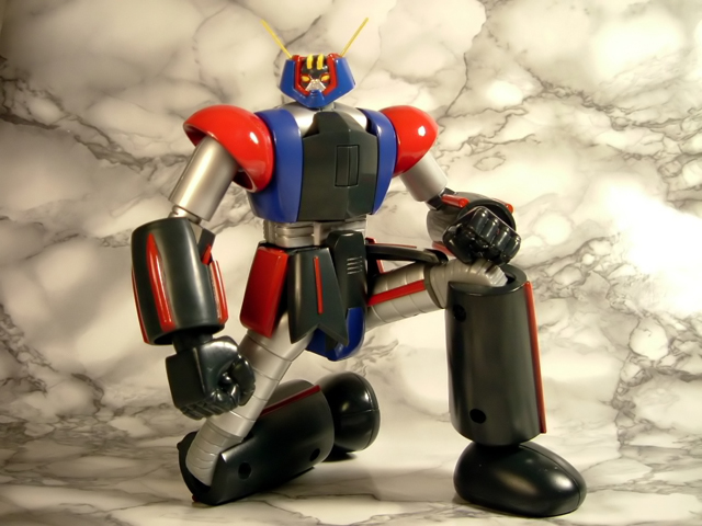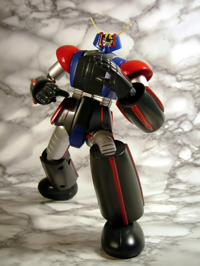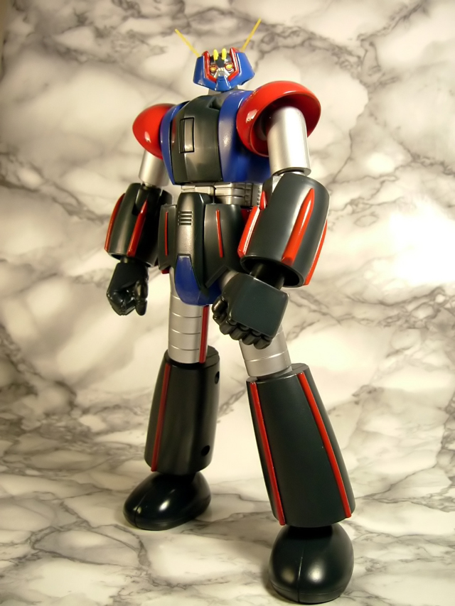 estraendolo gli alettoni postero-inferiori e i missili sulla superficie ventrale di quelli postero-superiori si distacchino spontaneamente visto che si incastrano a pressione. Poco male, si rimettono al loro posto e si prosegue, anche se la cosa non è certo positiva dal momento chei distacchi di queste parti possono verificarsi con una certa facilità anche mentre si maneggia ilmodello. Anche i missili antimateria sulla superficia ventrali delle ali sono applicati a pressione,ma a differenza delle parti di cui sopra godono di una maggiore solidità e stabilità. In questa modalità la lunghezza è di circa 15 cm per un peso relativamente esiguo (appena 200 g) condizionato dal fatto che a parte la porzione anteriore del corpo centrale per il resto l'aereo è completamente in plastica. Per completarlo è sufficiente applicare i due alettoni superiori di coda, confezionati separatamente e un po' fastidiosi da estrarre dal blister per la sin troppo efficace tenuta dei fermi. I carrelli posteriori sono applicabili a pressione nei relativi alloggiamenti. Molto carino il sistema a molla che permette la loro estrazione semplicemente premendo lo sportellino sul dorso della parte posteriore dell'aereo tra i due alettoni superiori. Anteriormente il carrellino è facilmente applicabile rimuovendo l'appposita placchetta sul torace del robot. Il torace è apribile per simulare la fuoriuscita dell'ipermissile Xandron e, con l'accessorio simulante il fumo della propulsione, il suo lancio. Si tratta di accessori carini che non aggiungono però molto al valore del modello. I cannoni termici sul dorso sono in pvc morbido e non sono regolabili in inclinazione mentre sono ruotabili le relative torrette. La verniciatura non è quanto di meglio si sia visto ma, almeno in questo esemplare, a parte alcune evidenti imperfezioni soprattutto nei dettagli più minuti del volto e sulle ali, raggiunge la sufficienza a differenza di altre copie in cui più di una persona si sarebbe lamentata di grossolani difetti non si sa bene quanto favoriti dalla modalità di confezionamento. La basetta espositiva è originale e funzionale e permette l'esposizione dell'aereo con la possibilità di sceglierne il grado di inclinazione. L'aggancio alla carlinga dell'aereo è semplice e solido. Passiamo a questo punto alla trasformazione sempre che di trasformazione si possa parlare. In pratica per convertire il nostro Groizer in robot è sufficiente fare un semplicissimo lavoro di stacca-attacca in cui l'unica parte ad essere risparmiata è il torace del robot dal momento che le restanti parti dell'aereo devono essere rimosse totalmente potendosene tornare tranquillamente in scatola. Se è vero che è criticabile la politica dell'all in one avviata da Bandai con la pedissequa ricerca della trasformabilità senza la necessità di aggiungere o rimuovere pezzi nelle varie conformazioni (tendenza che comporta un inevitabile sacrificio del contenuto in metallo e della somiglianza alla controparte animata del robot), è altrettanto vero che se un gokin è convertibile deve pur sempre avere un minimo di convertibilità, praticamente inesistente in questo caso. Un minimo sforzo in più da parte di Yamato per limitare lo stacca-attacca non nego che mi avrebbe fatto decisamente piacere! Nella fase di distacco delle varie appendici mi sono reso conto che anche l'ala sinistra non ha un aggancio solido per cui mi è rimasta in mano applicando una trazione modestissima. Credo che si tratti però di un difetto della mia sola copia dal momento che l'ala controlaterale non soffre di questa lassità. L'unica trasformazione da eseguire è in pratica quella che permette alla testa di portarsi dal dorso al di sopra delle spalle ed è molto semplice da effettuarsi. A questo punto è sufficiente attaccare a pressione le braccia (anch'esse un po' difficili da estrarre dal blister per effetto dei soliti fermi) ed il blocco bacino-gambe (a proposito, anche la copertura posteriore del bacino quando lo si estrae spesso si stacca ) ed avremo il nostro bel robot con un'altezza di 21 cm (al sommo delle antenne) ed il ragguardevole peso di 518 g. In questo caso il metallo non manca, sono infatti di metallo i piedi, le gambe, il blocco interno del bacino, il torace, le spalle e le braccia. In plastica abbiamo le cosce, il gonnellino, gli avambracci e la testa. Appena assemblato ho purtroppo avuto subito una brutta sorpresa: una vite (per la precisione la inferiore sulla superficie interna della gamba destra) se ne è andata allegramente a spasso per il tavolo. Munitomi di apposito cacciavite ho con pazienza riassemblato il tutto, ma decisamente non ci siamo..... Le articolazioni di ginocchio e anca sono a scatto. Le pime consentono flessioni notevoli favorite dalla presenza di appositi sportellini sulla parte superiore della facca posteriore della gamba e le seconde permettono sia movimenti laterali che in senso antero-posteriore. La notevole rigidità ed il suono emesso ad ogni scatto non mi hanno trasmesso una sensazione di particolare solidità, l'impressione è in pratica quella di rischiare di ritrovarsi con l'articolazione spezzata ogni volta che la si muove. Sopratutto a livello dell'anca l'escursione dell'articolazione è favorita dalla mobilità degli elementi (2 anteriori e 2 laterali) che costituiscono il gonnellino. Questi, in plastica, si agganciano al corpo centrale del bacino con dei pernetti che danno la sensazione di spezzarsi con estrema facilità (soprattutto negli elementi anteriori, uniti al bacino solo in corispondenza dell'angolo supero-mediale). Il consiglio è quindi quello di porre particolare cura nei movimenti delle anche, che peraltro consentono al modello di avere una posabilità assolutamente di rilievo (può essere tranquillamente posato in ginocchio). Le articolazioni della caviglia sono ad attrito e nel mio esemplare eccessivamente molli. Non permettono grosse inclinazioni essendo state concepite in modo certamente non ottimale con c