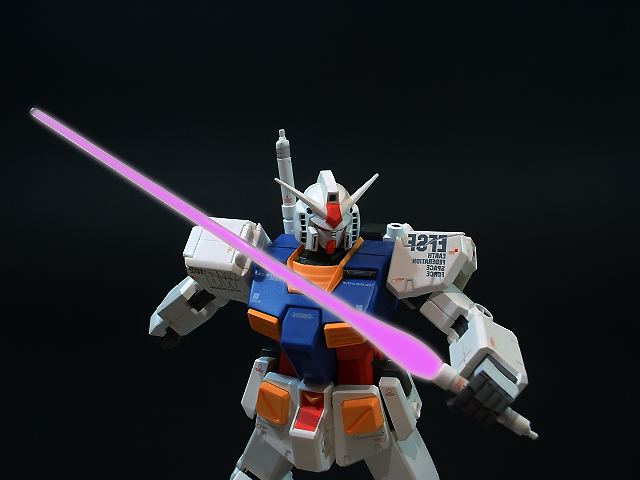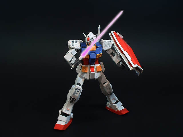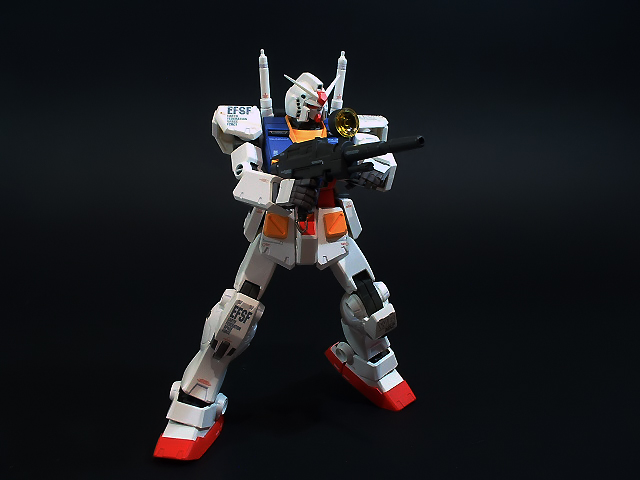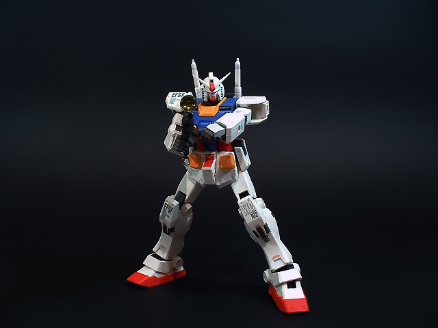 Il nostro Mobile Suit bianco è alto 19 cm ed ah un peso di 250 grammi, i materiali da cui è composto sono plastica, gomma dura e alcune parti in metallo. Voi ora vi chiederete, ma perché la sigla Metal Composite? Me lo sono chiesto anche io, probabilmente questa dicitura sta ad indicare che c’è una percentuale di metallo nella composizione del modellino, magra consolazione mi direte, ma è così. Le parti metalliche sono: il bicipite, la parte bianca dietro al ginocchio, l’interno della parte bassa della gamba ed anche del piede, questo sicuramente per dare peso e stabilità ad un modello che altrimenti sarebbe cascato al primo soffio di vento. La verniciatura è perfetta bellissime tutte le scritte applicate sul corpo del Gundam, addirittura ce ne sono di piccolissime, ma se prendete una lente d’ingrandimento le potrete leggere tutte! Molto bella la tonalità del blu e del rosso, le plastiche sono state dipinte quindi il risultato non da per nulla l’effetto giocattoloso. Nessun segno di stacco dalle griglie sulle plastiche, l’assemblaggio nell’insieme è buono, ma sugl’avambracci non è il massimo della perfezione, rimane purtroppo ben visibile la linea di giunzione nella parte frontale, mentre risulta meno vistosa nella posteriore. Anche per la testa si poteva sicuramente fare meglio, ma il fregio centrale nasconde sapientemente il difetto. La posabilità si attesta su buoni livelli, nulla di eccezionale, però si possono riprodurre discrete action pose tipiche della serie Gundam. Certamente con l’esperienza dei Kit Bandai poteva dotare di più movimenti questo Rx-78-2, il livello raggiunto in alcuni Master Grade è davvero stupefacente, e dato che questo modellino è in scala 1:100 mi aspettavo un lavoro più curato da questo punto di vista. Passo ad una descrizione più accurata dei movimenti, la testa ruota a 360 gradi, ma ha pochissima escursione, sia in laterale che in avanti/dietro, è praticamente agganciata ad un perno che ne permette/frena i movimenti. Le braccia ruotano completamente, c’è un ulteriore snodo sotto alla spalla che permette di muovere all’interno ed all’esterno tutto il braccio. Buona la rotazione del gomito che consente di piegare l’avambraccio quasi completamente dando la possibilità al Gundam di andare ad agganciare la Beam Saber dietro alla schiena, quasi nulla la mobilità del polso dove c’è il perno per l’aggancio delle mani. Il busto è ovviamente fisso dato che si stacca dal bacino per permettere l’agganciamento del Core Fighter, le gambe invece godono di discreta mobilità, abbiamo al massimo dell’apertura con piedi poggiati completamente a terra una divaricazione di 13 centimetri che non è per niente male. Questo grazie alla parziale rotazione che può compiere lo snodo posto sotto al bacino, è il classico a perno usato nei kit, volendo lo si potrebbe anche modificare……La rotazione è comandata da snodi ad atrito mentre al ginocchio abbiamo il più gradito a scatto, quest’ultimo permette un notevole piegamento all’indietro della parte inferiore delle gamba. Buonissima la resa della caviglia che può inclinarsi abbastanza per permettere al Mobile Suit di mantenere quasi sempre le piante dei piedi a terra, c’è da osservare anche la possibilità che ha il collo del piede di poter ruotare ed avanzare, questo contribuisce notevolmente al mantenimento della stabilità.