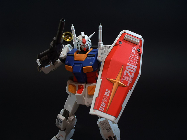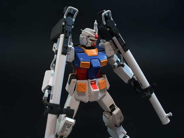 Il nostro Rx-78-2 è ovviamente provvisto di armi ed altri accessori che vengono impiegati per l’ottenimento delle varie configurazioni viste prima. Per completezza vado brevemente a descrivere le armi in dotazione, 2 Hyper Bazoka lunghi 16 centimetri con mirino fisso, possono essere agganciati singolarmente nel retro dell’ Rx-78-2. Beam Rifle è il classico fucile usato dal Gundam ed è lungo 9,5 centimetri, può essere impugnato indifferentemente a destra o a sinistra ed ha il mirino e la manopola orientabili. I 2 Shield sono gli scudi usati per la protezione dai colpi nemici, misurano 10,5 centimetri, uno è il classico con la stella gialla, il secondo invece è liscio con la sola scritta WB102 EFSF. La particolarità di questi scudi è che si possono sormontare grazie all’uso di un piccolo accessorio dando la possibilità al Gundam di averli entrambi in solo lato. Immancabili ovviamente le Beam Saber, sono le classiche spade laser che il Mobile Suit bianco estrae da dietro la schiena, agganciate la manico raggiungono la misura di 15,5 centimetri. Nella confezione sono presenti anche alcuni importanti accessori, abbiamo 2 manopole che servono per far sorreggere gli scudi all’ Rx-78-2 nella configurazione G-Armor, vengono agganciate nell’interno dei rispettivi Shield, aggancio singolo per posizionare lo scudo sul braccio mediante un perno che si va ad inserire nell’avambraccio, la particolarità di questo accessorio è che una volta agganciato lo scudo questo può essere fatto ruotare in qualsiasi direzione ed addirittura essere ripiegato all’indietro. La dotazione di accessori si chiude con un supporto che permette l’agganciamento del Gundam con le ruote cingolate del G-Fighter, questo ne assicura la tenuta nella configurazione G-Armor, tutte queste parti descritte sono in plastica verniciata con rifiniture perfette.