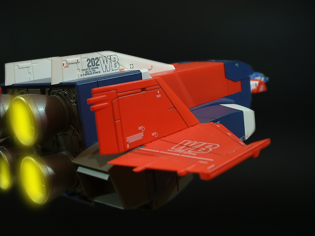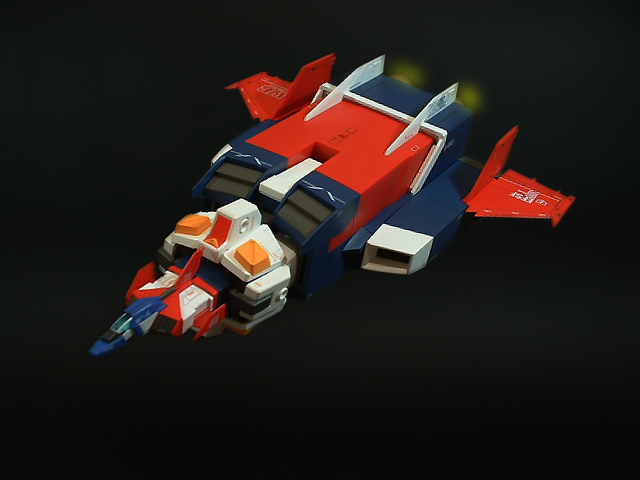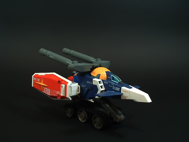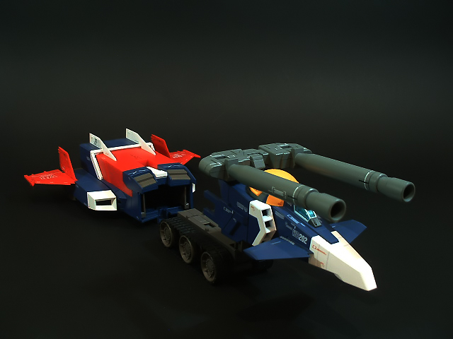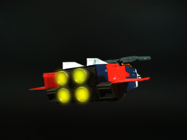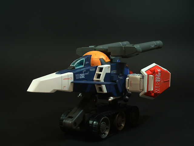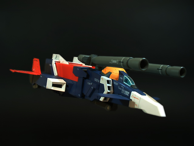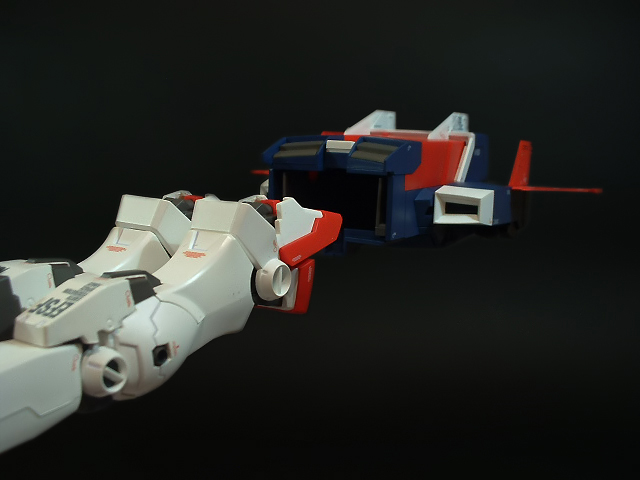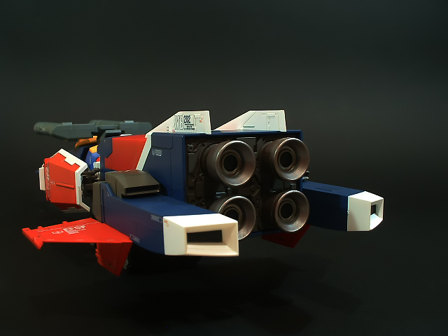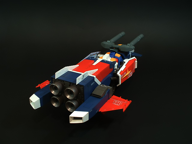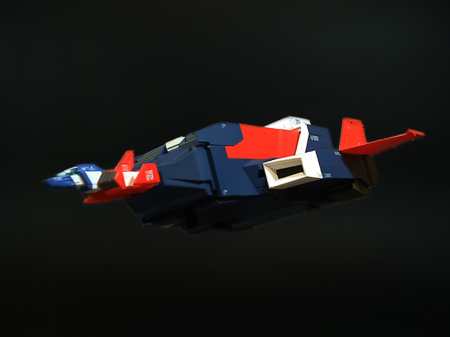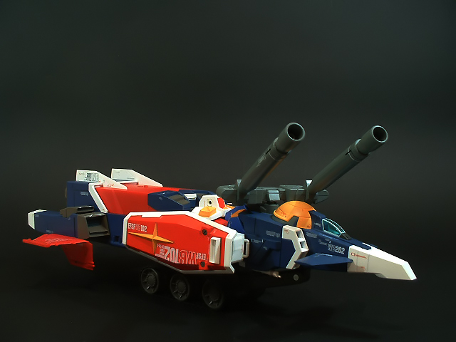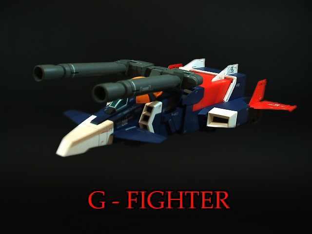Il G-Fighter è il mezzo di supporto del nostro Rx-78-2, ha la possibilità di essere impiegato sia a terra che in volo, ma andiamo con ordine. Il G-Fighter pesa 270 grammi ed è lungo ben 28 centimetri, è composto totalmente in plastica ed ha una verniciatura molto valida come per il Gundam. Anche qui bellissime le tonalità dei colori blu e rosso, molto curate le varie scritte e soprattutto le pennellature sul corpo del G-Fighter e sul retro nella parte motori. La cabina di pilotaggio è di color verde trasparente, i bordi sono tracciati in bianco e si può anche vedere il sedile interno. Poco dietro alla cabina di comando c’è la grande torretta con due cannoni, essa può ruotare parzialmente e ha la possibilità di poter alzare singolarmente le due bocche di fuoco. Le ali di coda ruotano all’indietro per la configurazione G-Armor grazie ad uno snodo a scatto che ne scandisce ogni singola rotazione. Nella “pancia” del G-Fighter c’è un grande alloggiamento che nasconde le ruote cingolate, queste sono in gomma morbida e funzionano realmente. Questa parte è agganciata alla punta del G-Fighter, questa parte si stacca dal resto del corpo per permettere l’aggancio del Mobile Suit nella fase di trasformazione G-Armor. Passiamo ora alla descrizione del piccolo Core Fighter, presente ovviamente in versione trasformabile. Questo è il mezzo volante che serve ad Amuro Ray per agganciarsi al Gundam e in questa versione Metal Composite è sapientemente riprodotto pur essendo di piccole dimensioni, 6 centimetri di lunghezza, 3 in versione chiusa, per un peso di 0,5 grammi. Anche per il piccolo Core Fighter rifiniture e verniciatura ottime, perfetta la trasformazione per la fase di aggancio, la punta rientra all’interno e ruotando nella parte sottostante fa nascondere la coda posteriore, le ali si chiudono ed il piccolo gioiellino è pronto per diventare parte integrante del nostro Rx-78-2! Nella confezione troviamo anche i tre piccoli carrelli nel caso in cui si voglia esporlo accanto al Gundam.