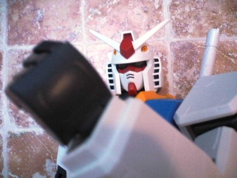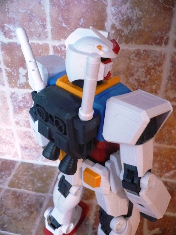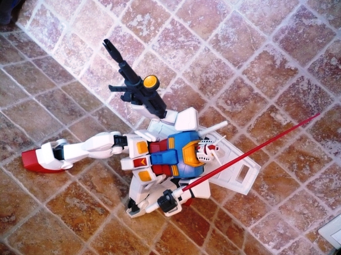 La testa non si discosta poi molto da quella degli altri “fratelli” e si fa apprezza per un ottimo snodo alla base del collo, che consente al Gundam di alzare o abbassare il capo in maniera egregia.Le armi sono “solamente” 4: 2 spade, fucile e scudo. Niente bazooka. Niente mazza ferrata. Le spade sono identiche alle controparti 1/100 e 1/60, lo scudo è costituito da 3 elementi (pezzo bianco, pezzo rosso e stella), mentre il fucile ha sia il manico, sia il mirino muovibile.Il Gundam è così montato e si mostrerà a voi orgoglioso grazie ai suo 37,5 cm e ai 660 grammi di peso.E qui entrano in gioco gli esperti modellisti con i vari marker da poter utilizzare, le decalcomanie e le vernici. Io ho preferito lasciarlo così com’è uscito dalle fabbriche Bandai e, come potete vedere nelle foto, la sua figura la fa comunque.
