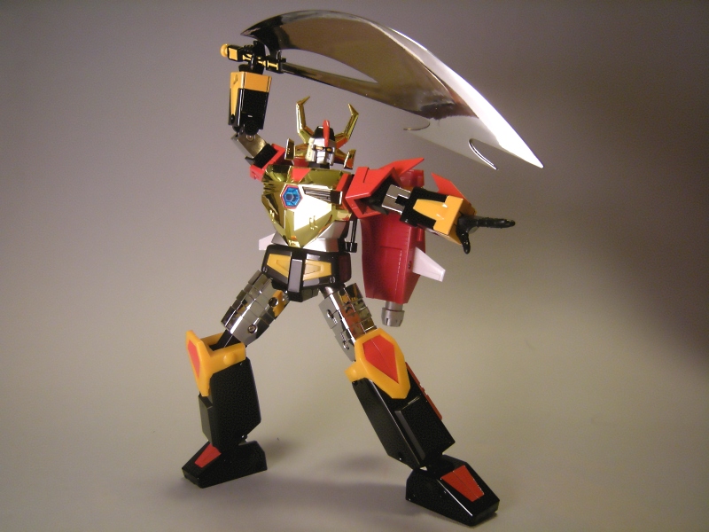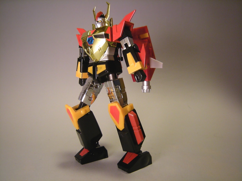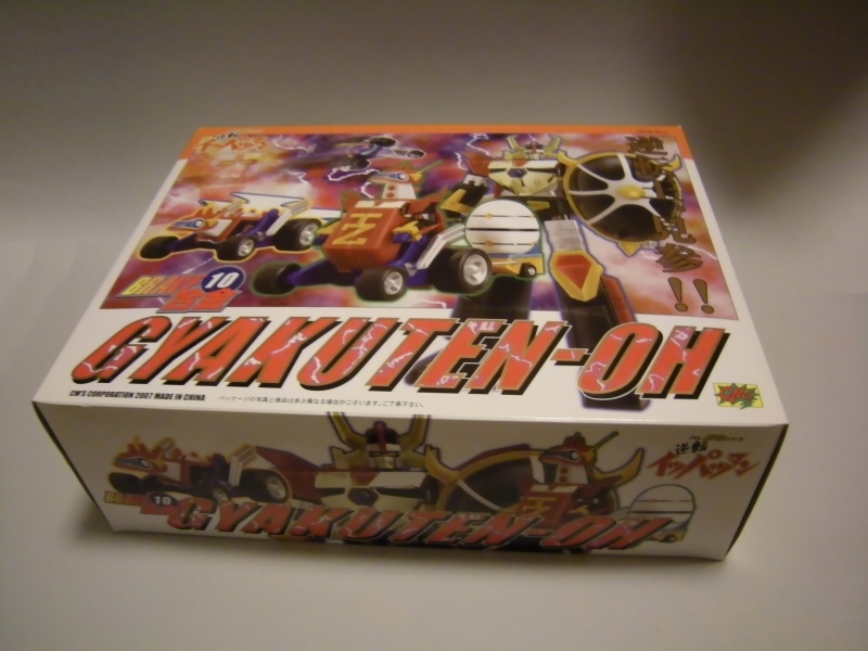 Gyakuten-Oh é il robot titolare della serie Gyakuten Ippatsuman del 1982, sesta incarnazione delle Time Bokan. Temporalmente segue direttamente Yattodetaman (in Italia Calendarman) e ne riprende alcuni schemi, come per l'appunto la presenza di un vero robot gigante dall'aspetto umanoide in luogo delle buffe macchine viste in Yattaman e gli altri. La serie ruota attorno alle vicende della compagnia Time Lease, che effettua consegne a domicilio in ogni dove e in ogni epoca, contrastata dalla compagnia avversaria Sharekobe Lease. Letteralmente Gyakuten-Oh significa "il re della rimonta". Rimonta va inteso col significato prettamente sportivo, difatti gyakuten indica il punto con cui si capovolgono le sorti di un incontro. Di questo robot fu la Takatoku a produrre all'epoca una versione standard e una deluxe - più altri mecha della serie -, mentre la sua incarnazione moderna dedicata al mercato dei collezionisti é opera di CM's Corporation, che lo include nella linea Brave Gokin assegnandogli il numero 10. Un dettaglio da fare notare é che CM’s si ispira idealmente proprio al modello della Takatoku per la colorazione, anche se non pedissequamente. Il torace del robot é color oro cromato in luogo del semplice giallo, ma corna e ginocchia non seguono lo schema del vintage. Il soggetto qui recensito é l’originale di settembre 2007. A questo sono seguiti il Metallic ad ottobre dello stesso anno e una ristampa nell’aprile 2009 (avente come extra una miniatura di metallo di Ippatsuman).
