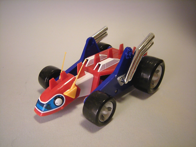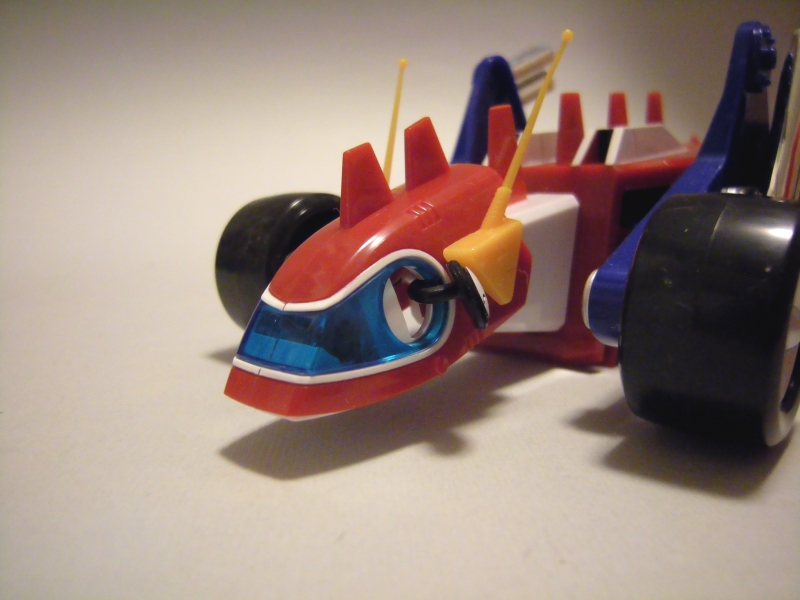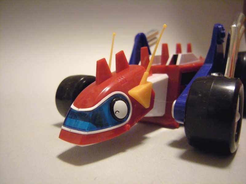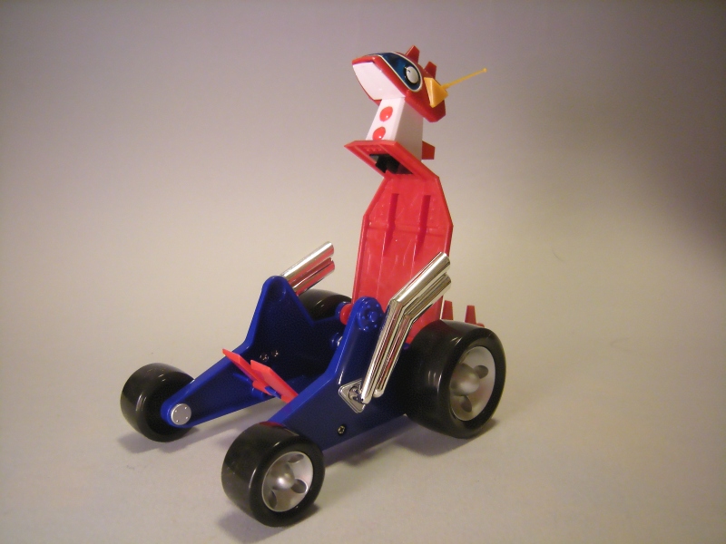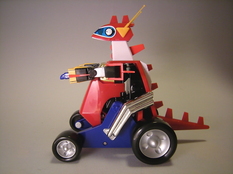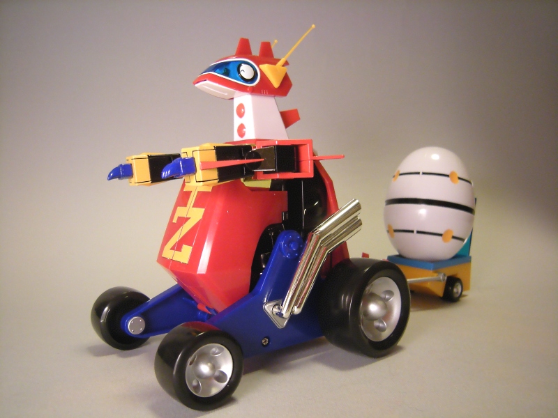 Tokkyu Saurus é il nome del mezzo sauriforme che il protagonista Go Sokkyu utilizza nel suo lavoro di consegne. In questo senso l'uovo che viene trainato dal mezzo non é niente altro che un container per la merce che viene trasportata. CM's per questo cargo ha realizzato un involucro completamente in plastica al cui interno va a incastrarsi la componente che diventerà il Gyakuten-Oh (questi quasi interamente di metallo). La lucertolona panciuta é un pezzo unico, e in questo senso l'unico movimento che può fare é scorrere sulle sue ruote, anch'esse in plastica dura. Le sue zampe sarebbero gli arti superiori del Gyakuten-Oh, quindi volendo possono essere mosse. La qualità della plastica utilizzata da CM's non é il massimo. Di buono va fatto notare che non si notano i segni di distacco dagli sprue, ma alla vista e al tatto appare come una plastica molto molto leggera e di non grande qualità. Il Tokkyu Saurus é dotato di due gimmik: 1) la bocca é apribile ed é possibile inserire al suo interno la scaletta per fare scendere il protagonista; 2) schiacciando il primo elemento della cresta del dinosauro, si aziona un movimento a scatto che apre di colpo gli occhi del robot, rivelando la cabina di pilotaggio dello stesso. Per quanto riguarda la conformazione Relief Don, per ottenerla é necessario estrarre dal corpo principale la componente del Gyakuten e quindi piegare semplicemente in avanti la schiena del soggetto e inserire al suo interno il Tokkyu Trailer. Inclinando quindi la testa verso l'alto si ottiene il suo aspetto finale.