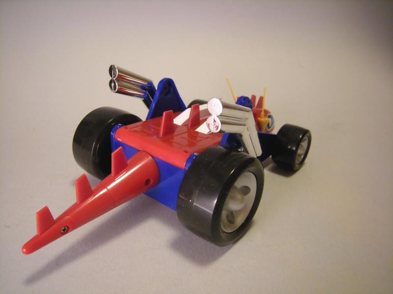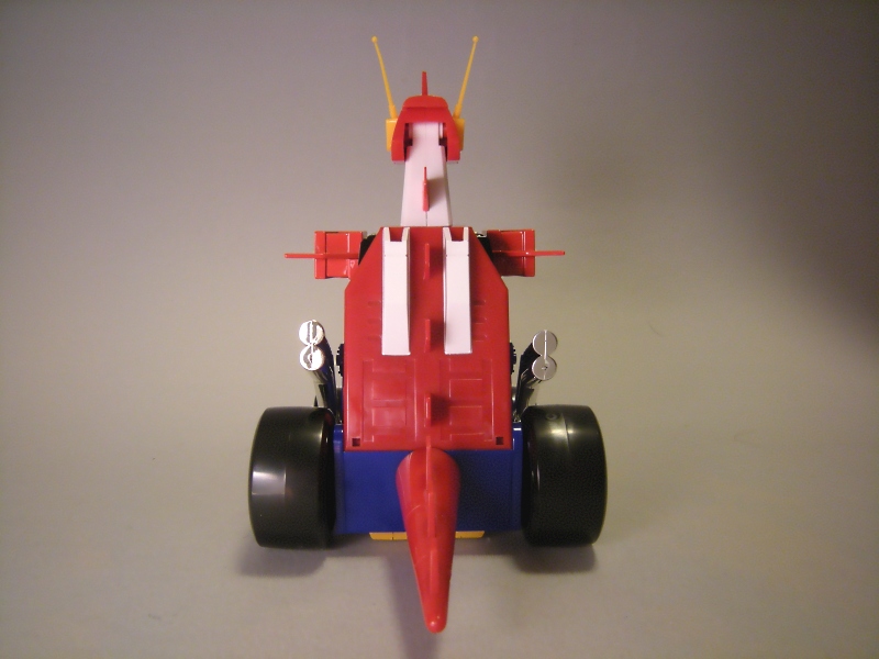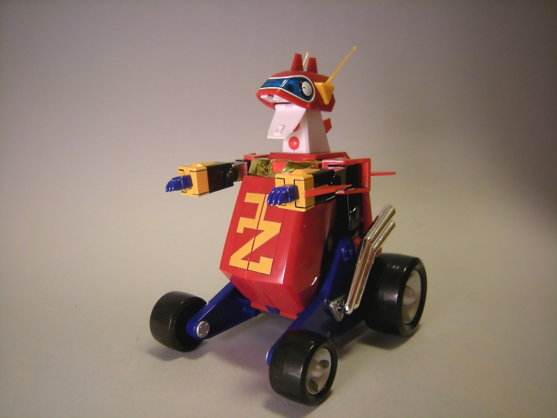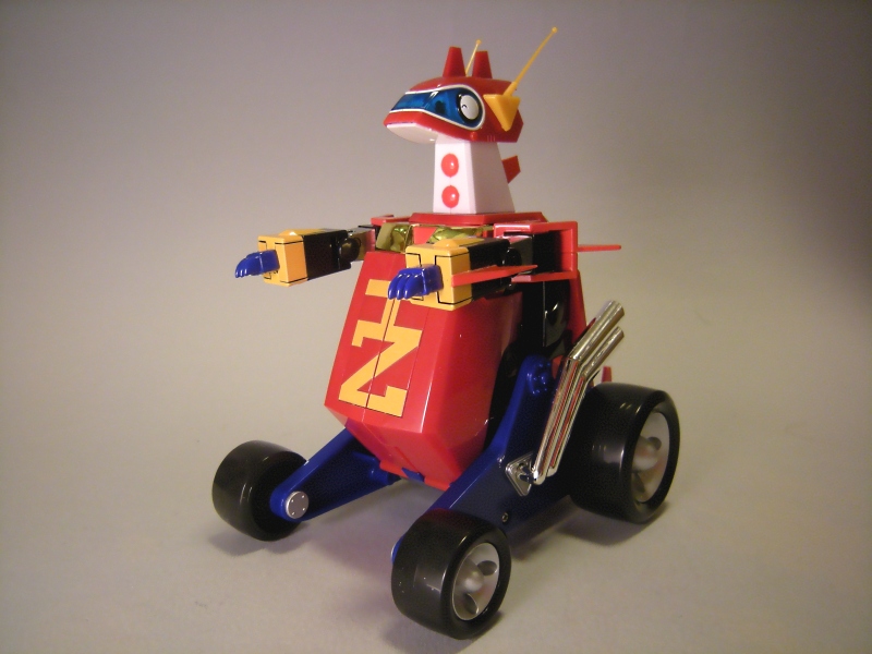 Il Gyakuten-Oh si ottiene tramite una semplice trasformazione del modulo centrale del Tokkyu Saurus e viene utilizzato da Go Sokkyu una volta trasformatosi in Ippatsuman. CM's per questa conformazione ha pensato a degli snodi semplici ma molto funzionali. Il fronte del Tokkyu Saurus presenta un disegno, che nell'anime originale scompariva al momento della trasformazione. Nel modellino la cosa é stata risolta utilizzando due pannelli ruotabili di 180 gradi. Quindi tutta la parte rossa viene fatta allargare e girata sulla schiena. Le gambe sono originariamente ripiegate all'indietro - un po' come per il Daikyojin/King Star in versione Sagittario - e vanno raddrizzate. Le braccia vanno abbassate. La componente della testa invece é un'astronavina a parte che raggiunge il robot al termine della sua trasformazione. Le mani del robot compaiono a seguito di una rotazione dei polsi. Difatti i lati delle braccia sono apribili, permettendo quindi alle zampe del Tokkyu Saurus di ruotare all'interno dello stesso avambraccio rivelando i pugni del robot a seguito del movimento di rotazione. Si tratta di un gimmick semplice e ad effetto, tuttavia lo spazio all'interno dell'avambraccio é molto risicato percui operare questo tipo di trasformazione può risultare più laborioso di quanto non sembri. A questo punto é preferibile staccare direttamente le zampe del dinosauro e inserire i pugni al loro posto.
