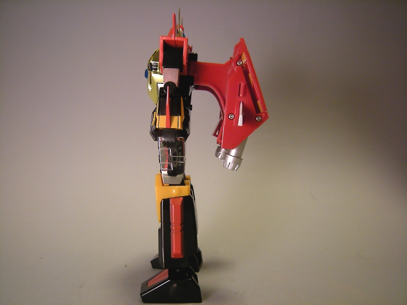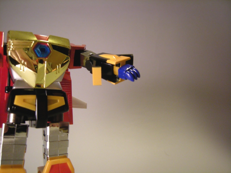 L'argomento pugni merita una digressione. Nella confezione sono contenuti due pugni chiusi (montati direttamente sul robot) due mani aperte con dita distese, due mani prensili con movimeno alle nocche e una mano destra posizionata nel gesto di afferrare un fucile, con tanto di dito indice disposto per il grilletto. La sostituzione delle varie mani può non essere velocissima dato che l'aggancio a sfera del polso si trova sull'asse di rotazione per la scomparsa delle mani all'interno dell'avambraccio. Percui può capitare che spingendo sulla sfera questi scivoli via invece di accogliere la mano. La versione per il fucile é ben fatta, senonché il Gyakuten-Oh non ha questo tipo di arma nel suo arsenale. Le mani prensili invece hanno il problema di avere un semplice snodo ad attrito che... fa poca presa. Nelle foto a corredo di questo articolo é stata utilizzata la versione da fucile per impugnare la spada.