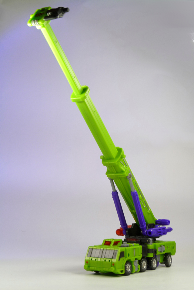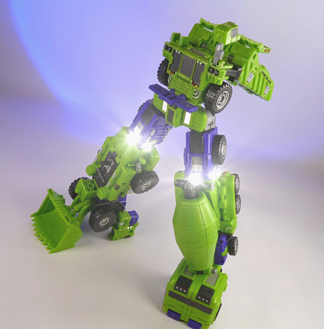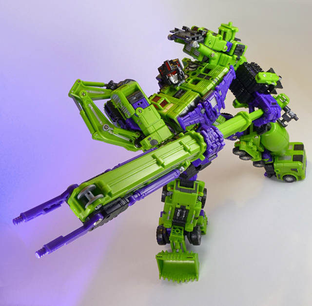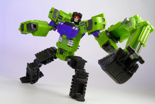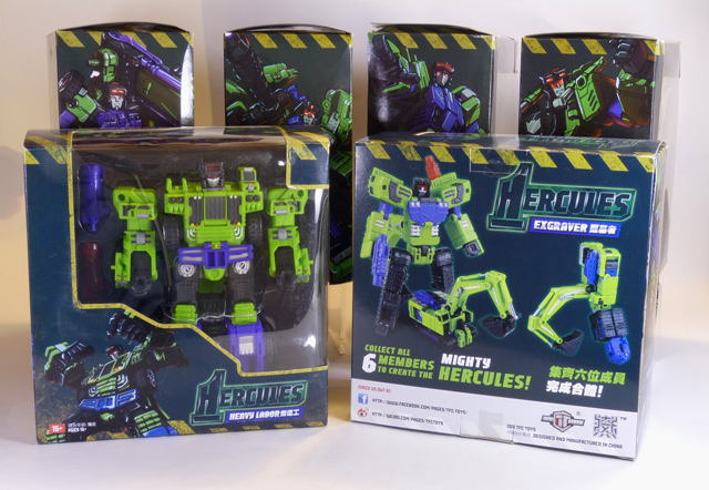 Due premesse prima di procedere: qui, purtroppo, non parliamo di Takara e di un suo ad oggi latitante Masterpiece Devastator, bensì di TFC Toys e del suo mastodontico Hercules. In pratica, una ditta di talentuosi appassionati orientali che non detiene diritti sui Transformers ha partorito un modello che si rifà al personaggio originale, ma NON lo è ufficialmente. Tuttavia, nomi nuovi, assenza del logo Decepticon e pesanti quanto inevitabili variazioni dal design televisivo non riescono a minare completamente la grande appetibilità del prodotto, che rimane comunque immediatamente riconoscibile e riconducibile all’originale G1 per distribuzione dei colori, componenti e tipologia dei mezzi da cantiere, nonché probabilmente ispirato alle linee adulte del fumetto All Hail Megatron disegnato da Guido Guidi. Ma qui si ferma la mia conoscenza in materia, per altri rimandi estetici vi invito ad osservare le foto di corredo all’articolo per farvi un’idea.