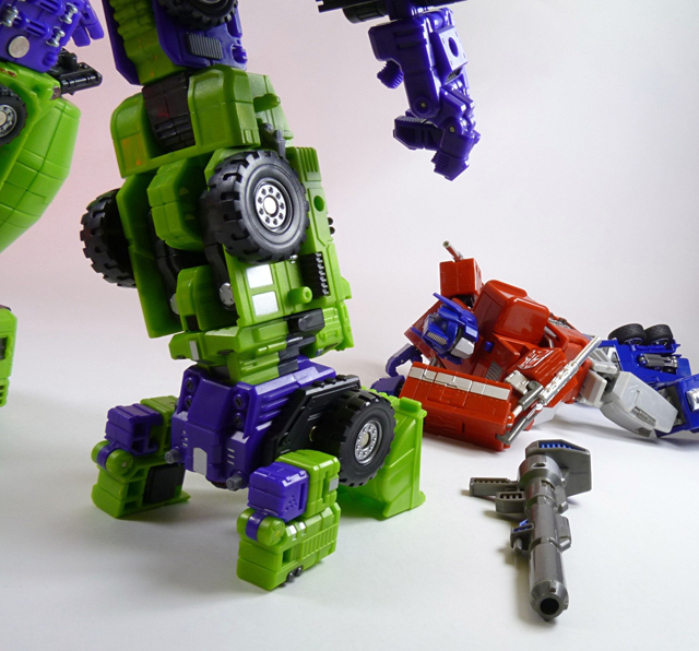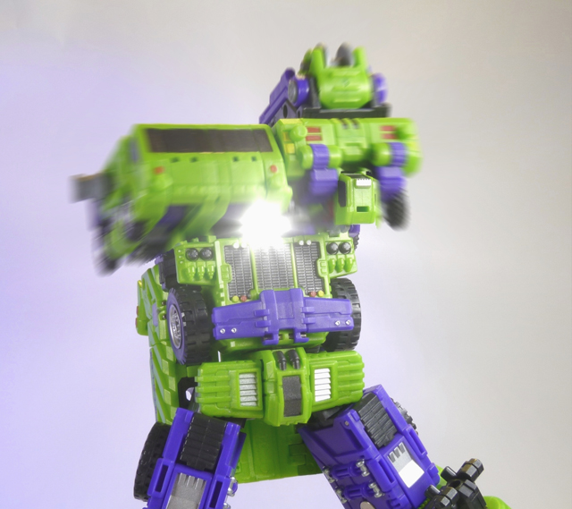 Grande sorpresa, almeno per quanto mi riguarda, è stata la posabilità del gigante: a riprova del fatto che TFC ha pensato in prima istanza all’Hercules assemblato, ci troviamo davanti ad un mecha di 35 cm che è pure stabile ed efficacemente snodato a tutti i livelli: la testa gode della presenza di un snodo sferico, piuttosto funzionale; le braccia godono di movimenti discreti seppur limitati in estensione laterale, gli avambracci hanno grandi possibilità di rotazione e piega a 90°, mentre le mani, godendo delle importanti dimensioni, sono completamente articolate a livello delle singole falangi e dei polsi; il bacino potrebbe sfruttare il medesimo snodo in dotazione a Heavy Labor per essere ruotato, ma, a seguito di tutte le trasformazioni necessarie i risultati sono molto più modesti; buona l’estensione e la possibilità di rotazione e avanzamento delle cosce, così come la piega possibile a livello delle ginocchia (90°), come anche apprezzabili le capacità di movimento delle caviglie. Considerate le manie di grandezza, il lavoro svolto sulle articolazioni è stato sicuramente buono, con una preponderanza di indispensabili snodi a scatto, che tuttavia nel mio esemplare in un paio di punti non sono regolati uniformemente (es: il ginocchio destro tiene la posa meglio del sinistro). Notevole anche la stabilità generale, anche se non eccezionale nelle pose più dinamiche, cosa comunque da mettere in preventivo in un modello enorme e con un baricentro abbastanza alto dovuto alle esigenze di trasformabilità.