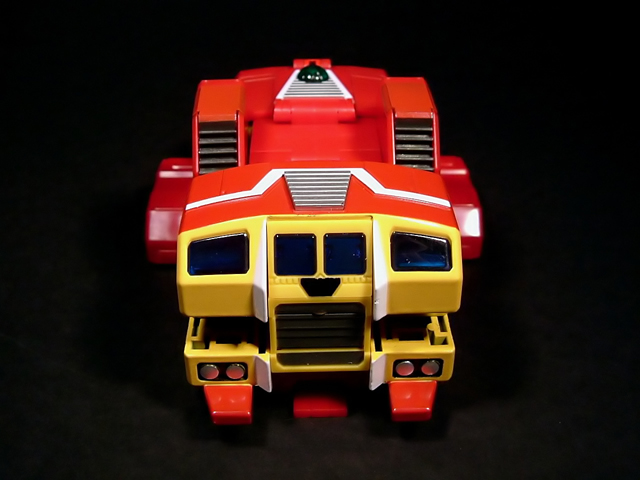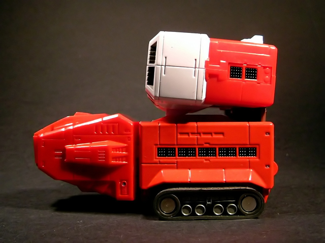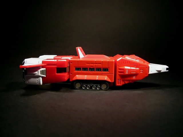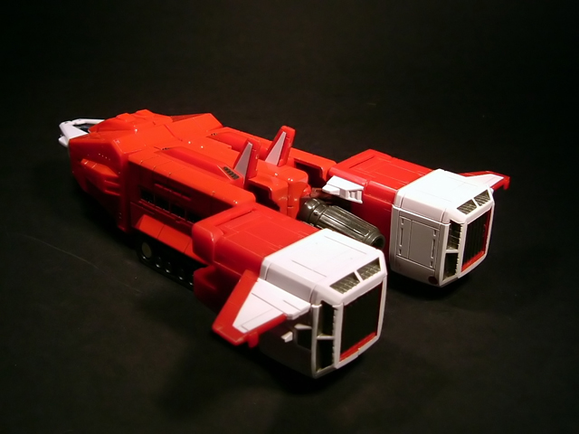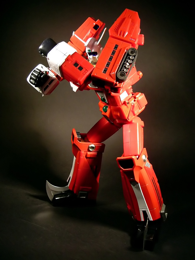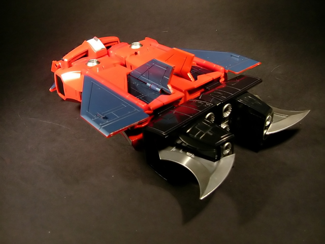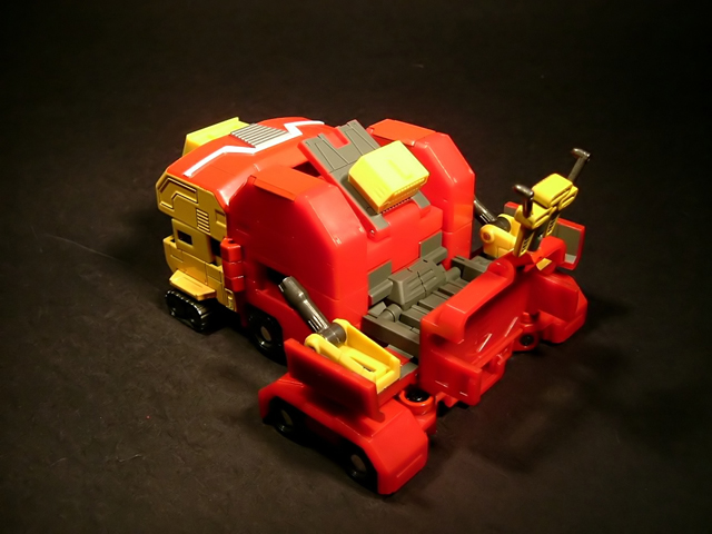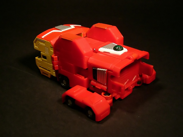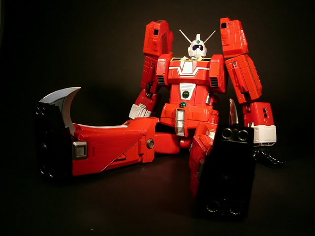 - Mecha C (Ideon Buster il modulo aereo, Sol Conver quello terrestre): costituisce bacino e arti inferiori del gokin ed è in assoluto l'elemento più pesante dei tre, addirittura 852 grammi. E' stupefacente la sensazione di pesantezza che trasmette non appena lo si soppesa. Bellissimo come aereo (dei 3 mecha e delle conformazioni possibili è in assoluto il mio preferito), è facilmente trasformabile nel mezzo terrestre. Ho trovato stupendi gli alettoni dorsali e laterali che, ripiegati gli uni sugli altri, si vanno ad alloggiare nell'interno della gamba, lo stesso dicasi per i reattori estraibili a rotazione sotto la punta dei piedi e per le ruote posteriori del Sol Conver estraibili dallo spigolo postero-laterale delle gambe dove, una volta ripiegate, non danno alcun segno della loro presenza. Carini anche i cannoni estraibili attraverso la rotazione del logo al centro del bacino.