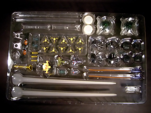 - Grande blister di plastica trasparente contenente: 4 paia di mani (un paio con falangi snodate per l'impugnatura dell'Ideon Gun, un paio di pugni chiusi, un paio a dita aperte ed estese ed un paio a dita semiflesse), 10 Jyong (i piccoli mecha aracniformi), 2 Gadakka (i camminatori meccanici a due gambe) con le relative basette, 2 cavetti per il collegamento dell'Ideon Gun all'addome del robot, 2 placchette intercambiabili applicabili sull'addome (una per l'agganciamento dei cavi dell'Ideon Gun e una per la simulazione del mini black hole cannon), un carro armato, 3 piccole astronavi di cui ignoro il nome (di colore giallo, viola e verde militare rispettivamente, le prime due delle quali appartenenenti ai mecha avversari), una piccola appendice da applicare alla punta dell'astronave viola, 3 aste piccole e una più lunga di colore giallo da fissare sulla basetta per l'esposizione delle astronavi e dell'Ideon Gun, un perno di plastica trasparente da applicare anch'esso sulla basetta per l'esposizione dell'Ideon Gun, le due grandi Ideon Swords e due tappi copripugni per la loro applicazione nonchè due basette rotonde (riproducenti il logo di Ideon) e due aste con tre sostegni di plastica trasparente e lunghezza variabile applicabili su di esse per dare loro sostegno.