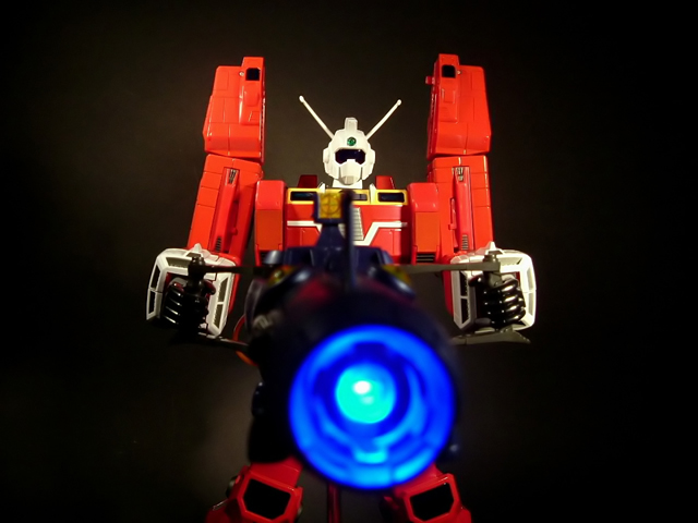 Imponente è dire poco, stiamo parlando del soc in assoluto più alto sinora prodotto, per la precisione 28 cm per l'invidiabilissimo peso di 1390 grammi. Tale peso, come detto, si concentra per gran parte a livello delle gambe garantendo grande stabilità ad un gokin che, data l'altezza, richiedeva giustamente di essere ben ancorato a terra. ll metallo si localizza in corrispondenza di gambe, bacino, torace e braccia. Sono invece di plastica i piedi, le cosce, l'addome, le spalle, gli avambracci e la testa. Nonostante le ragguardevoli dimensioni e la monocromaticità del soggetto che potrebbero trasmettere la sgradevole sensazione di "giocattolone", la cura del dettaglio messa da Bandai nella verniciatura ma soprattutto nella riproduzione di abbondanti pannellature su tutto il modello così da spezzarne la monotonia, sono riuscite a scongiurare questo rischio, il tutto mantenendo una invidiabile attinenza alla controparte animata. La verniciatura è quindi generalmente buona, priva di particolari difetti, ma dispiace che la differenza nella tonalità di rosso tra parti in plastica e parti in metallo sia abbastanza evidente (più in foto che non ad occhio nudo ad onor del vero). L'operazione di assemblaggio richiede pochi secondi visto che i mecha sono praticamente già confezionati in conformazione pronta per l'agganciamento. E' sufficiente estrarre le cosce dal modulo C, operazione che all'inizio può davvero terrorizzare l'ignaro collezionista visto che è necessaria una notevole forza per effettuare questa manovra, con l'ovvio timore di rompere il modello appena acquistato. Nessuna paura quindi, tirate con forza, è un soc resistente e dopo aver estratto le cosce per la prima volta (deve fare due scatti) l'operazione diverrà via via più agevole. Anche il rientro delle cosce nelle gambe inizialmente può non essere così facile, in questo caso è sufficiente un piccolo trucco: mentre spingete le cosce dentro alla gamba direzionate la vostra pressione verso la parte posteriore dell'articolazione del ginocchio, la parte rientrerà senza alcun problema. Si potrebbe credere che un oggetto così grande possa soffrire di una certa staticità: niente di più sbagliato! Il nostro Ideon ha una notevole posabilità data la sufficiente inclinazione delle caviglie e la discreta flessione delle ginocchia (a scatto), il tutto a fronte di una buona stabilità. A livello del bacino è stato inserito uno snodo localizzato posteriormente che altro non è che la logica evoluzione dell'analogo snodo introdotto nel gx-24. La parziale estrazione, a questo livello, consente l'estensione e la flessione estrema delle cosce e la possibilità di mettere il nostro bel gokin tranquillamente seduto simulando in questo modo il sollevamento del robot dopo l'unione dei moduli (che non si agganciavano in volo per cui il robot si assemblava da disteso). A favorire la naturalezza della posa seduta, la possibilità di rotazione delle cosce sull'asse longitudinale. Anche l'abduzione a livello di anca si può considerare più che buona. Il tronco è un blocco unico, privo di snodi per ovvie ragioni di trasformabilità. Le spalle sono dotate di articolazioni a scatto ed hanno ampia escursione e gli elementi che le sormontano sono in parte mobili e indipendenti perchè ancorati al braccio esternamente a tutto vantaggio della mobilità di questi segmenti. I gomiti, per ragioni legate alla convertibilità del modulo A, sono in parte estraibili potendo flettersi a 180 gradi. Gli avambracci sono ruotabili rispetto alle braccia. La testa ruota a 360 gradi con flessione-estensione quasi nulla. Riguardo alla testa c'è da dire che non è infrequente trovare modelli con antenne modestamente piegate, questo anche perchè, nonostante siano rientrabili nella testa, possono leggermente incurvarsi nella trasformazione in modulo A. La cosa non deve però preoccupare visto che sono state realizzate in plastica semirigida per cui possono essere tranquillamente piegate in senso opposto per fargli riassumere un aspetto rettilineo senza rischi di rottura. Passiamo ora per un attimo agli accessori. Complessivamente considero soddisfacente il numero di mani in dotazione (4 paia) ma ancor più soddisfacenti sono tutta quella serie di piccoli mecha come gli Jyong, i Gadakka e le astronavi che arricchiscono il modello peraltro con una cura del dettaglio davvero notevole a discapito di dimensioni particolarmente contenute. Ovviamente, però, tra tutti gli extra che Bandai ha messo a disposizione di questo gx-36, quello che spicca sugli altri è l'Ideon Gun: interamente in plastica, è davvero enorme e suggestivo quando illuminato dal momento che grazie a 3 batterie (LR44) già in dotazione può essere acceso con un apposito interruttore e con la possibilità di simulare lo sparo applicando sulla bocca di fuoco una delle Ideon Swords attraverso la trasmissione del bel fascio di luce azzurra all'interno di essa. Le Ideon Swords (due specie di fasci di luce che fuoriescono dalle mani del robot) vanno a completare l'armamentario del robot rappresentando però, date le dimensioni e la cronica carenza di spazio nelle nostre collezioni, un accessorio con cui il modello difficilmente potrà essere esposto date le ragguardevoli dimensioni e tutto il complesso sistema di sostegni che il loro impiego richiede. La basetta, in linea con quasi tutti i componibili Bandai, non è stata concepita per esporre il robot, ma per dare supporto agli accessori e, con un tocco di classe, è stata ideata riproducendo, con analoghi forma e colori, il ponte di comando della Solo Ship. Ha il fondo apribile così da alloggiare al suo interno le mani del modello e fornisce supporto all'Ideon Gun ed alle astronavi.