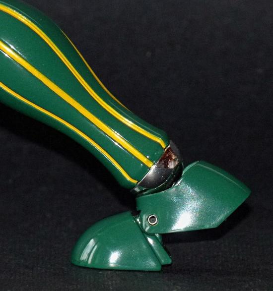 Gli arti inferiori sono due bei blocchetti di zama, anche qui lo sculpt di queste parti curve e corpose mi è piaciuto parecchio, così come due interessanti dettagli tecnici: lo snodo a sfera calamitato da unire al bacino è spostabile in avanti di quei 3-4 mm sufficienti per creare pose più dinamiche senza far cozzare troppo facilmente l’arto con le parti superiori; sempre per ricreare l’effetto attrito, la sfera al livello del ginocchio ruota scivolando all’interno di una semi-coppa, colorata in tinta acciaio metalizzato con l’intenzione di nasconderla se ci si appoggia lo sguardo (al contrario di ciò che si era visto nei prototipi, meno male!). Appena sopra la coppetta, all’interno della coscia abbiamo in addizione anche uno snodo a scatto, e bisogna ammettere che il lavoro ingegneristico per garantire dinamicità al modello è davvero notevole e non scontato. Passando ai piedi, anche qui naturalmente calamita, con sfera parzialmente sagomata per bloccare movimenti indesiderati, e abbiamo anche una pianta del piede inclinabile rispetto al tallone. La suola è intelligentemente gommata, quindi posto su di una superficie adeguata il piede non scivolerà troppo facilmente. Avevo il dentino avvelenato con CM’S per la resa estetica di questi bei piedini (a cui sono stati giustamente affibbiati nomignoli abbastanza coloriti come “scarpette ortopediche” e via discorrendo…), ma devo ammettere che dal vivo il difetto è molto ridimensionato, o almeno questa è la mia sensazione, e probabilmente si integrano in modo passabile con un soggetto più antropomorfo di altri come il nostro Jeeg.