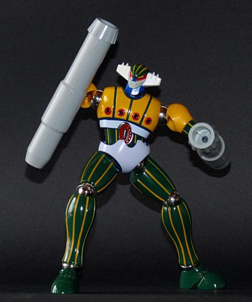 Il resto degli accessori non è caratterizzato da una particolare qualità: i bazooka sono proprio piatti quanto a dettaglio, le trivelle hanno una strana colorazione cromata che non si integra granchè bene con le altre tinte del modello, gli scudi rotanti sono pesanti e tendono a staccarsi troppo facilmente dagli avambracci, a causa di un perno ad incastro troppo piccolo. Ma nel complesso, sono fedeli e riconoscibili, garantiscono una vastissima gamma di possibilità e c’è di che sbizzarrirsi. Assenti invece astro componenti e componenti subacquei (e anche il Big Shooter): se ne sentite la mancanza potreste anche chiedervi come mai siano stati inseriti invece ben due bazooka o due lance… probabilmente creare altri appositi stampi avrebbe fatto lievitare ulteriormente il prezzo. Le miniature di Hiroshi sono un simpatico bonus, si possono agganciare alla seconda testa disponibile e con una semplice trasformazione il nostro cyborg simulerà il morphing che si vedeva in tv… peccato che le miniature si facciano letteralmente a pezzi appena si comincia a manipolarle, e che la resa estetica della faccia trasformata sia discutibile, con solchi, cavità ed elementi a vista che andavano coperti. Ma ripeto, come simpatica ciliegina in aggiunta a tutto il resto può starci, anche se la realizzazione è quella che è.